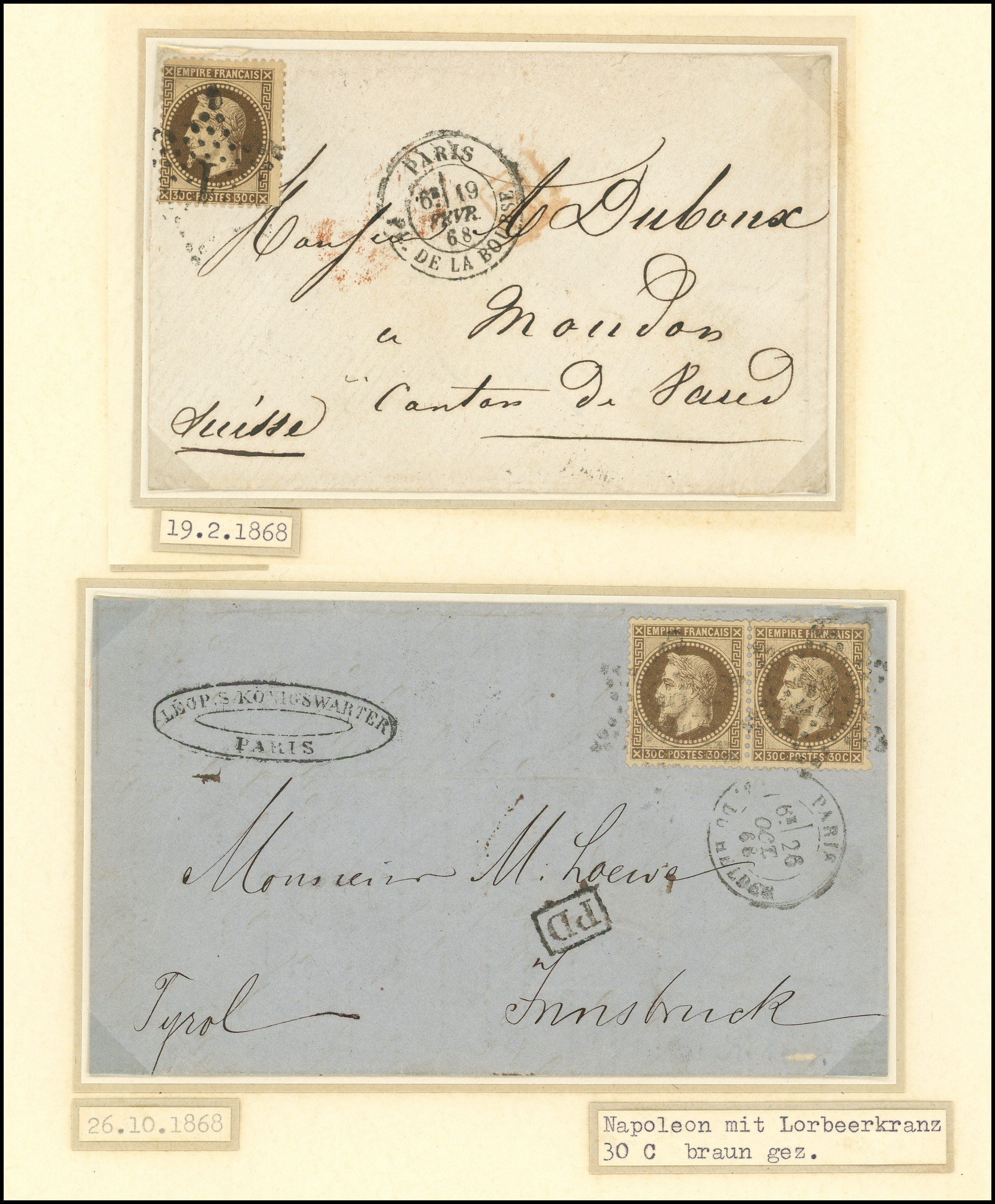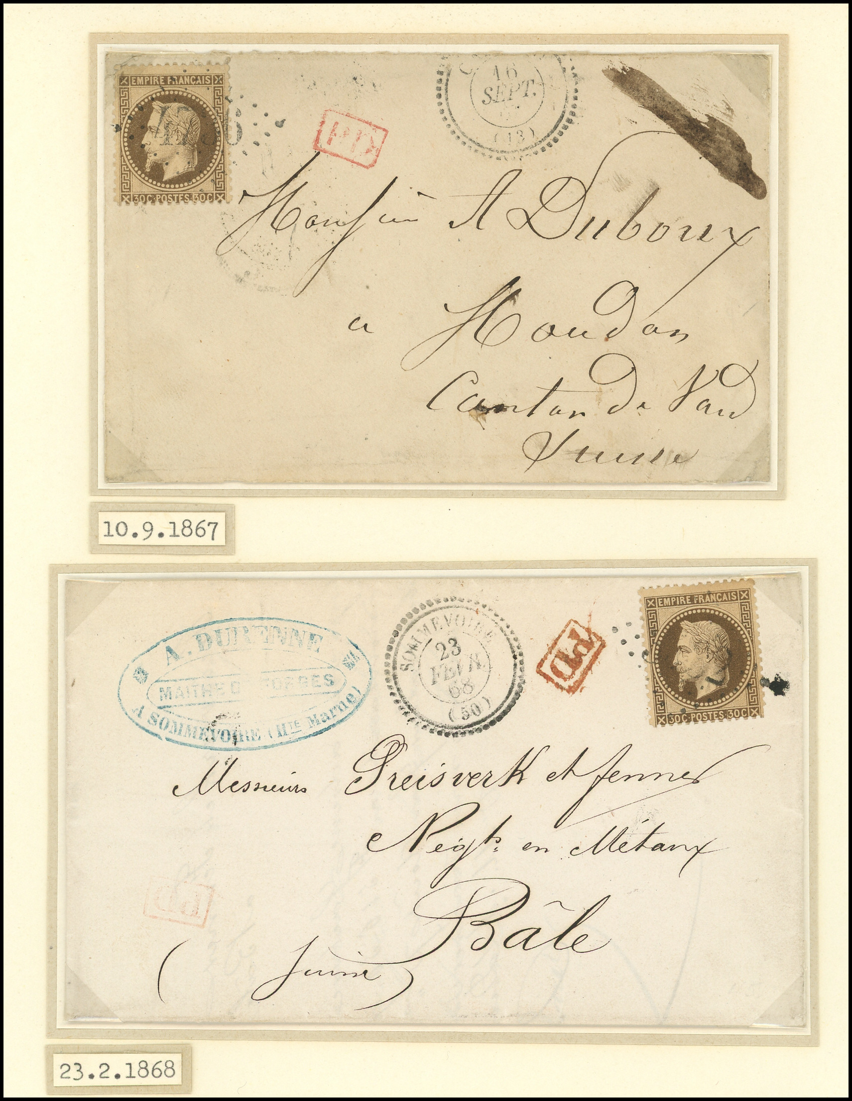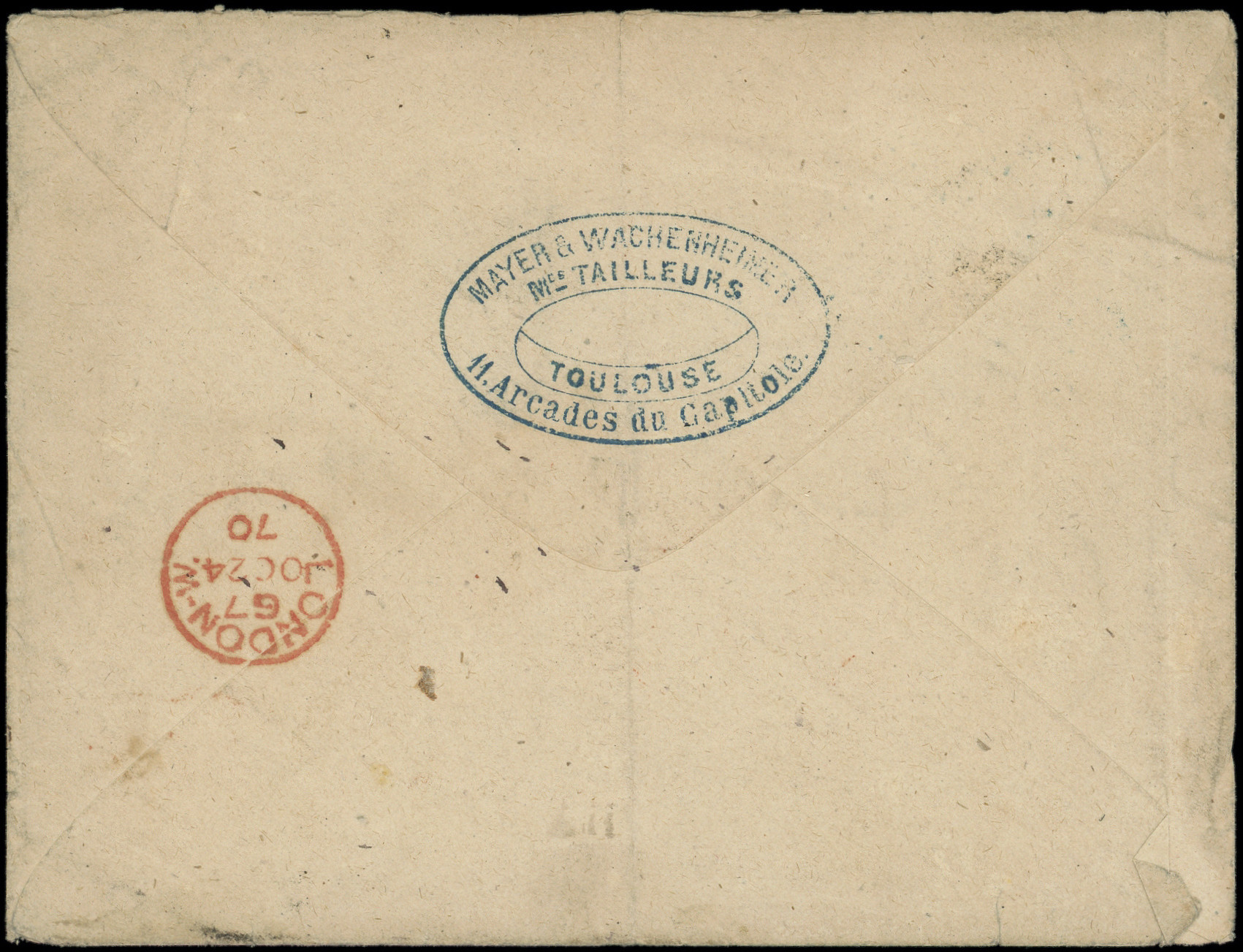 obl. càd R. du Pont Neuf 27/1/68 s. bande d'envoi CHARGE avec au verso cachet du Tribunal Civil de la Seine, réexpédiée au HAVRE avec N°28 obl. du càd T1373 (cat. Rochette Pothion) en ROUGE 28/1/68. Oblitération RARISSIME SUR le timbre, arr. 29/1 et