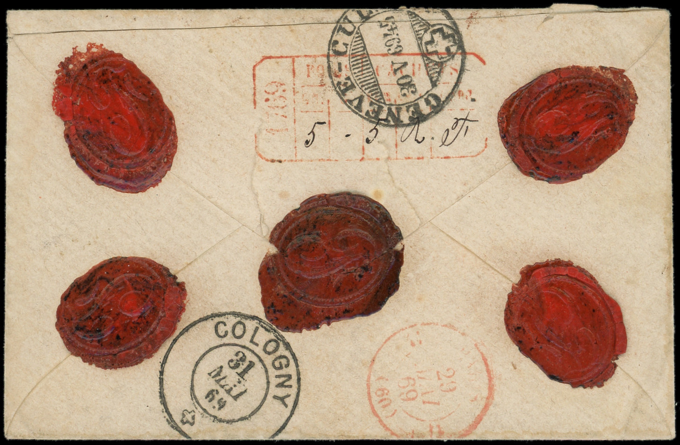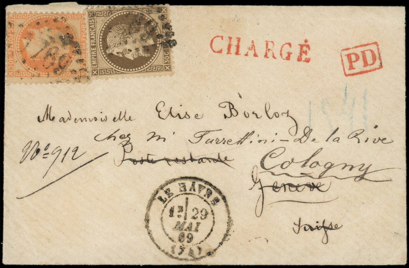 40c. obl. GC 1769 s. Env. CHARGE, càd T17 LE HAVRE 29/5/69, arr. GENEVE 30/5 puis COLOGNY 31/5, TTB (Image) (Image2)