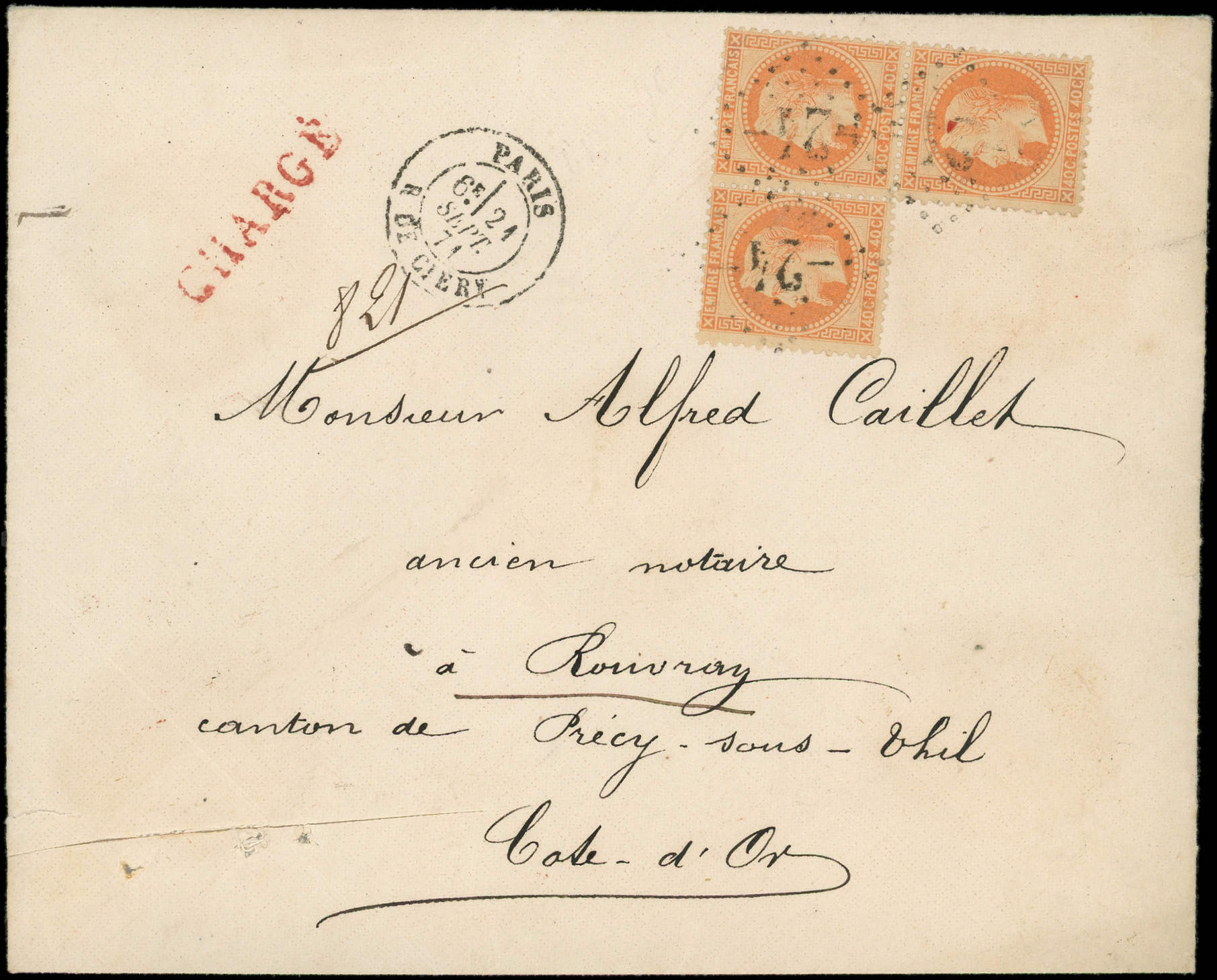 BLOC de 3 obl. GC 24 s. Env. CHARGE, càd R. de Cléry 21/9/71, TTB (Image)