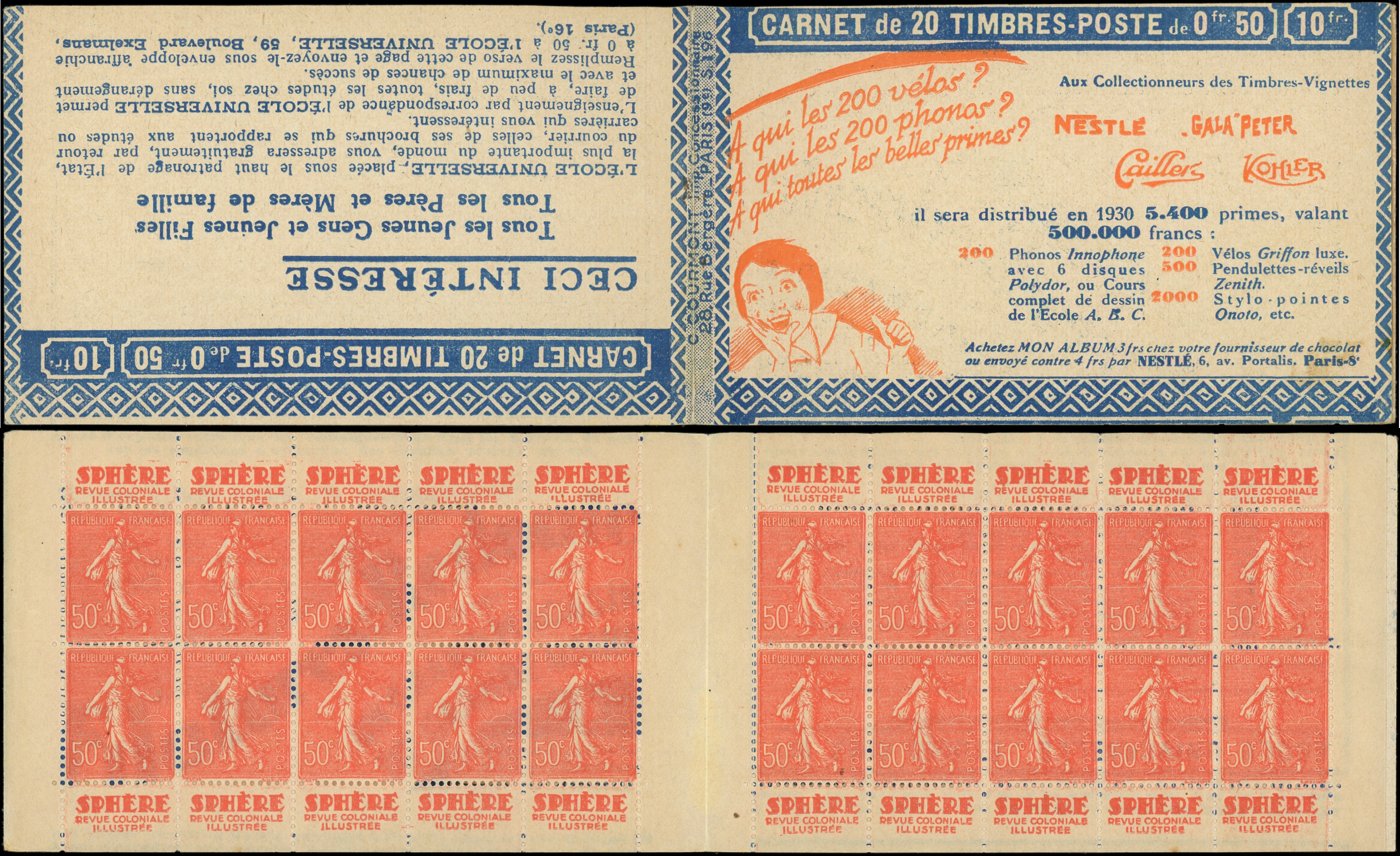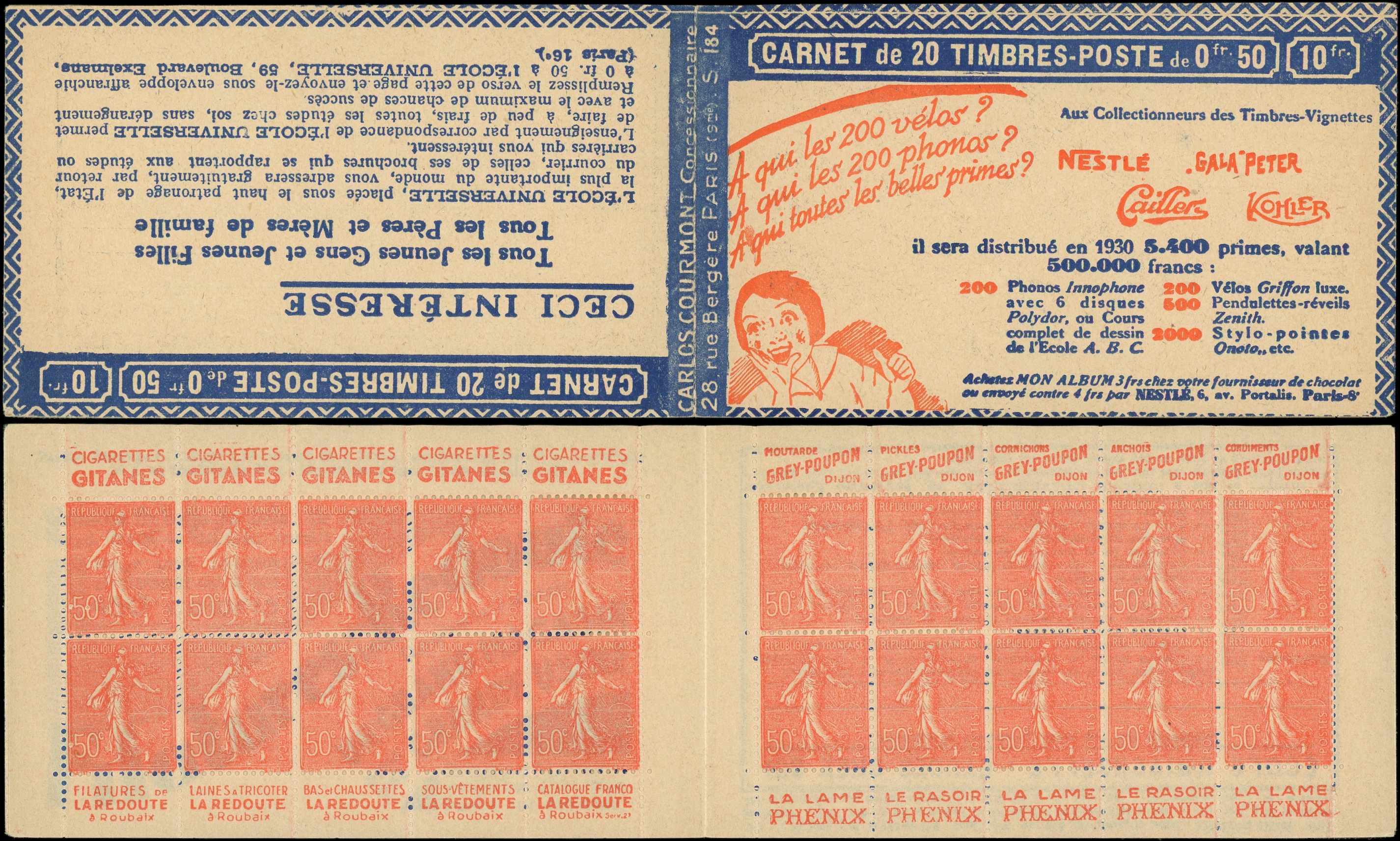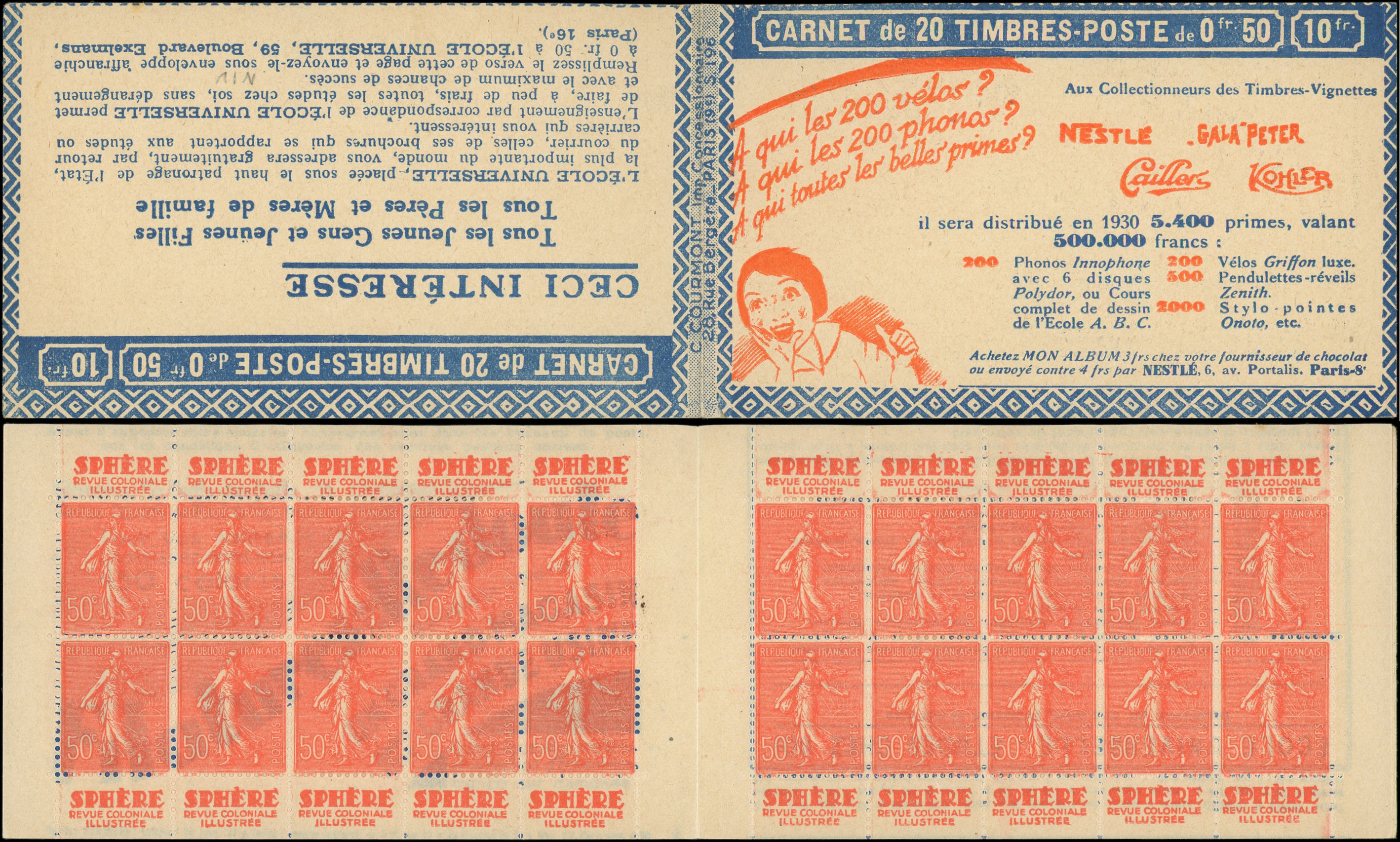 8938A 199 image199-C58a Semeuse Lignée, 50c. rouge, n°199j, T IV, S. 178, TSF, 12 ex. NON imprimés, 8 ex. impr. défse, 1 ex. adh., ch. sur couv., RR et TB (Image)