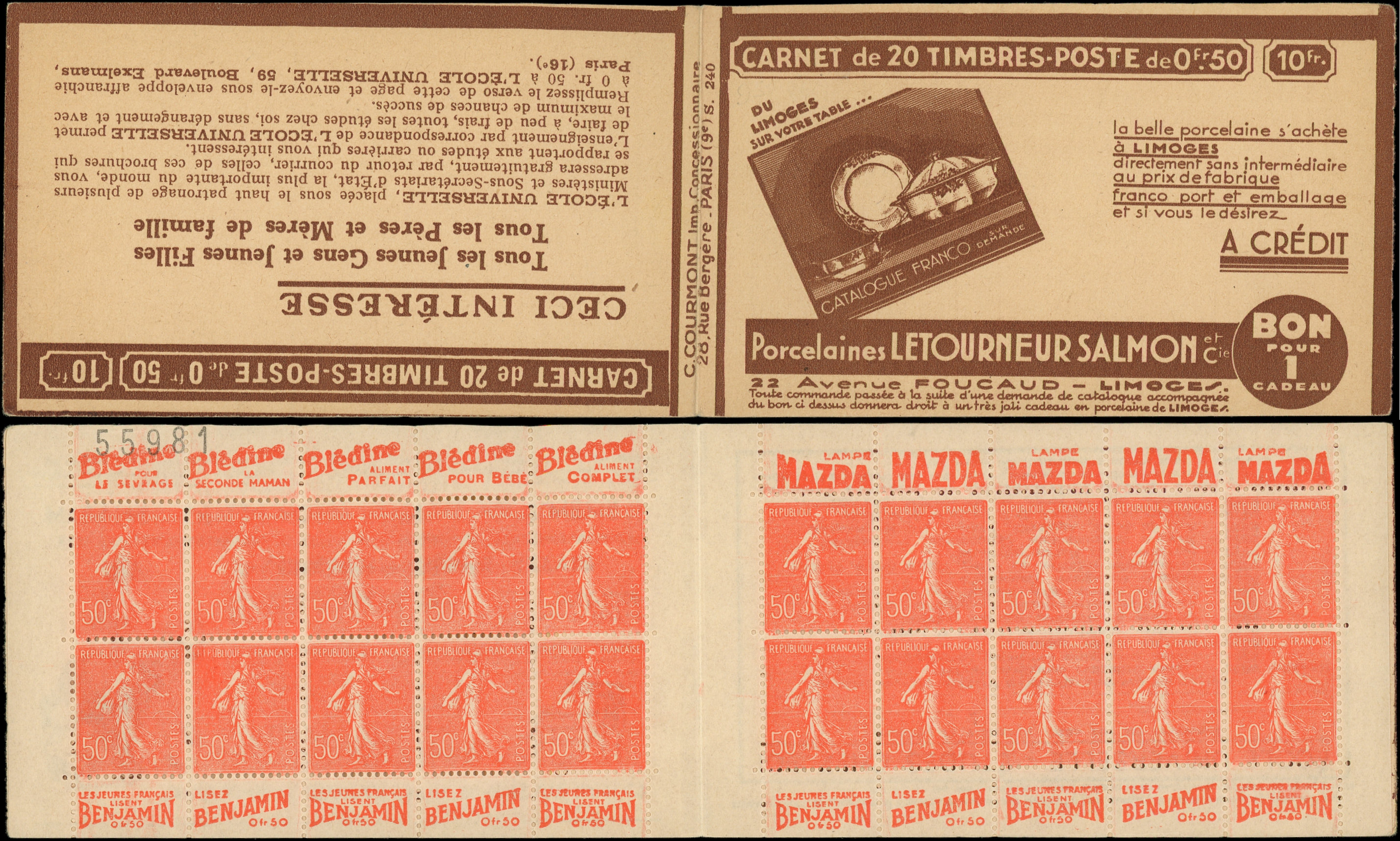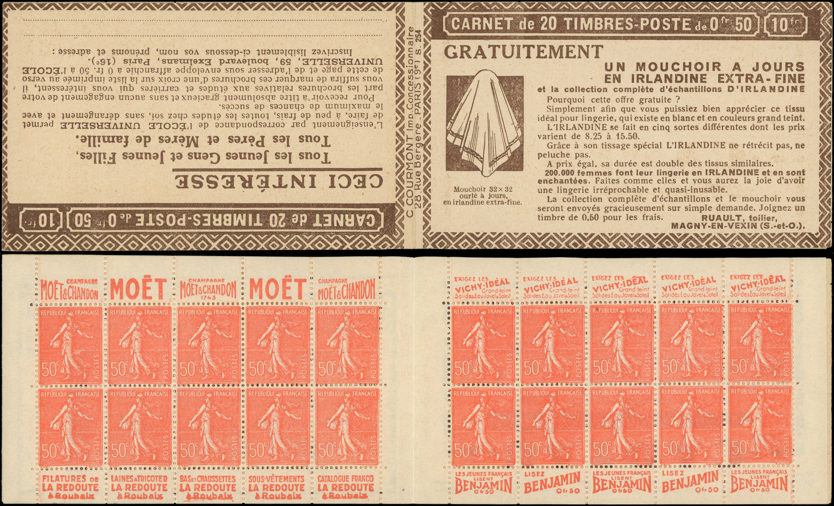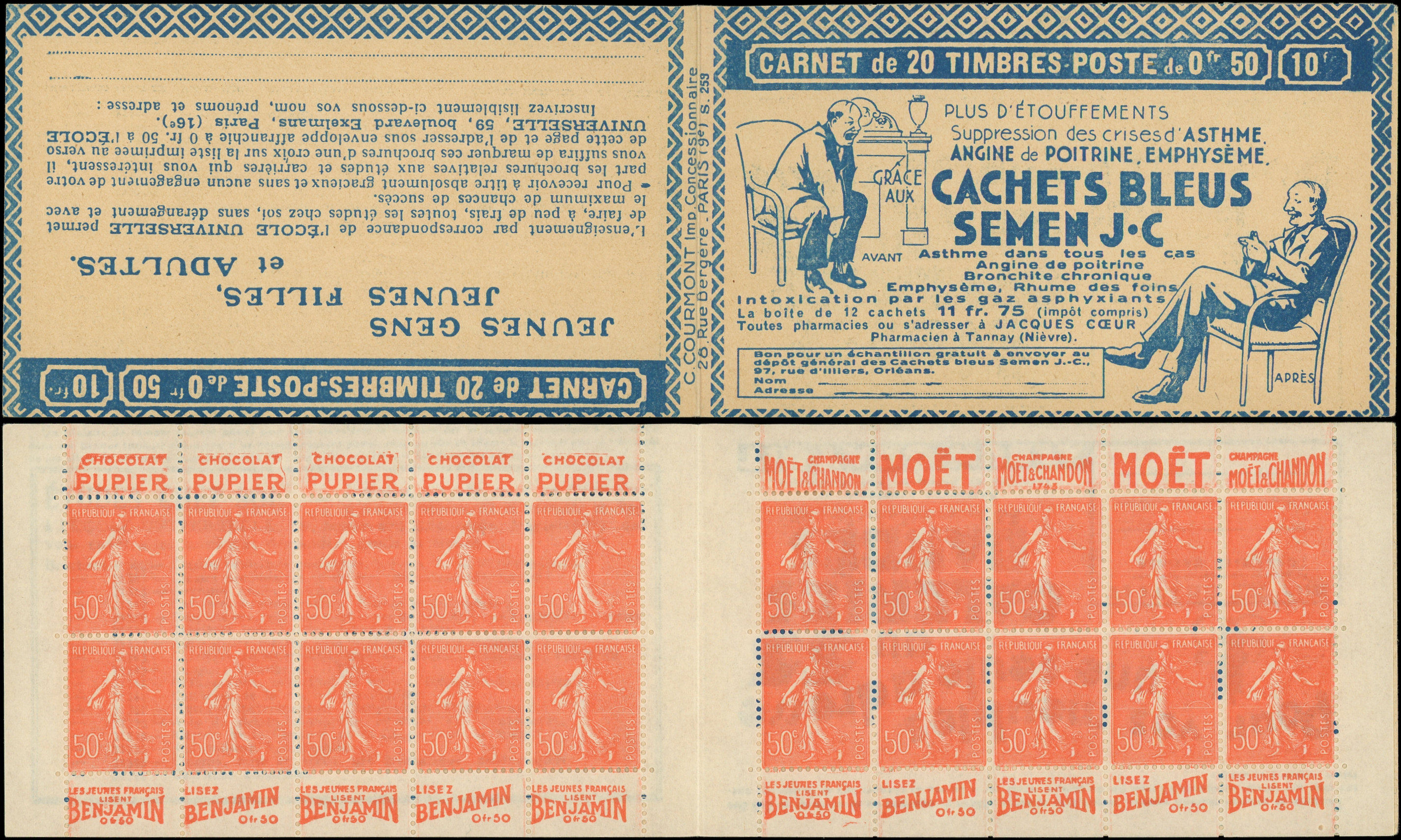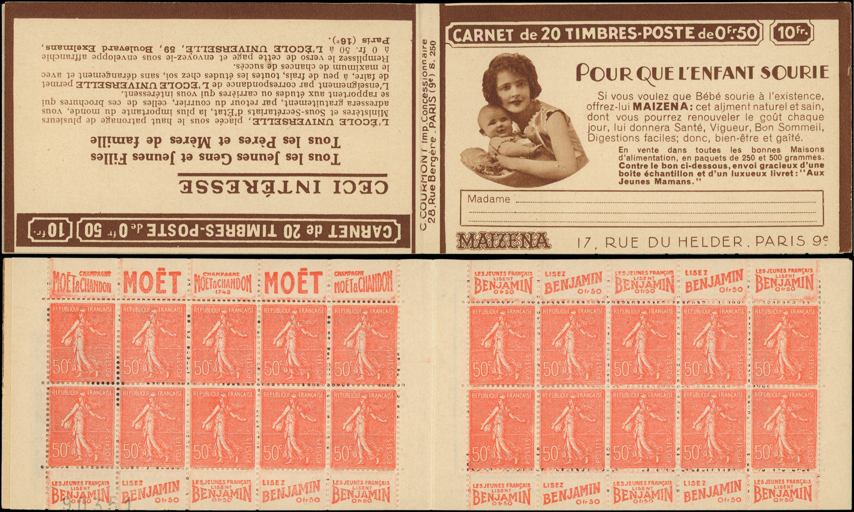 8957 199 image199-C71 Semeuse Lignée, 50c. rouge, n°199a, T IIA, S. 250, MAIZENA, adh. de couv. et amorce de découpe entre 2 ex., sinon TB (Image)