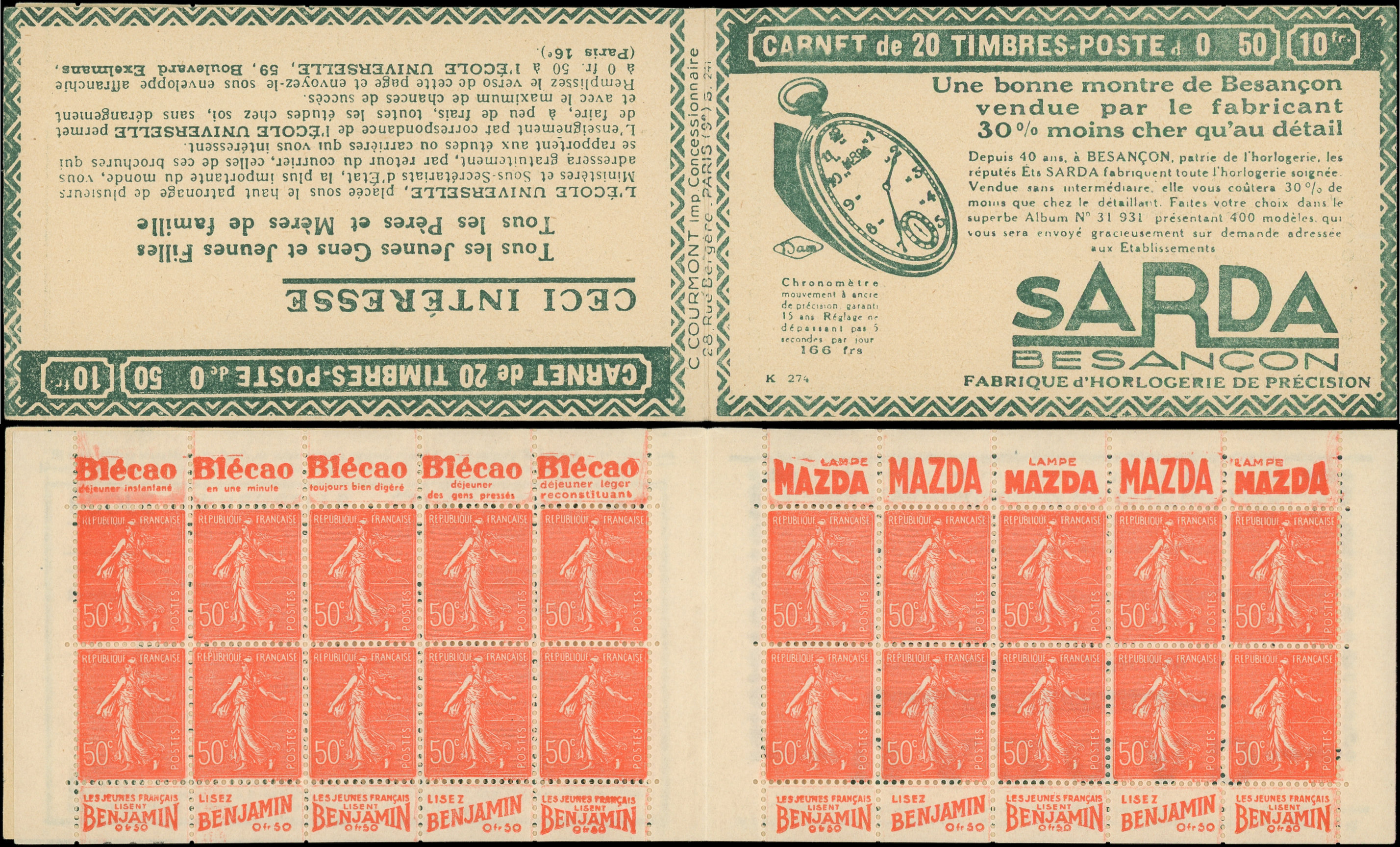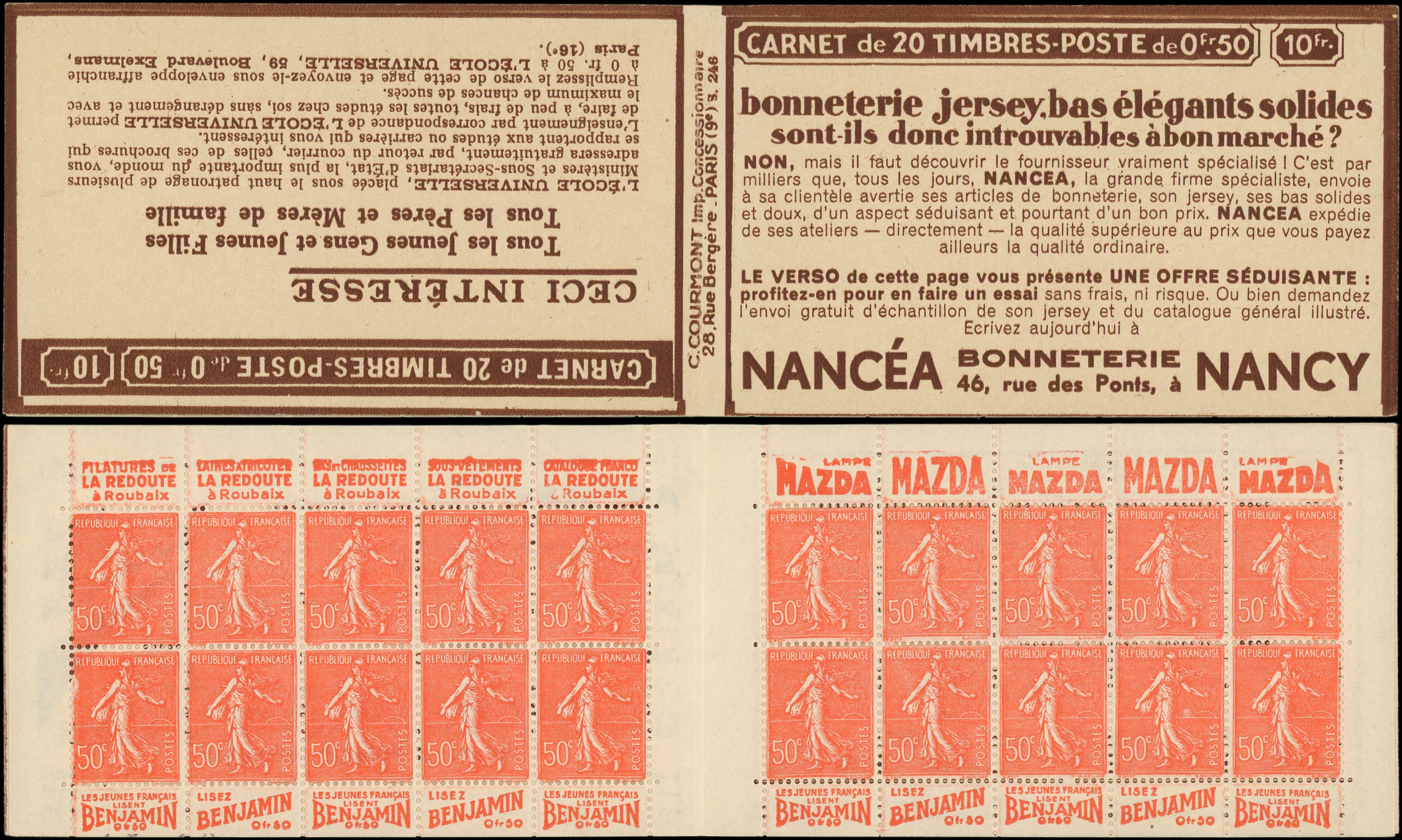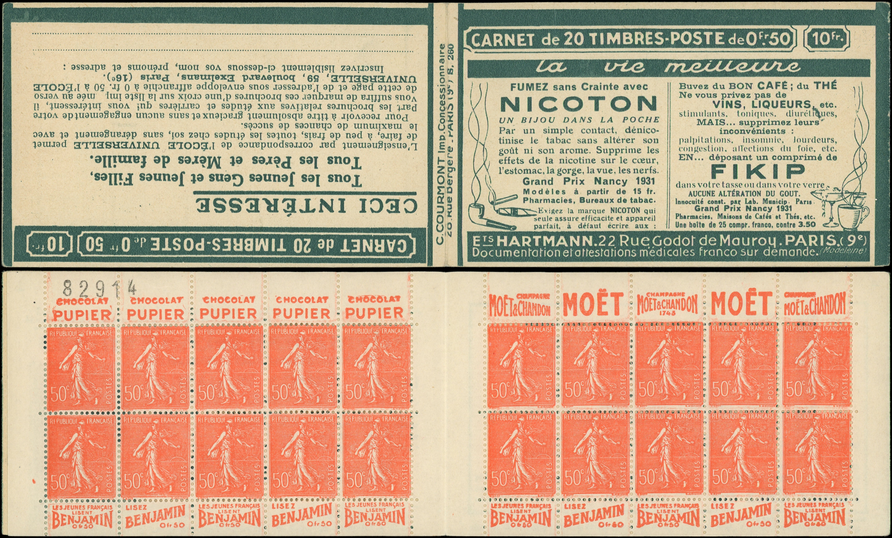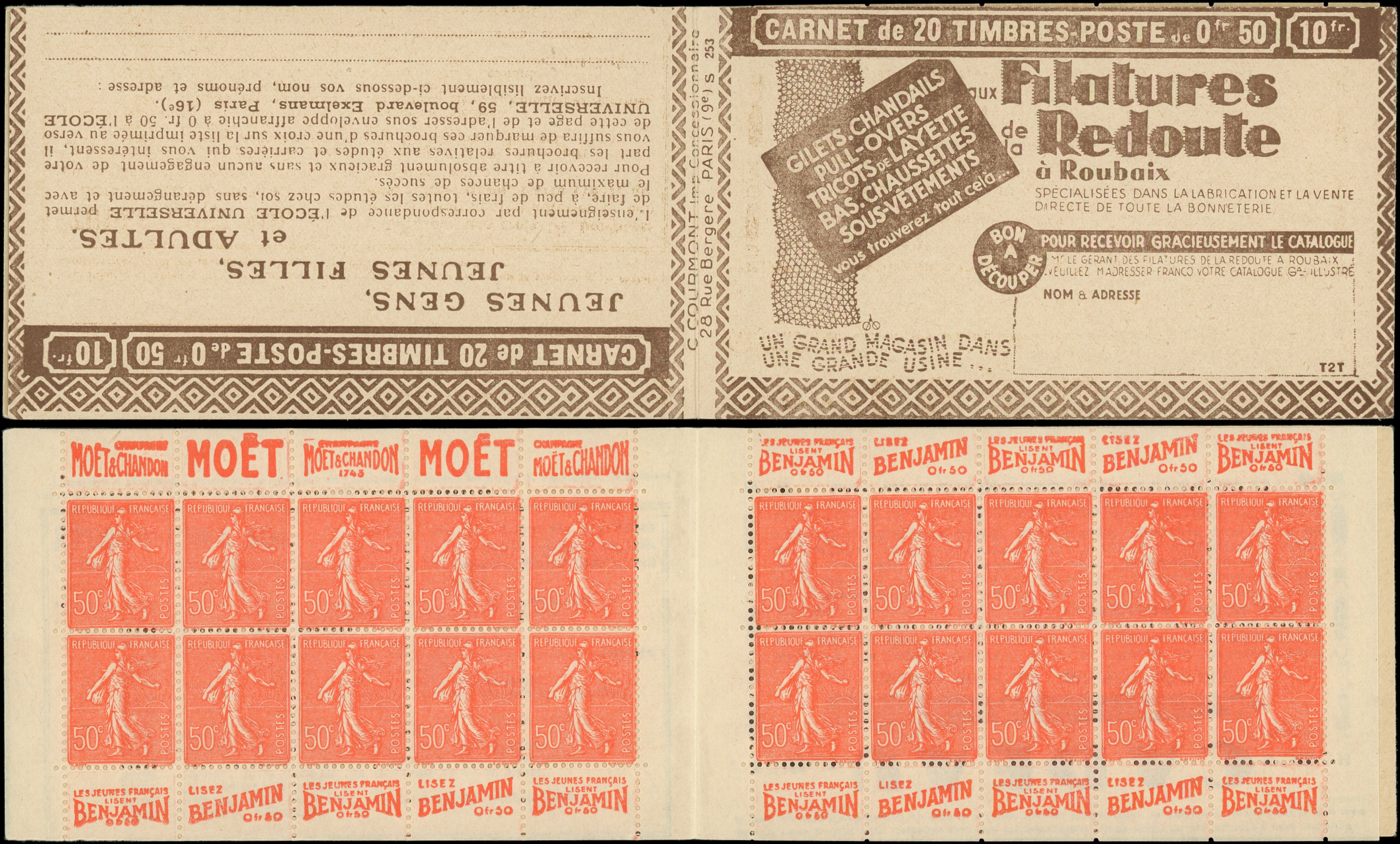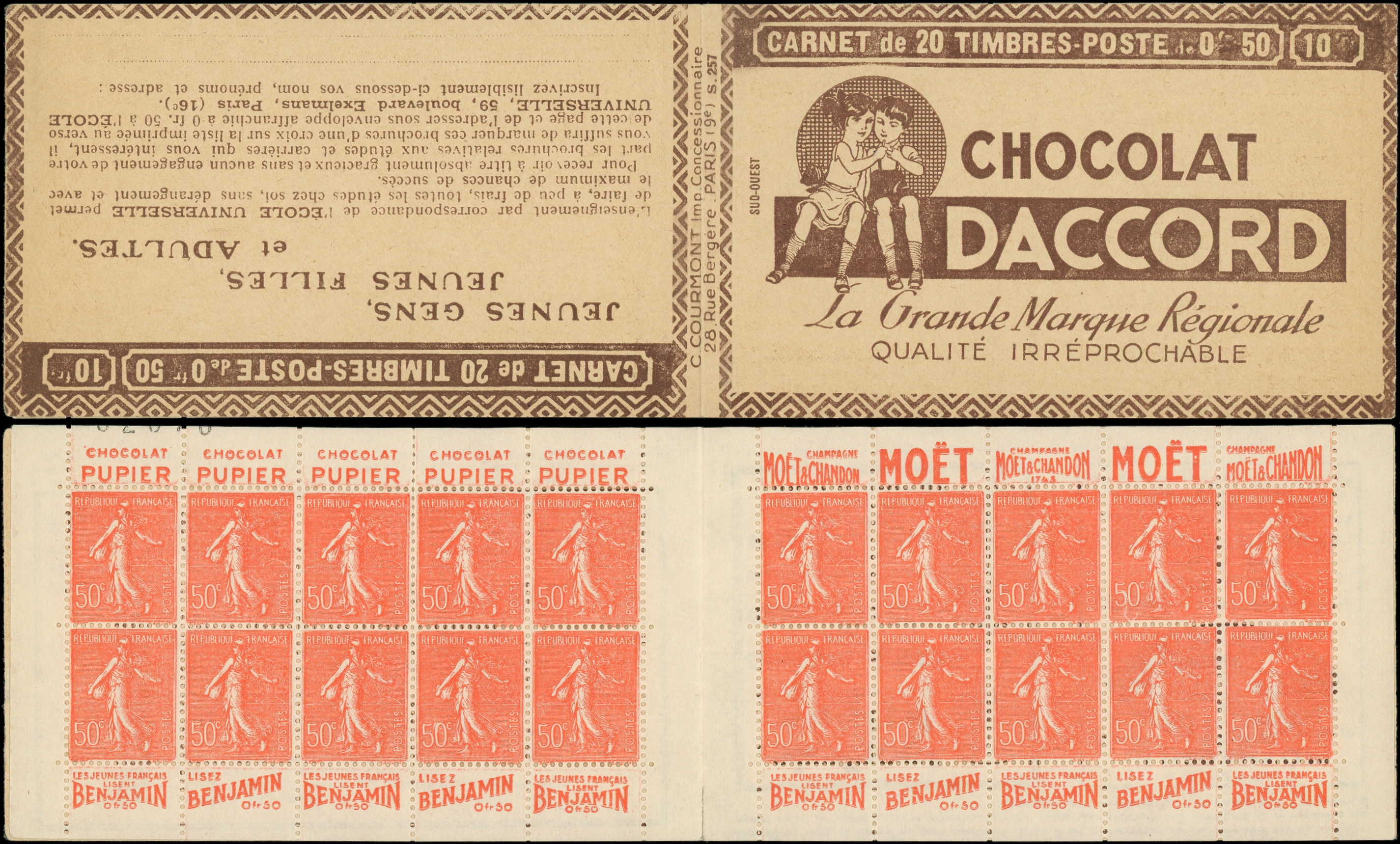 8957 199 image199-C71 Semeuse Lignée, 50c. rouge, n°199a, T IIA, S. 250, MAIZENA, adh. de couv. et amorce de découpe entre 2 ex., sinon TB (Image)