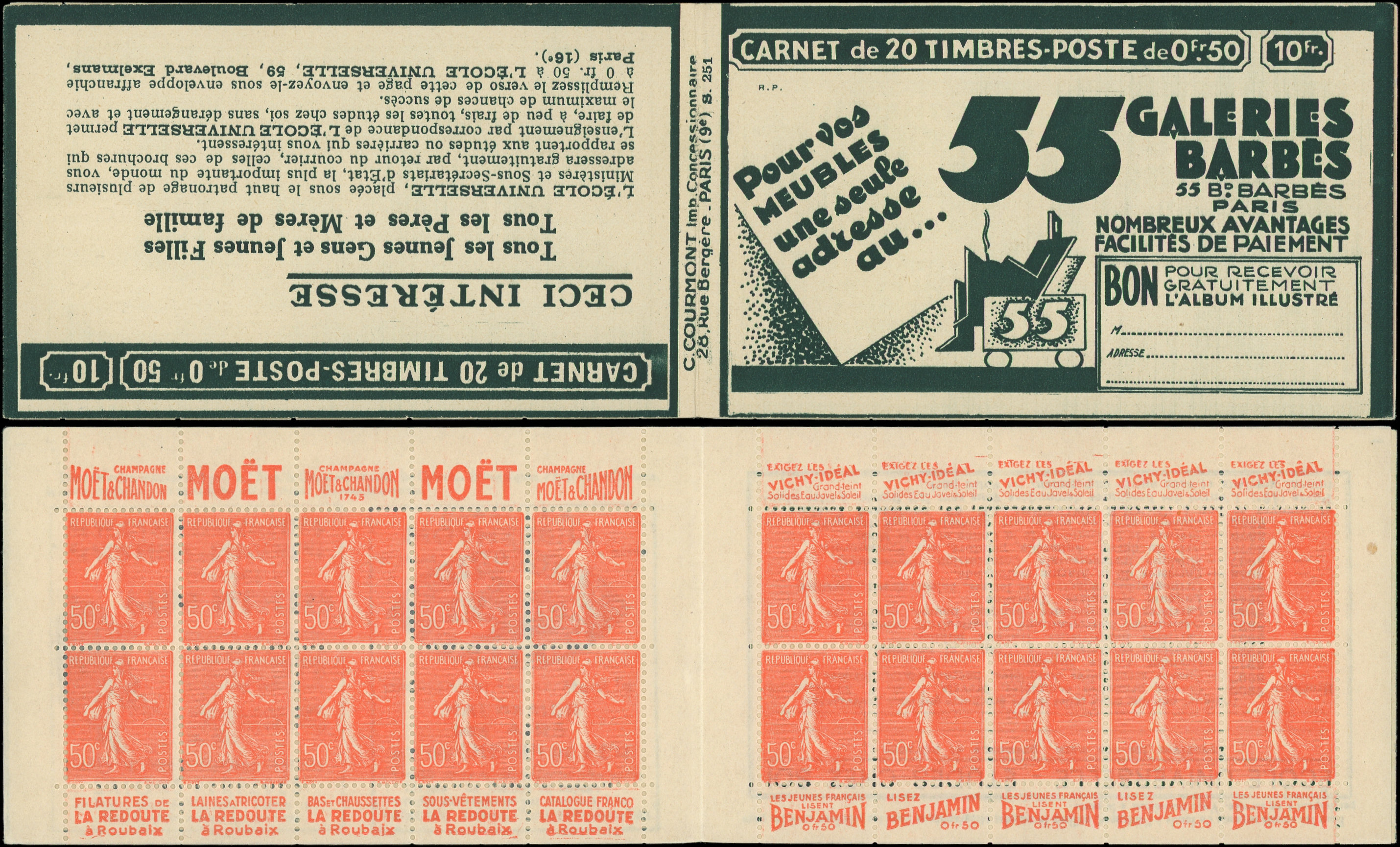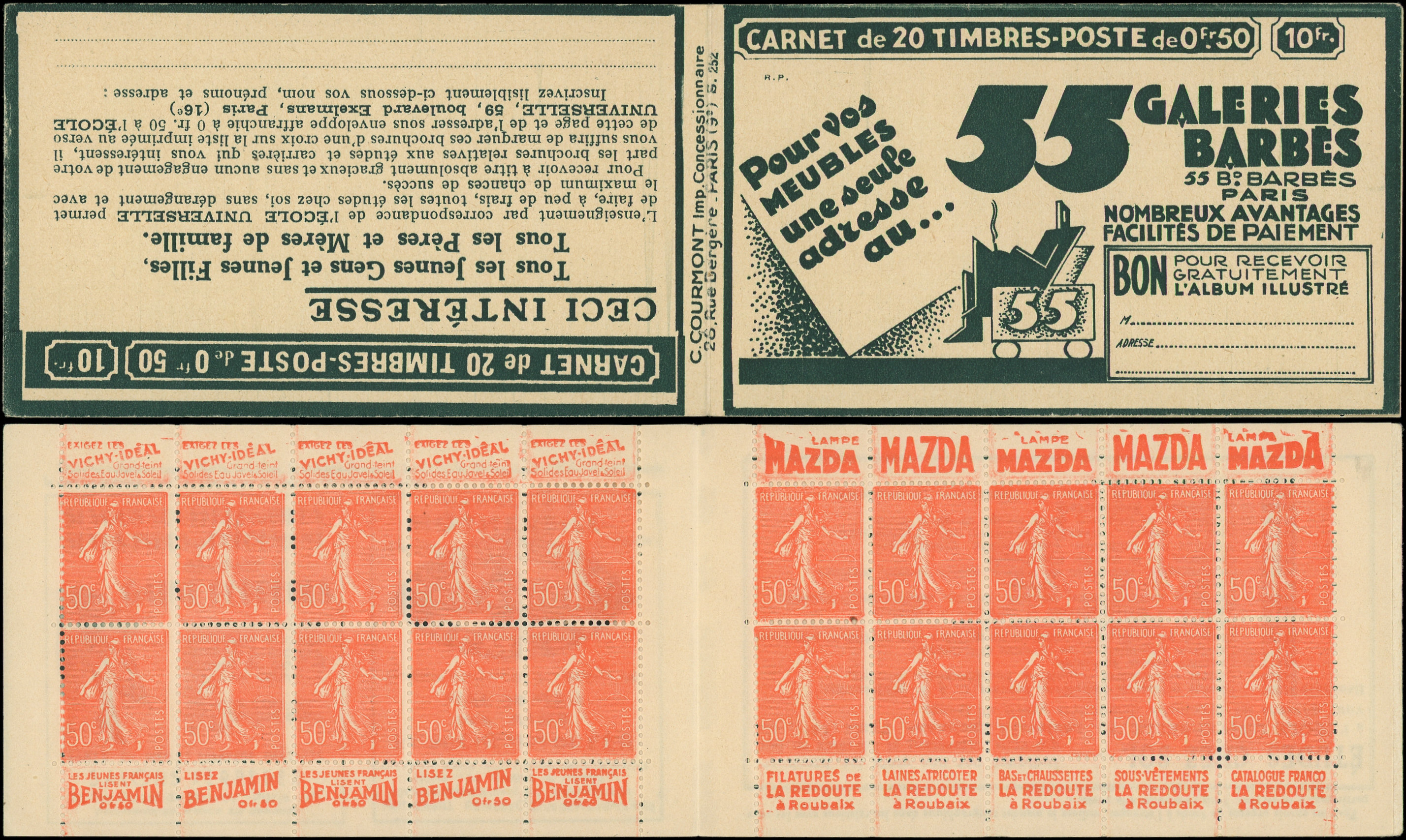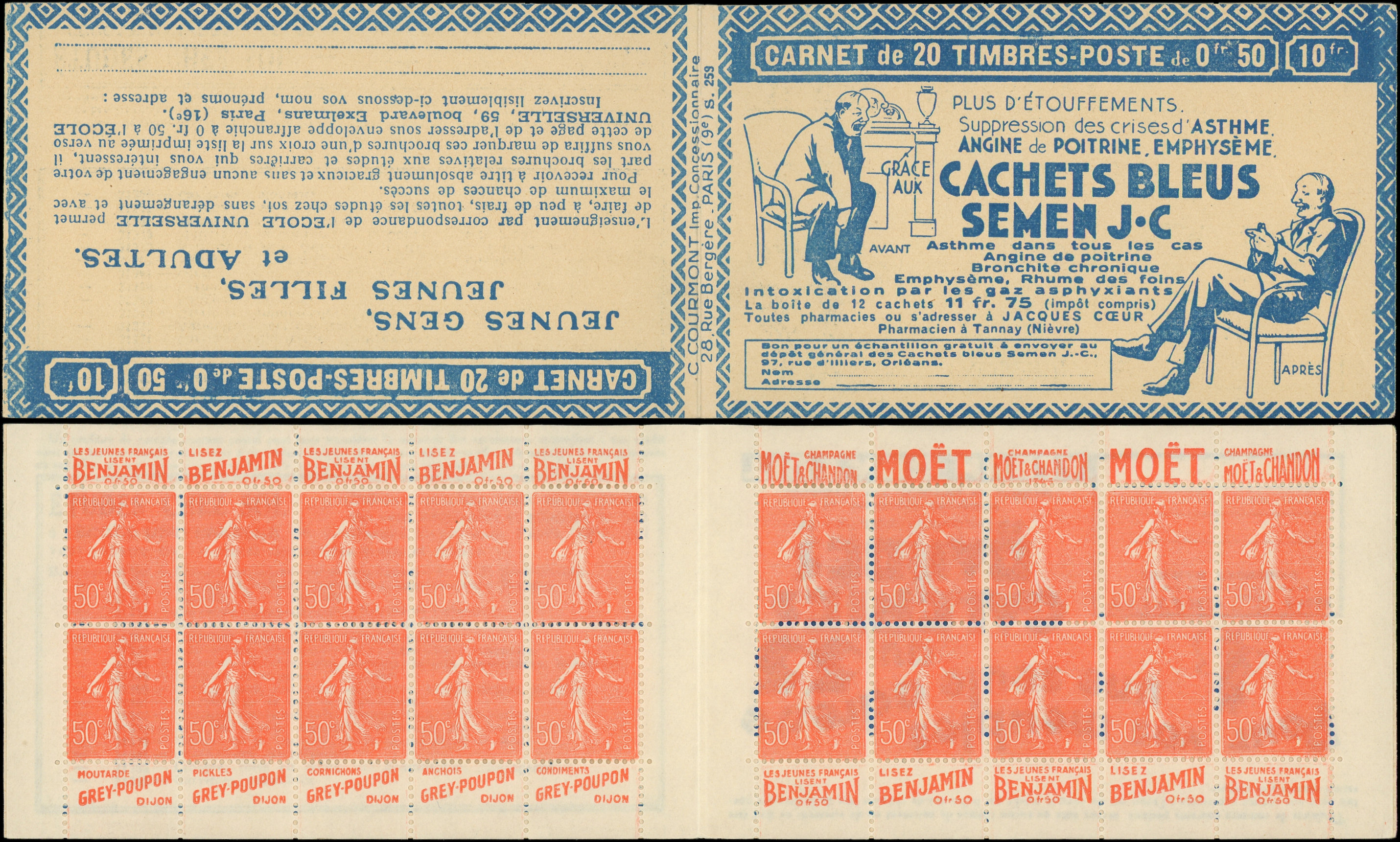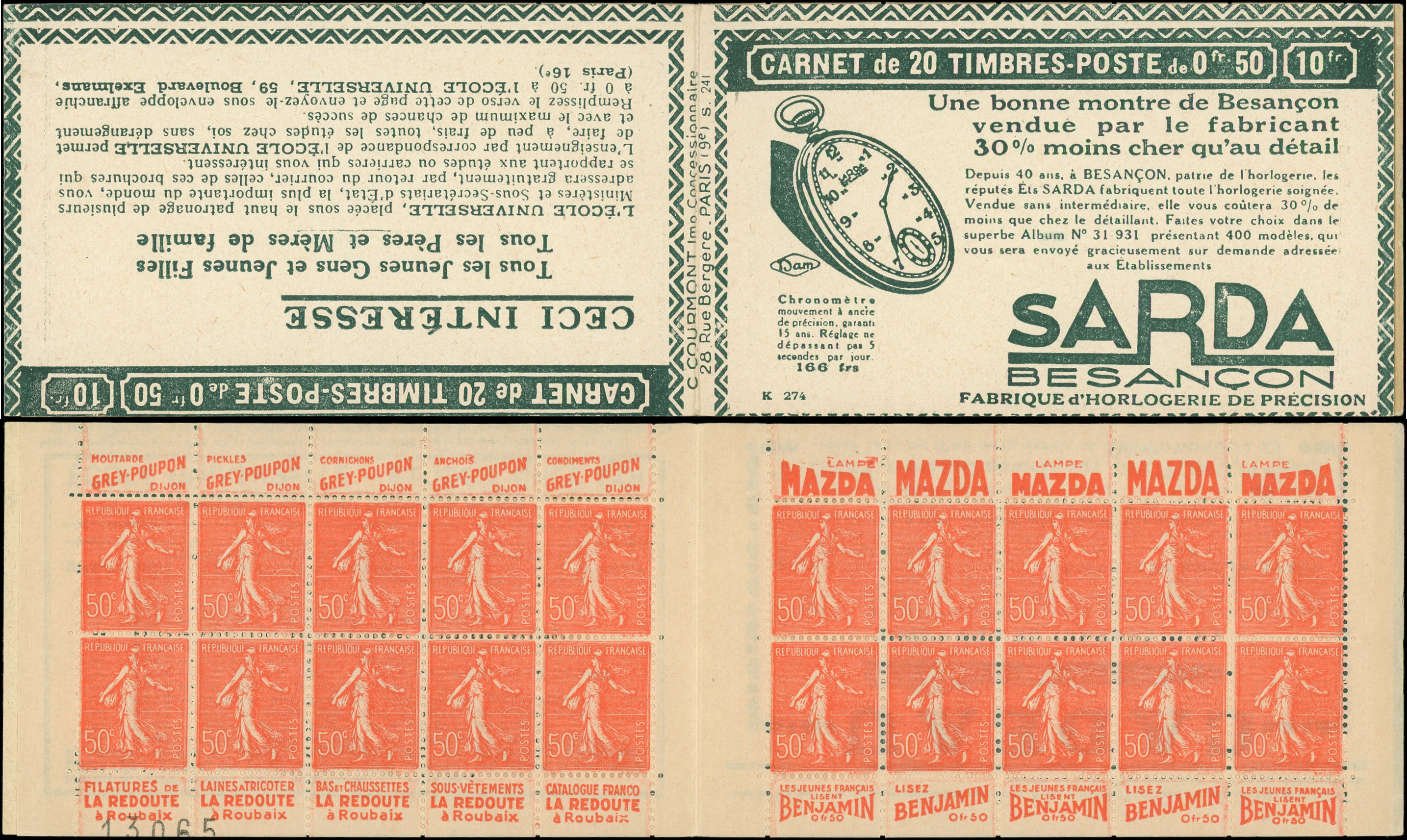 8957 199 image199-C71 Semeuse Lignée, 50c. rouge, n°199a, T IIA, S. 250, MAIZENA, adh. de couv. et amorce de découpe entre 2 ex., sinon TB (Image)