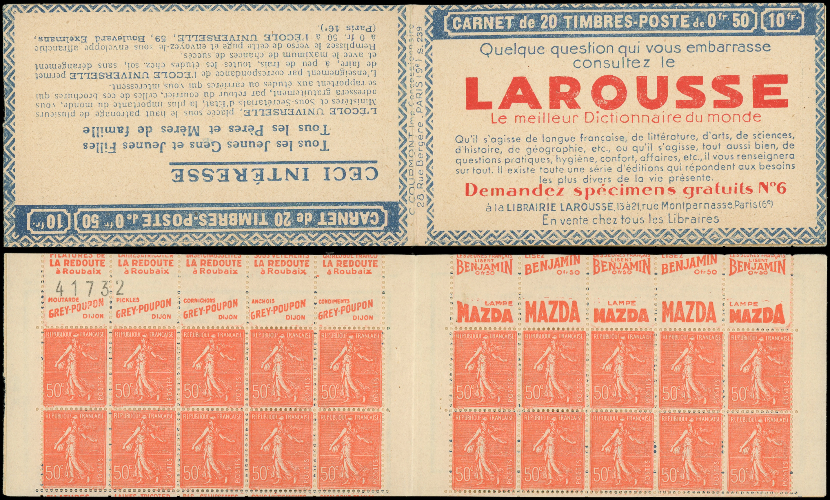 8955 199 image199-C70 Semeuse Lignée, 50c. rouge, n°199a, T IIA, S. 239, LAROUSSE, DOUBLE PUB en haut, n°41732, Superbe (Image)