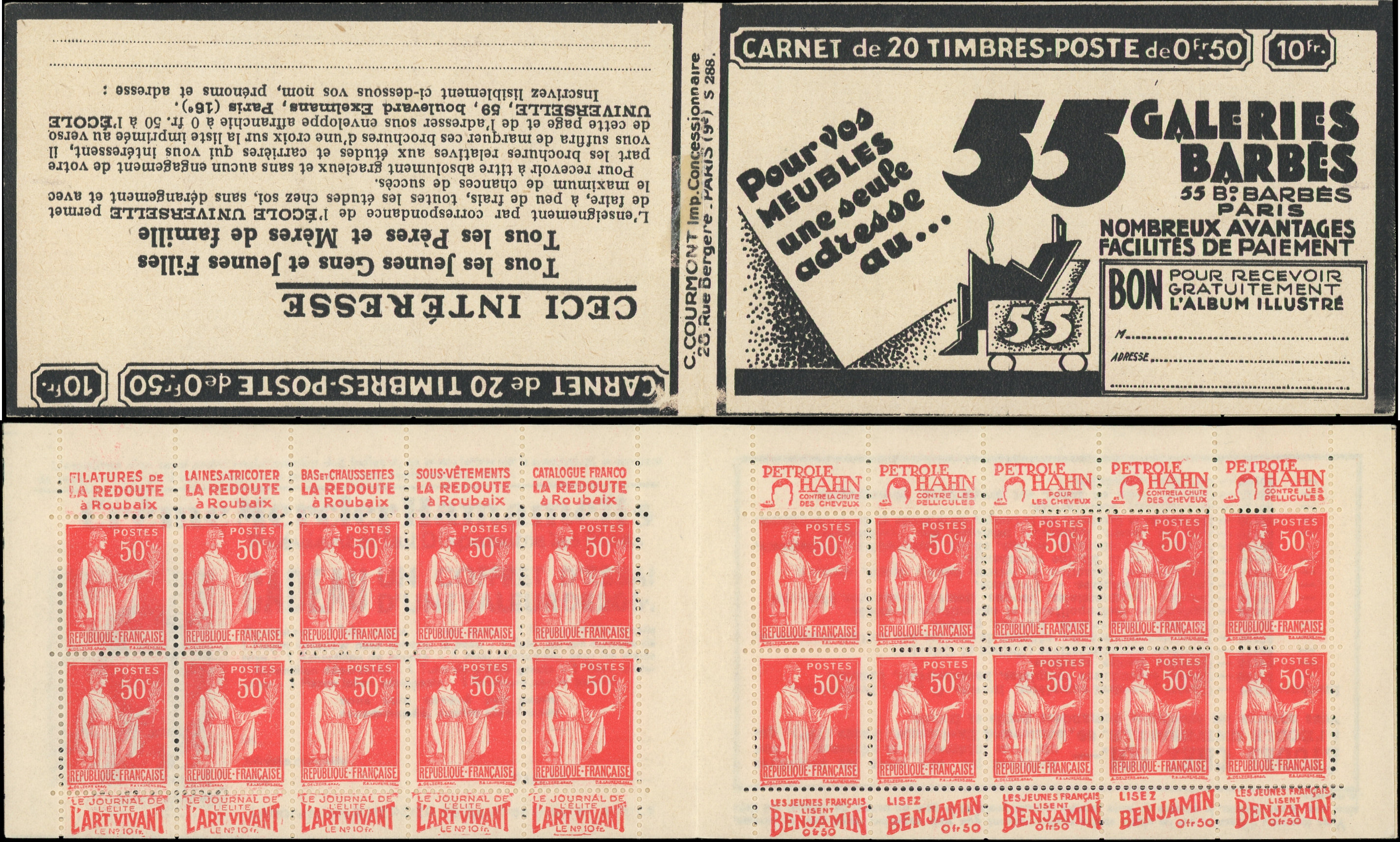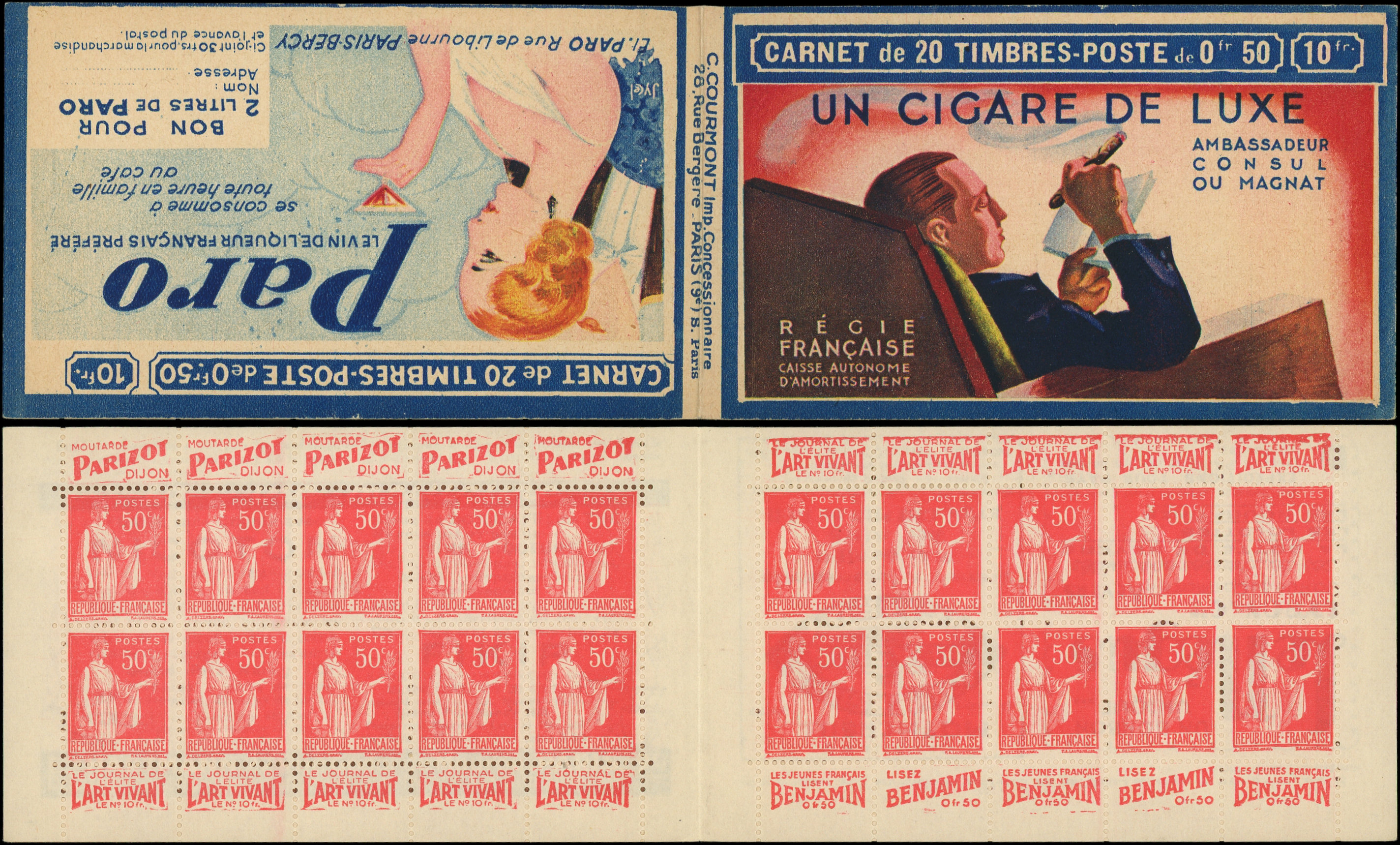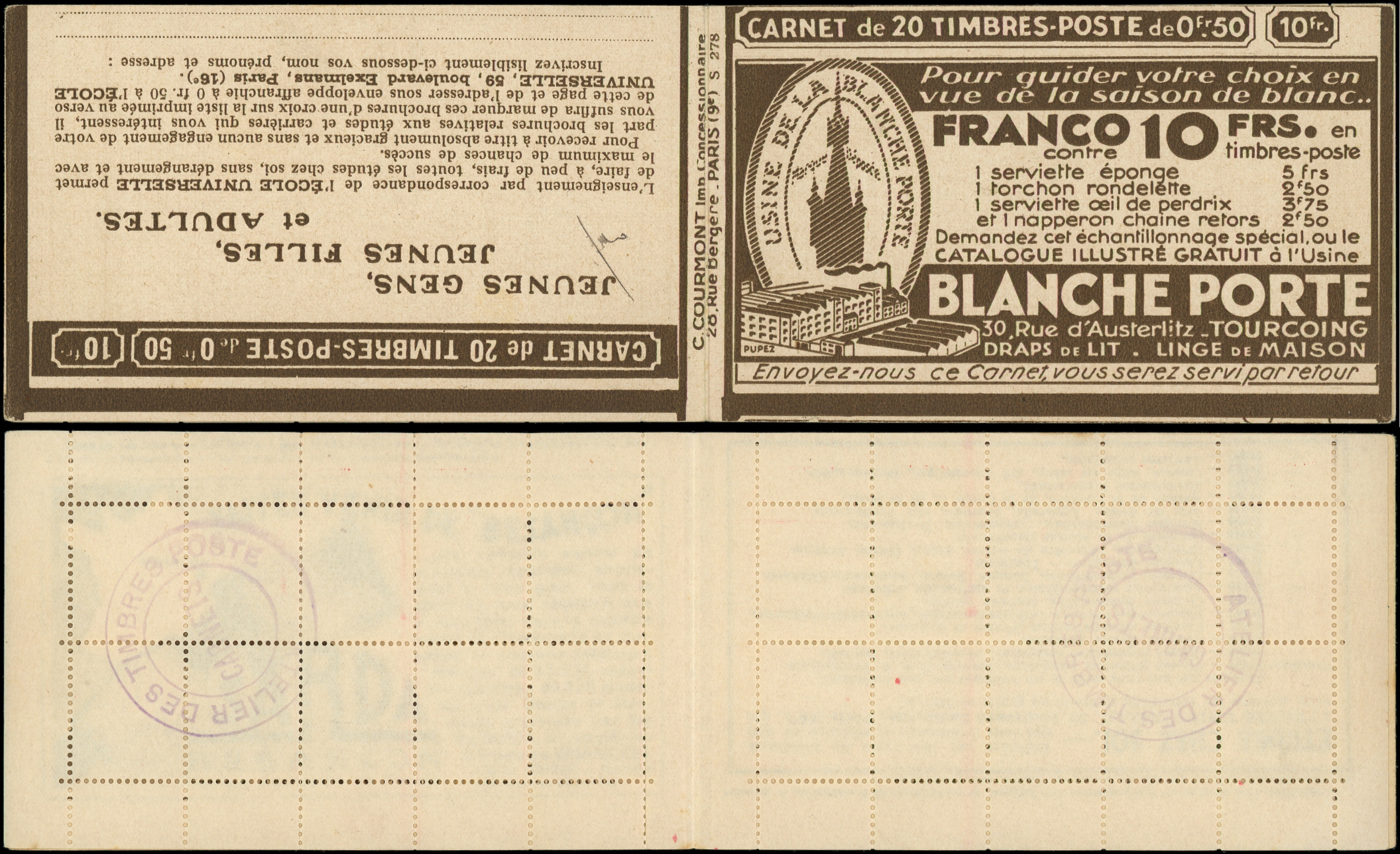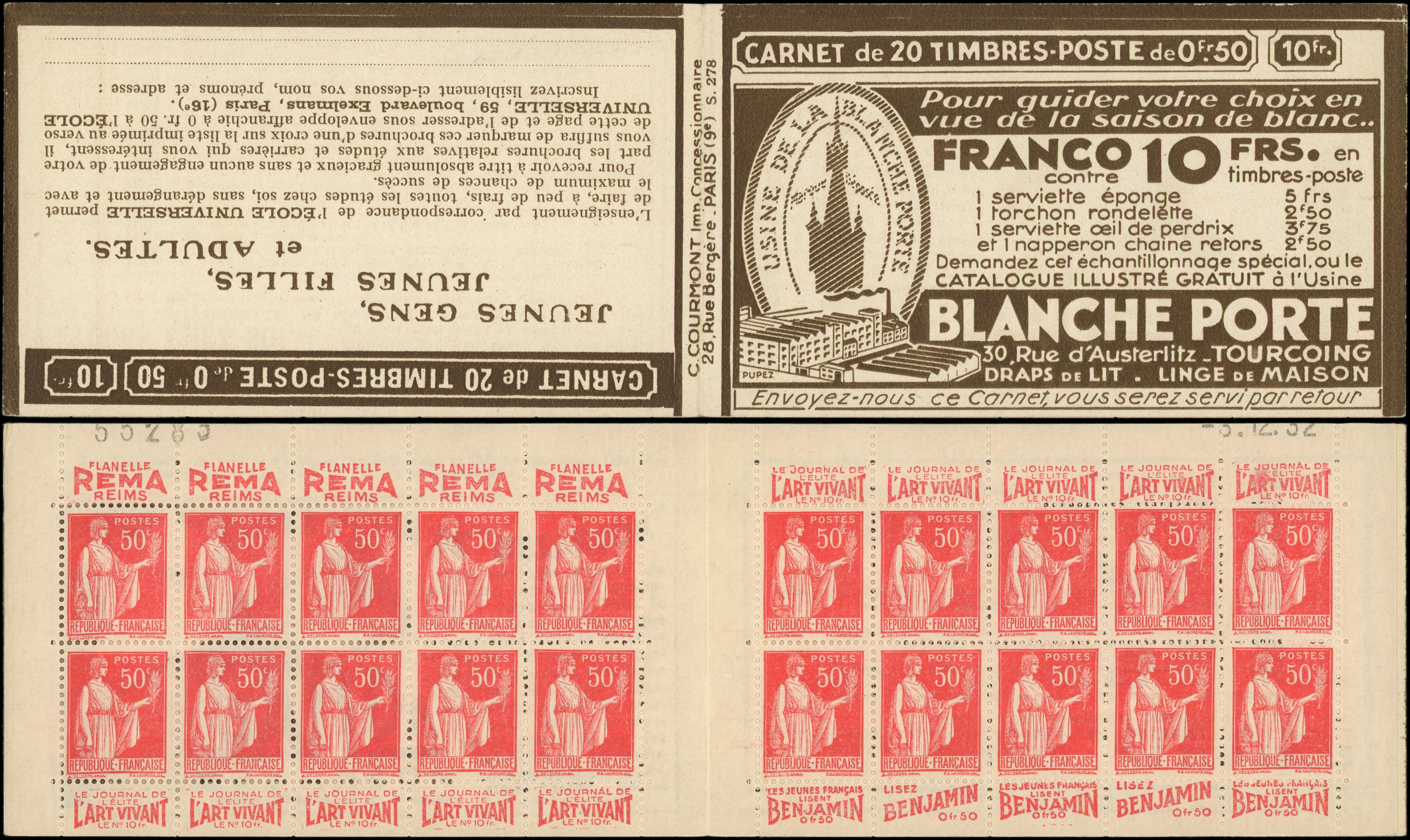9063 283 image283-C14aatp Paix, 50c. rouge, n°283a, T I, S. 278, BLANCHE PORTE, timbres NON imprimés avec cachet ATELIER DES TIMBRES POSTES CARNETS, qqs adh. de couv., RRR, TB (Image)
