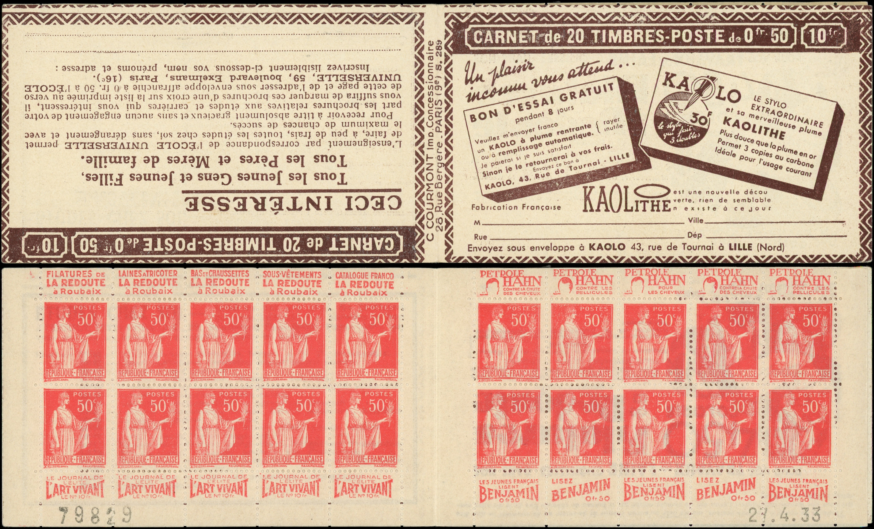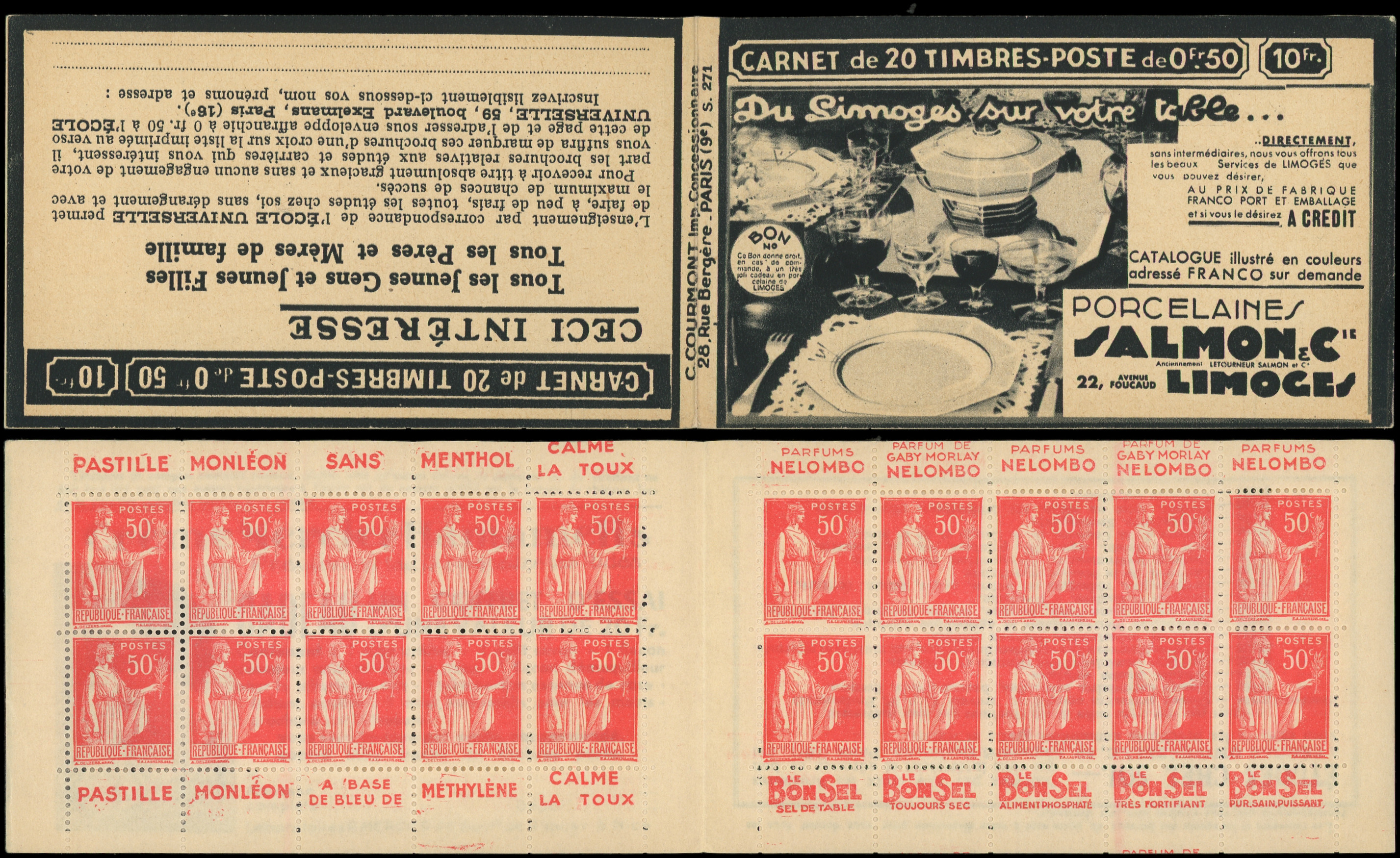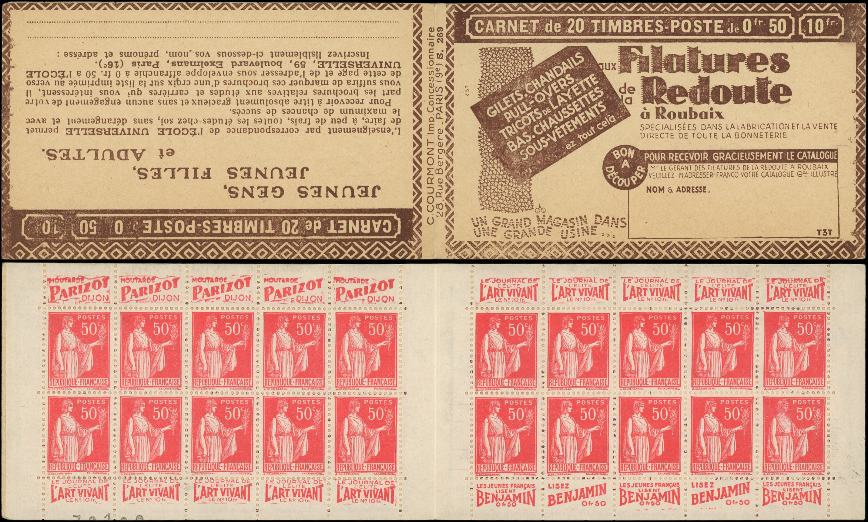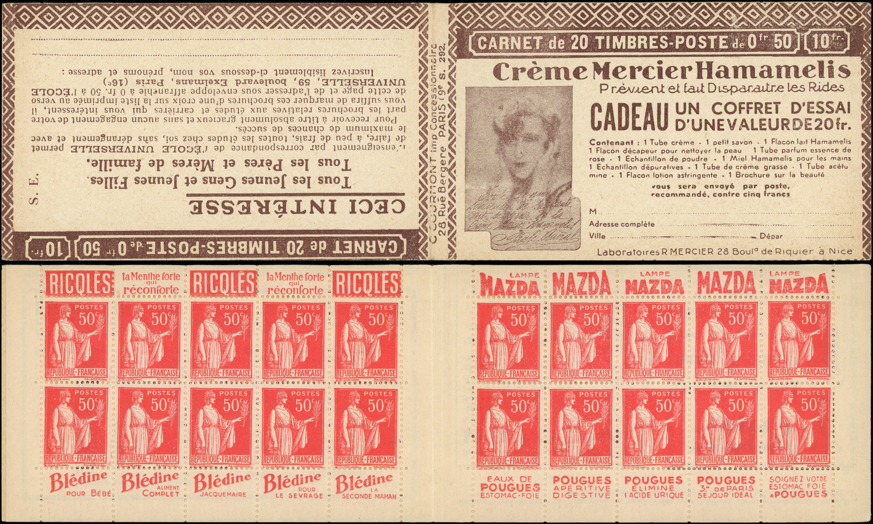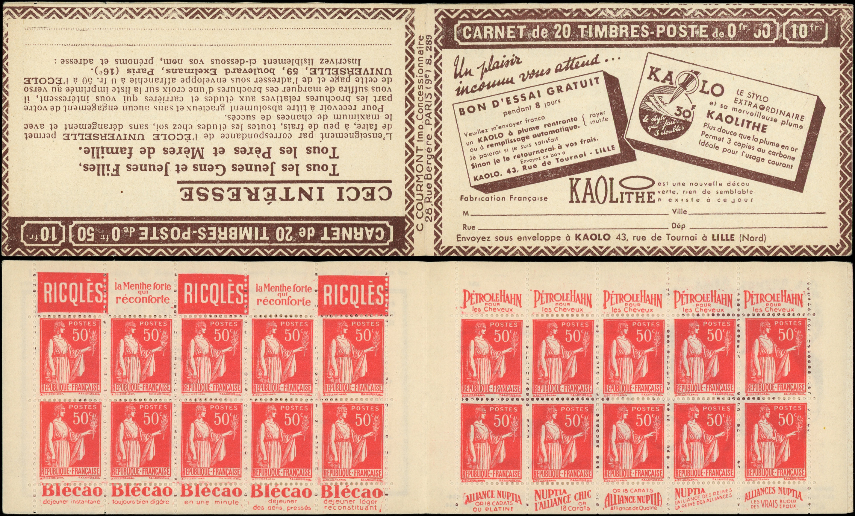 9063 283 image283-C14aatp Paix, 50c. rouge, n°283a, T I, S. 278, BLANCHE PORTE, timbres NON imprimés avec cachet ATELIER DES TIMBRES POSTES CARNETS, qqs adh. de couv., RRR, TB (Image)