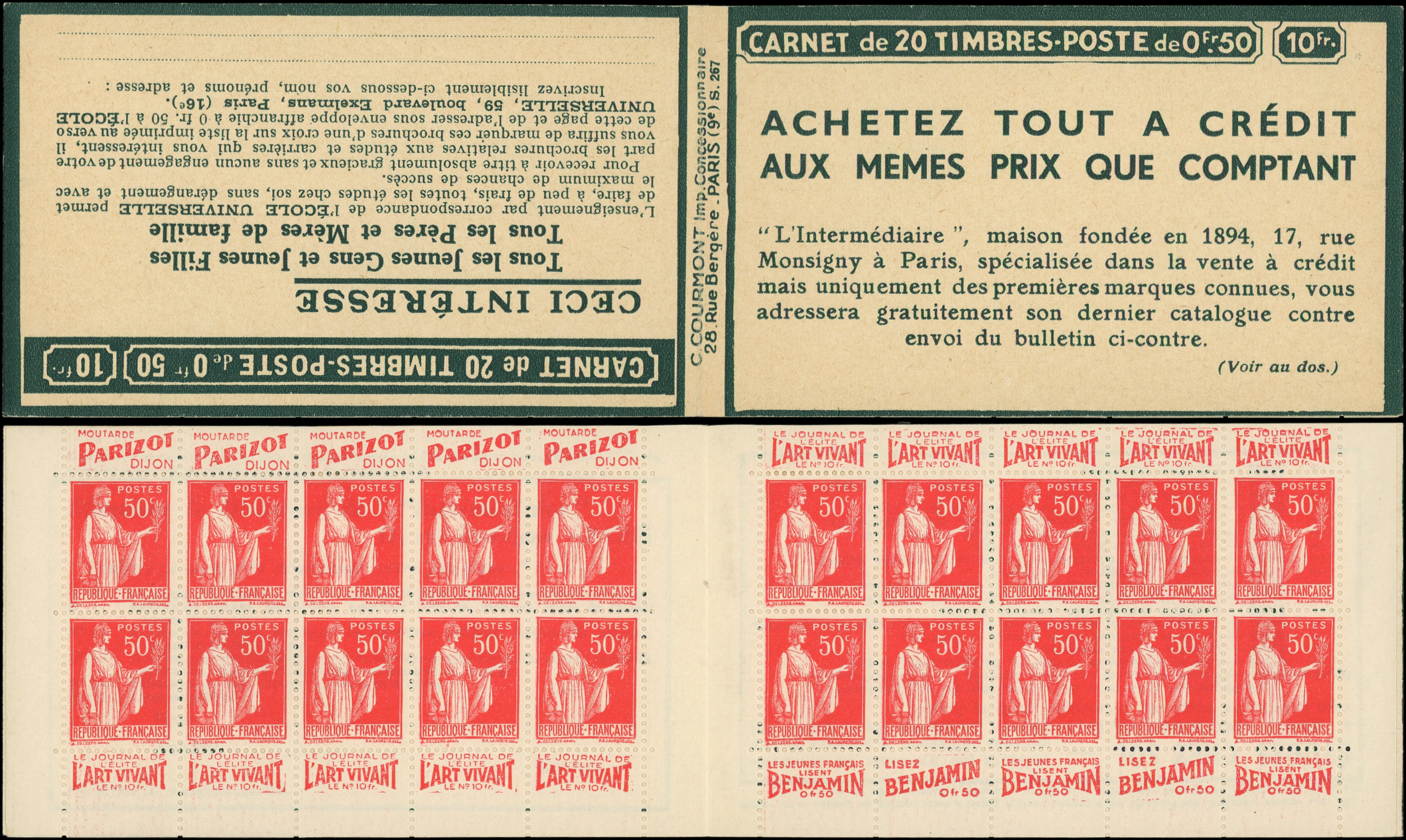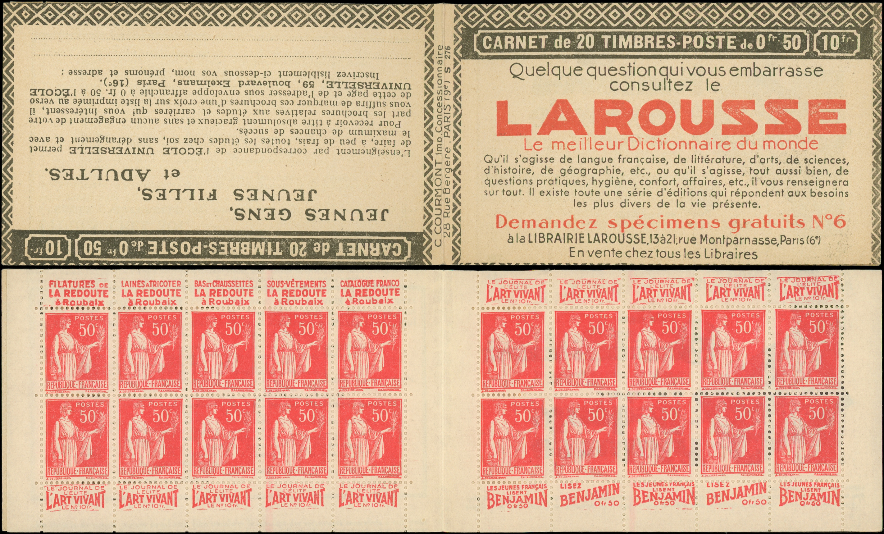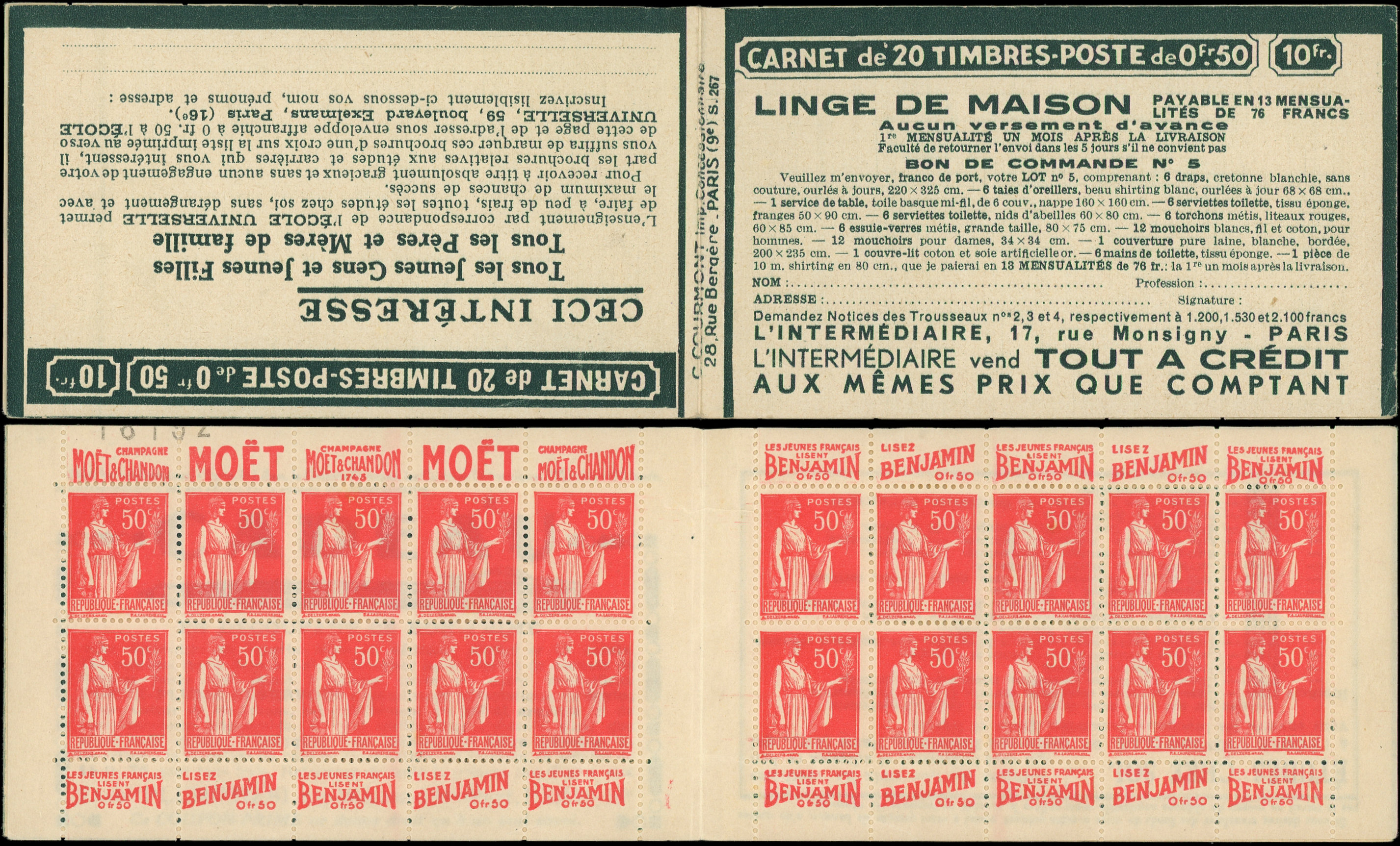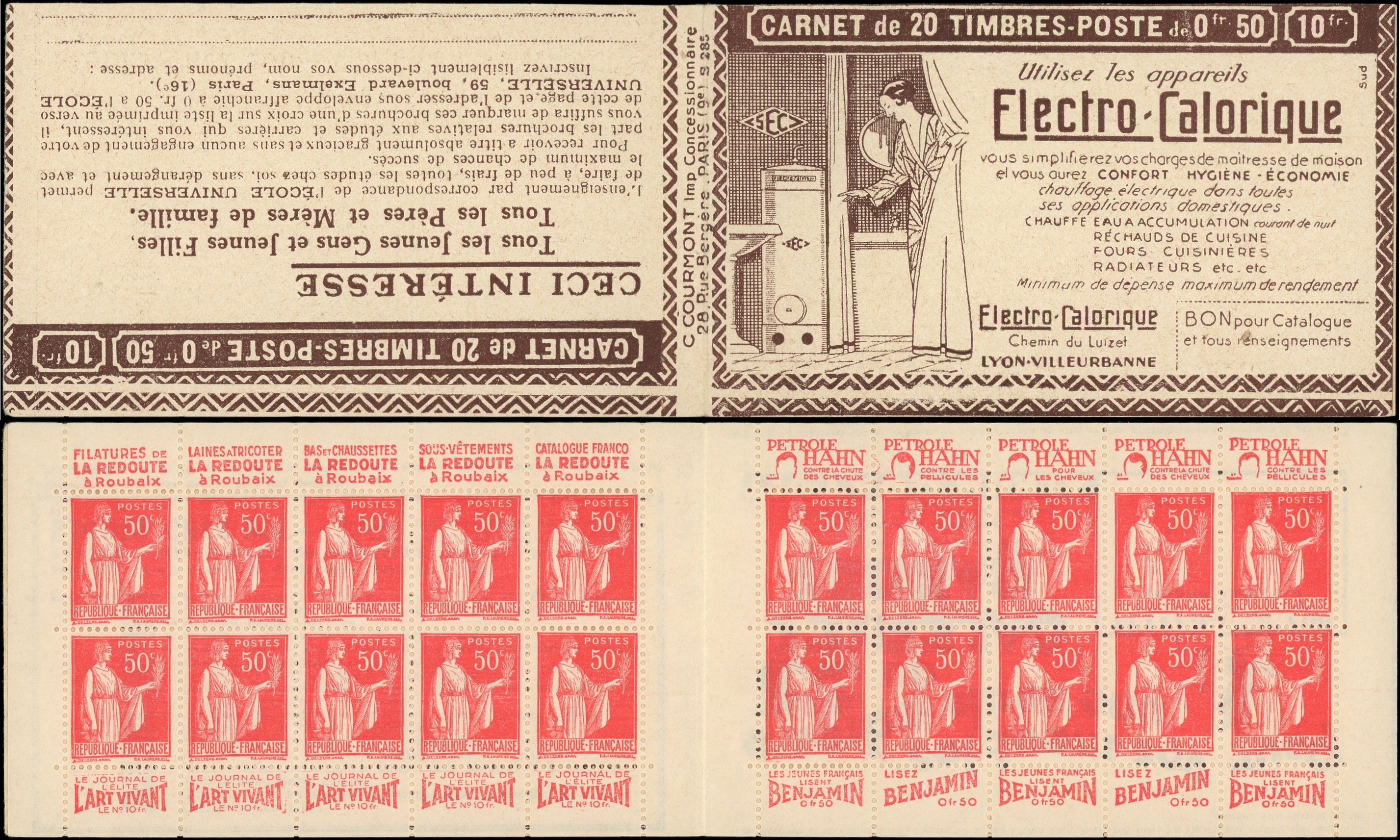 9063 283 image283-C14aatp Paix, 50c. rouge, n°283a, T I, S. 278, BLANCHE PORTE, timbres NON imprimés avec cachet ATELIER DES TIMBRES POSTES CARNETS, qqs adh. de couv., RRR, TB (Image)