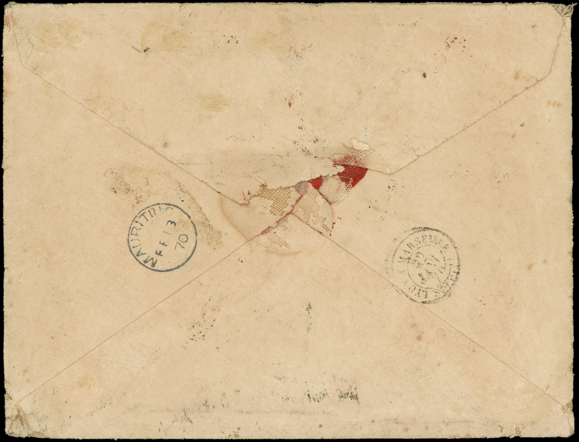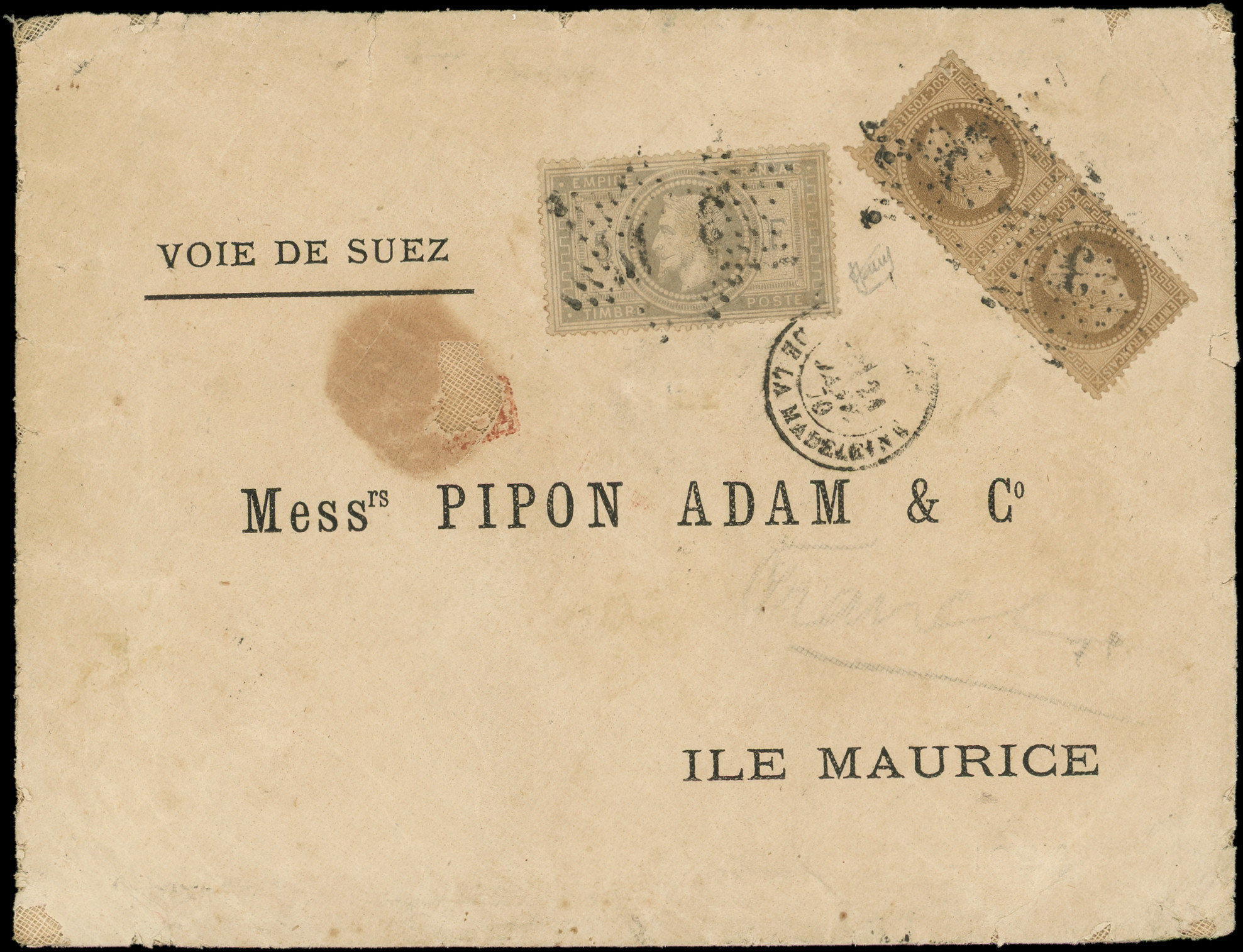 violet-gris, défx, N°30 30c. brun PAIRE, obl. ETOILE 3 s. Env. fatiguée, càd PARIS 21/1/70 date précoce, arr. MAURITIUS 13/2, R et B/TB (Image) (Image2)