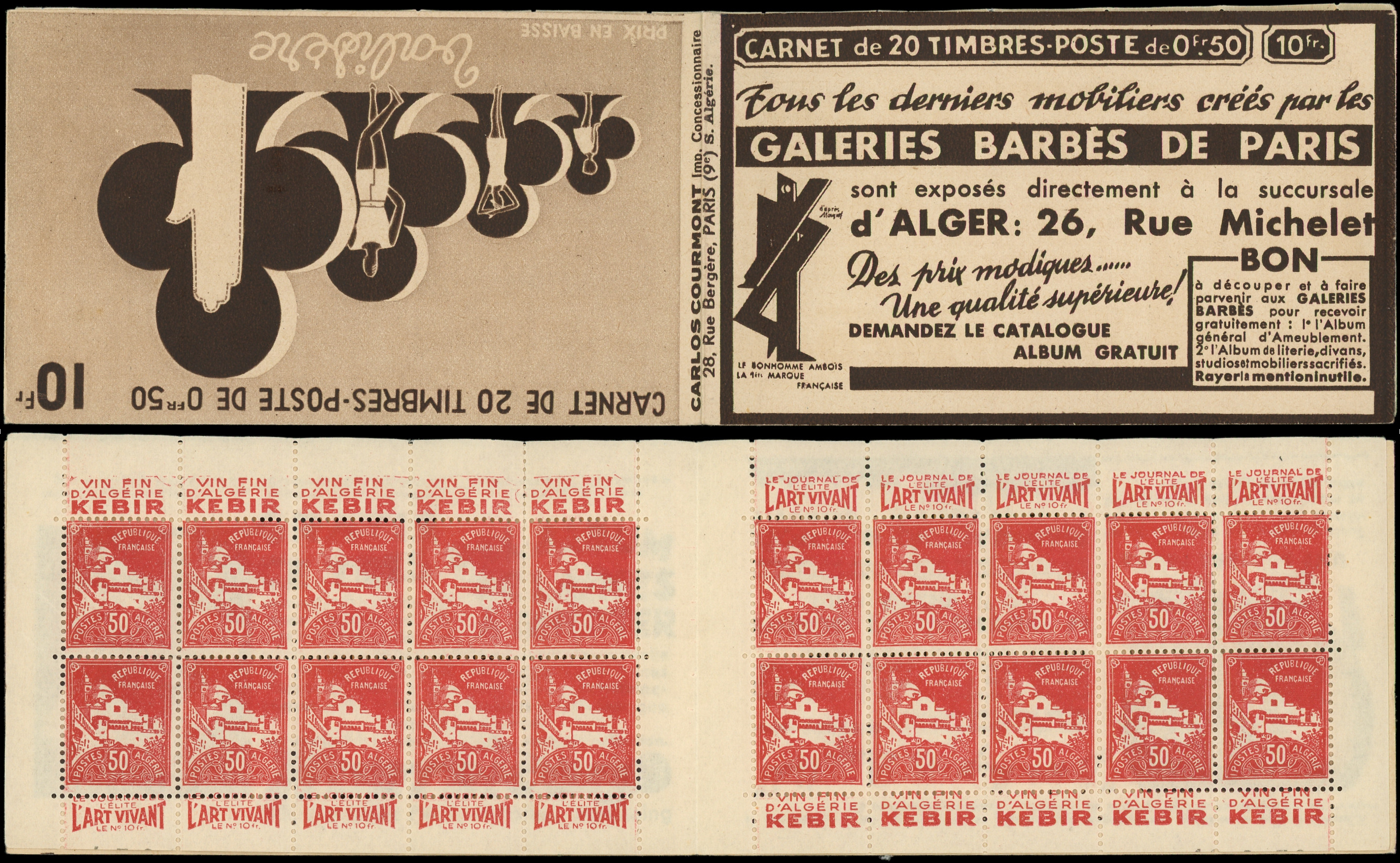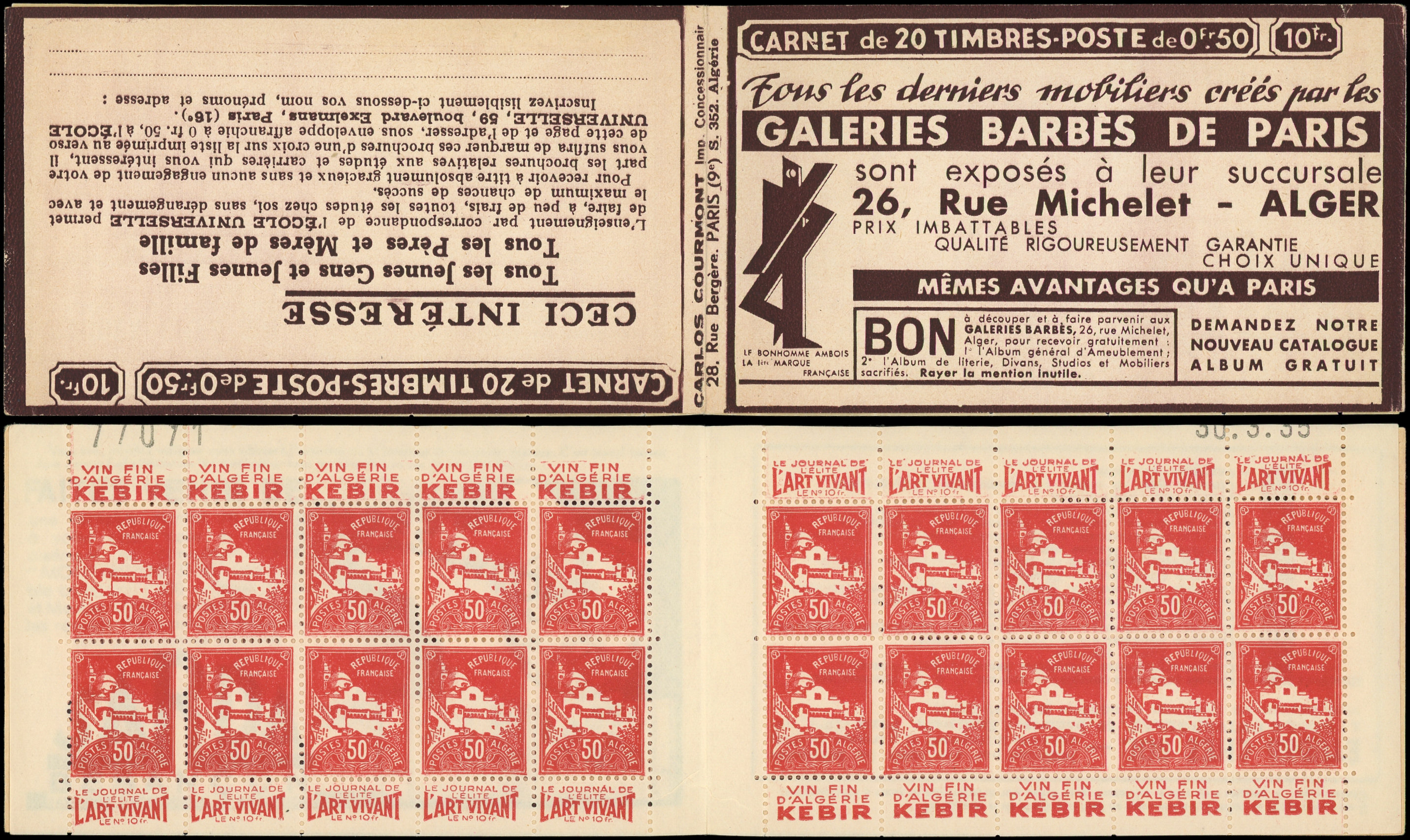 rouge, S. 352 ALGERIE, GALERIES BARBES, n°77071 daté 30/3/35 (tronqués), TTB (Image)