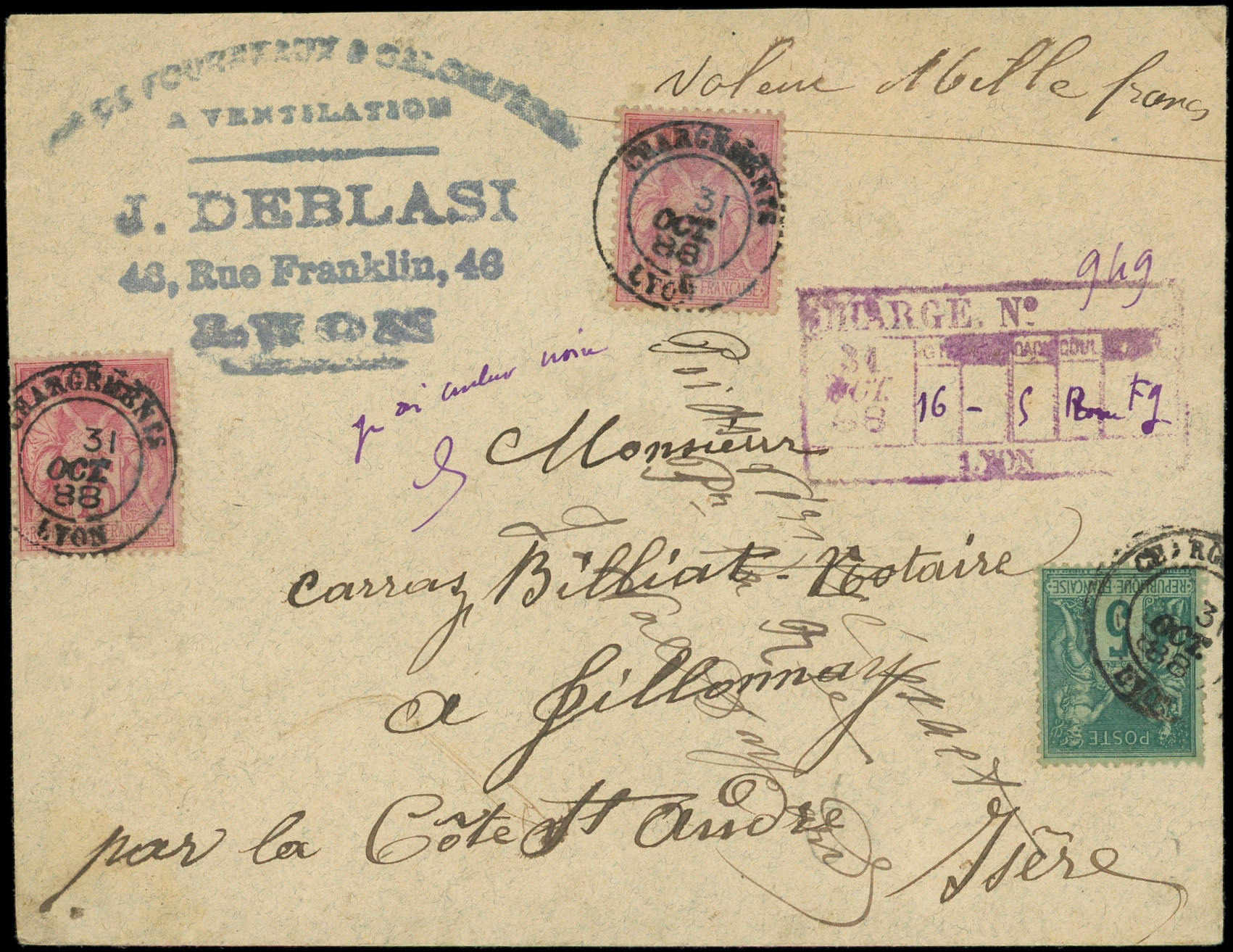 (2) et N°75 5c. vert, obl. càd CHARGEMENTS/LYON 31/10/88 s. Env. CHARGE, descriptif en violet, TB (Image) (Image2)