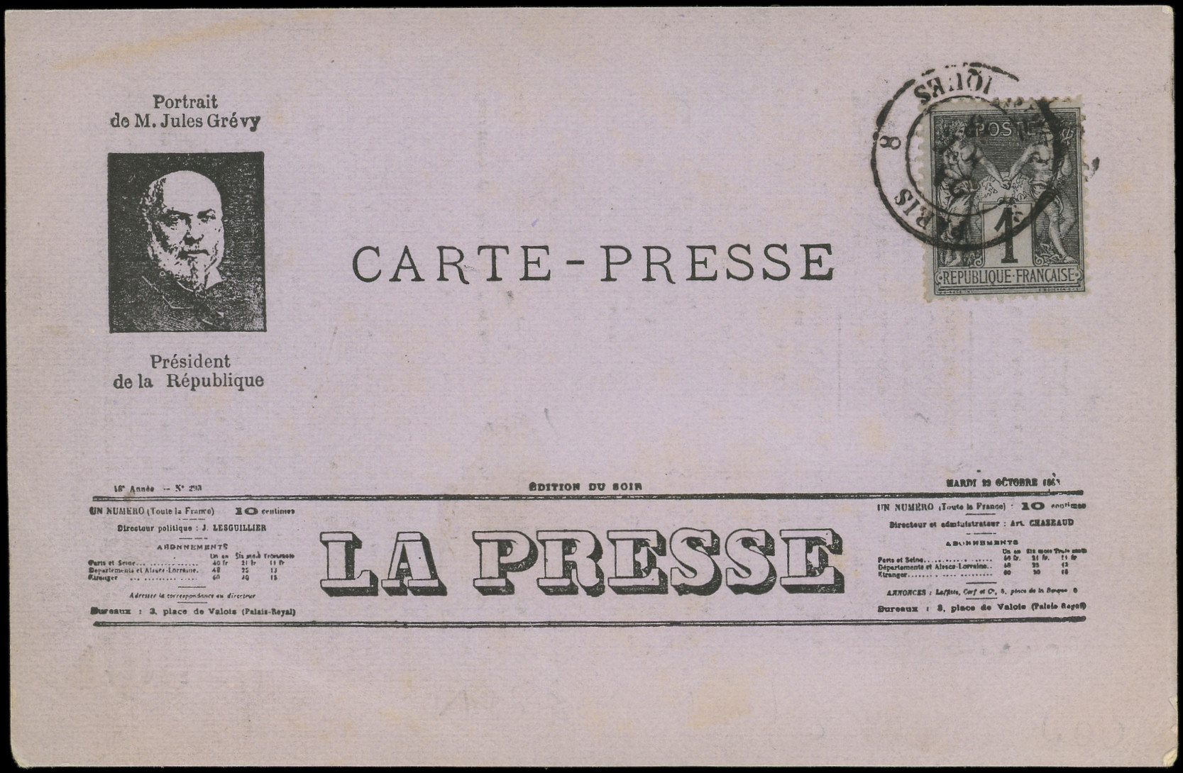 sur azuré, obl. càd 8 PARIS 8/PERIODIQUES sur carte-presse avec portrait de Jules Grévy, TB (Image) (Image2)