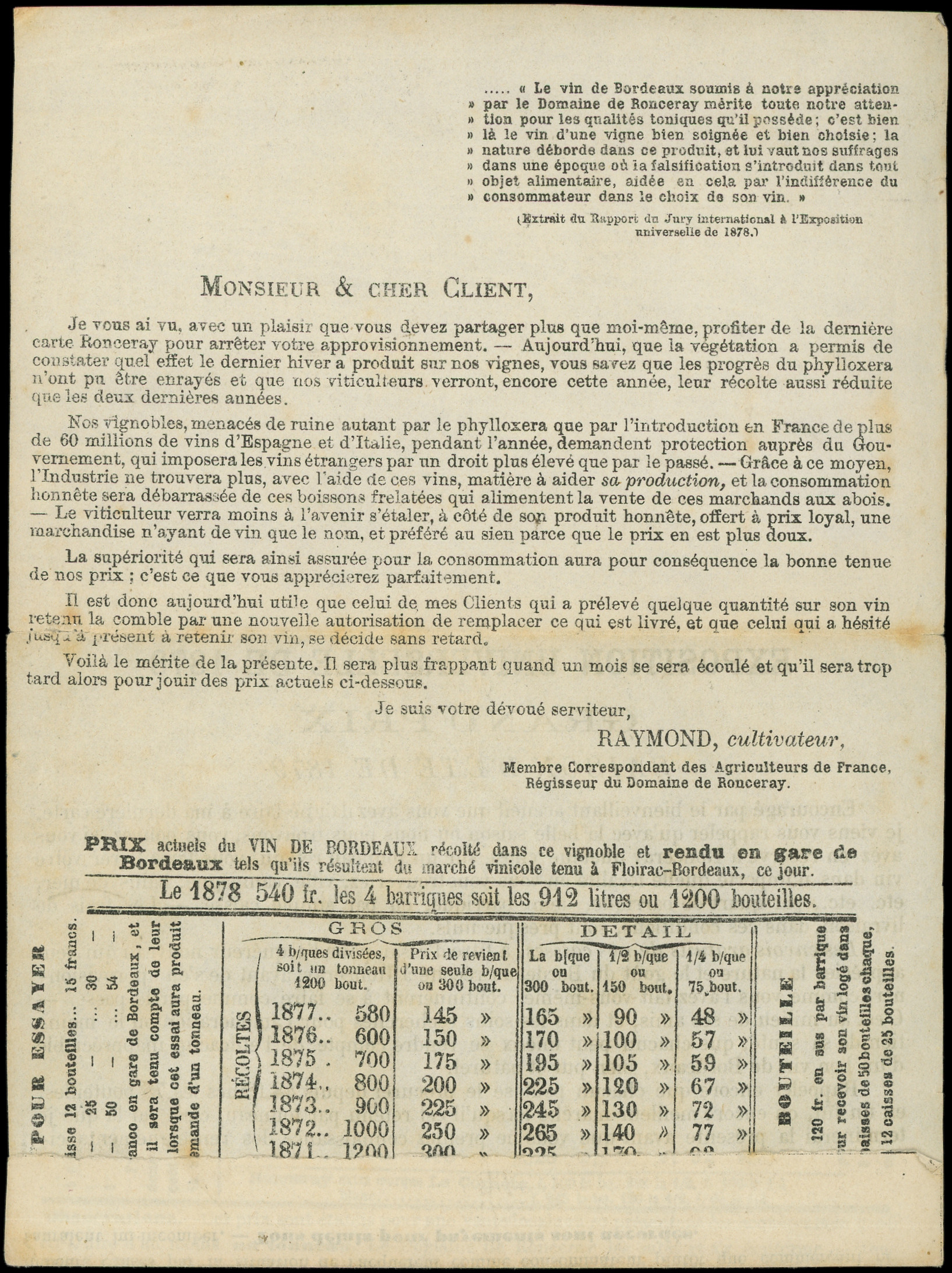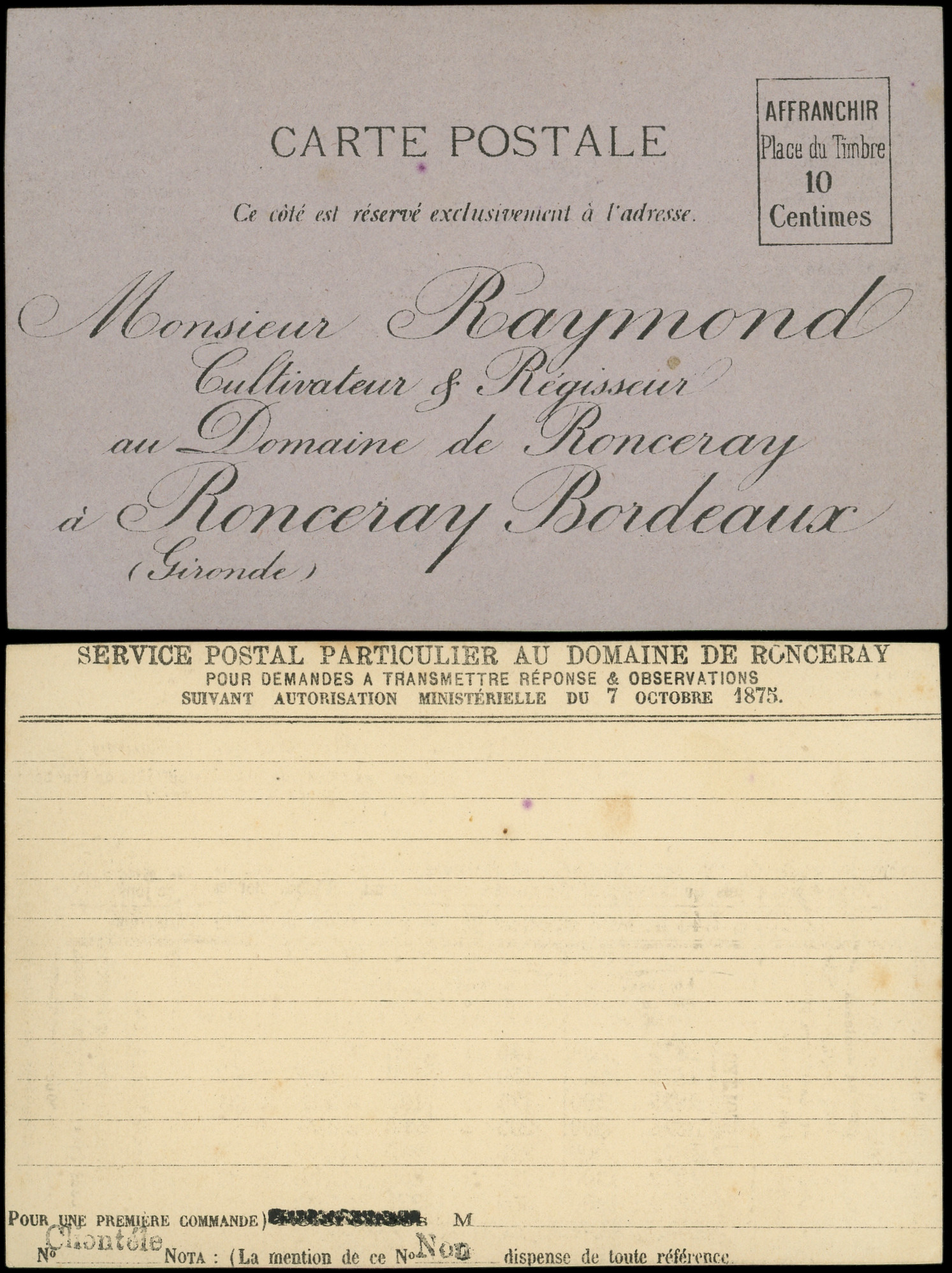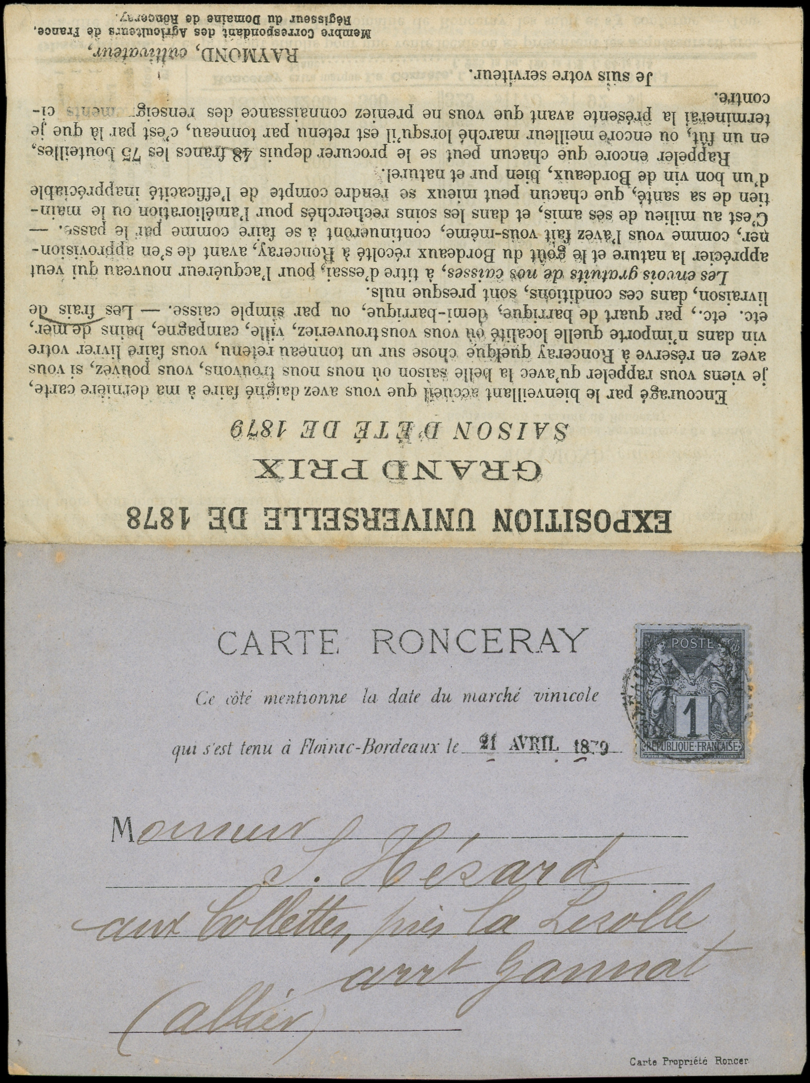 sur azuré, obl. s. CP Privée RONCERAY avec texte imprimé EXPO Universelle de 1878 + CP réponse non utilisée, RR, TB (Image) (Image2)