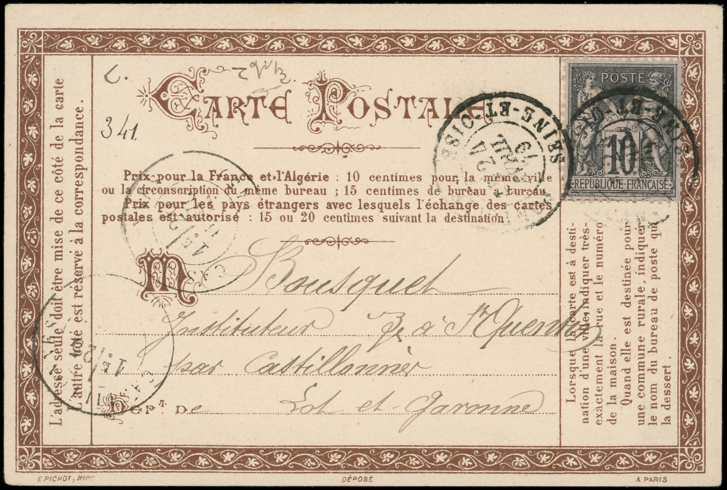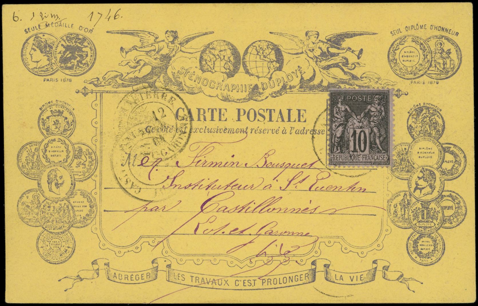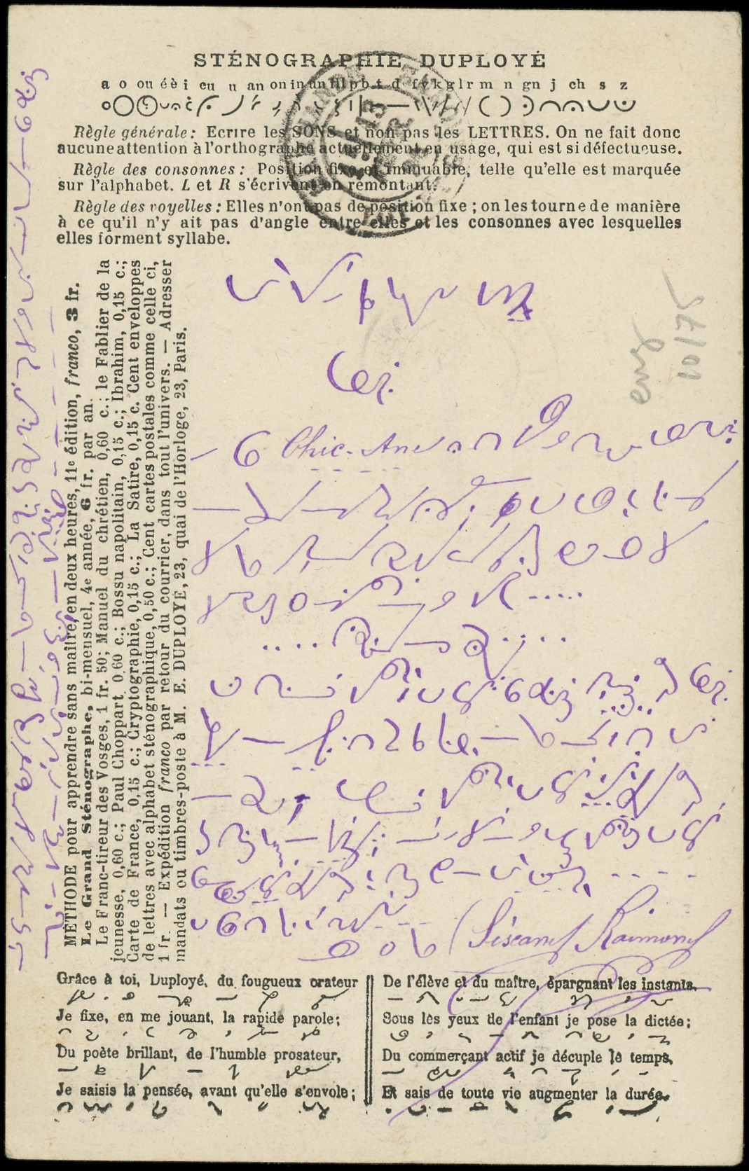 sur lilas, obl. càd PONTOISE 24/4/79 s. CP sténogaphie Duployé brune, TB (Image)