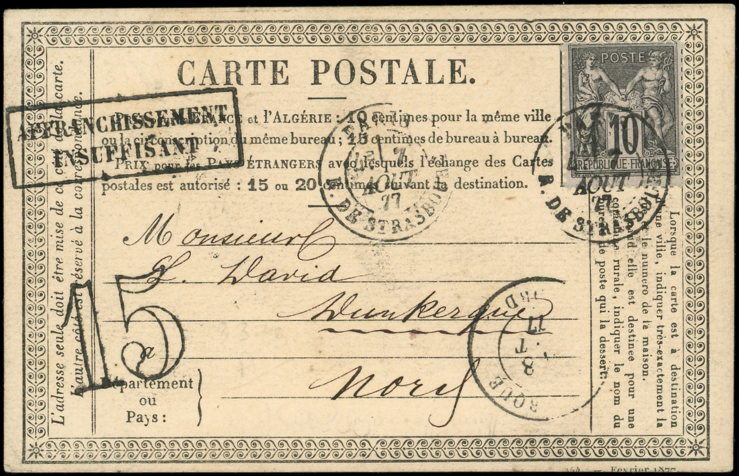 sur lilas, obl. càd PARIS 7/8/77 s. CP, cachet AFFRANCHISSEMENT INSUFFISANT et Taxe 15 double trait, TB (Image)