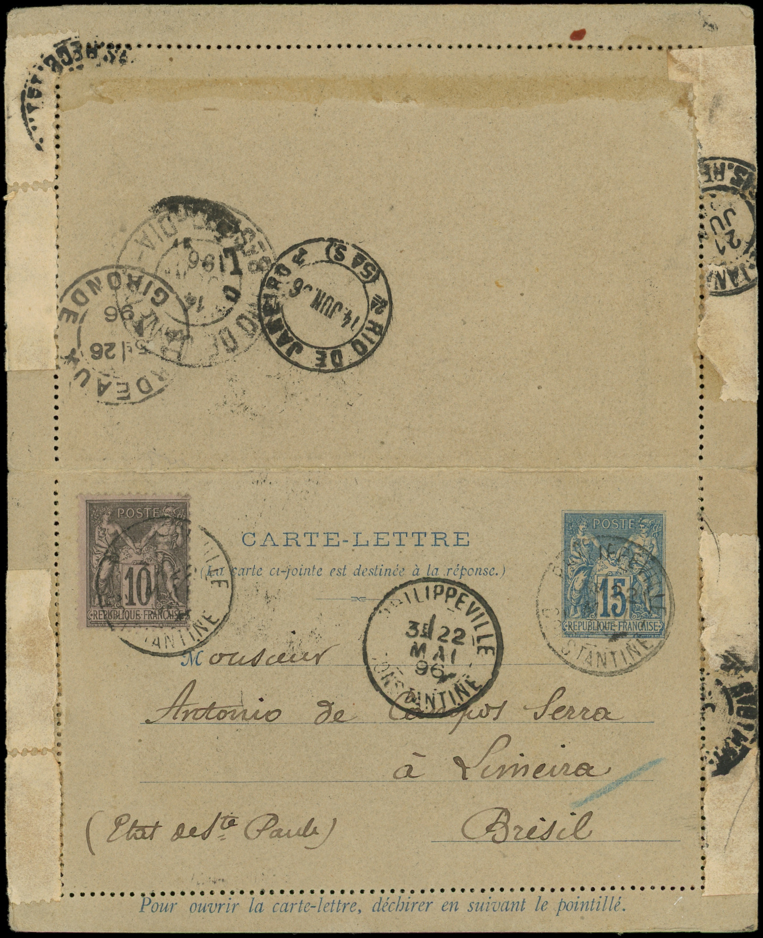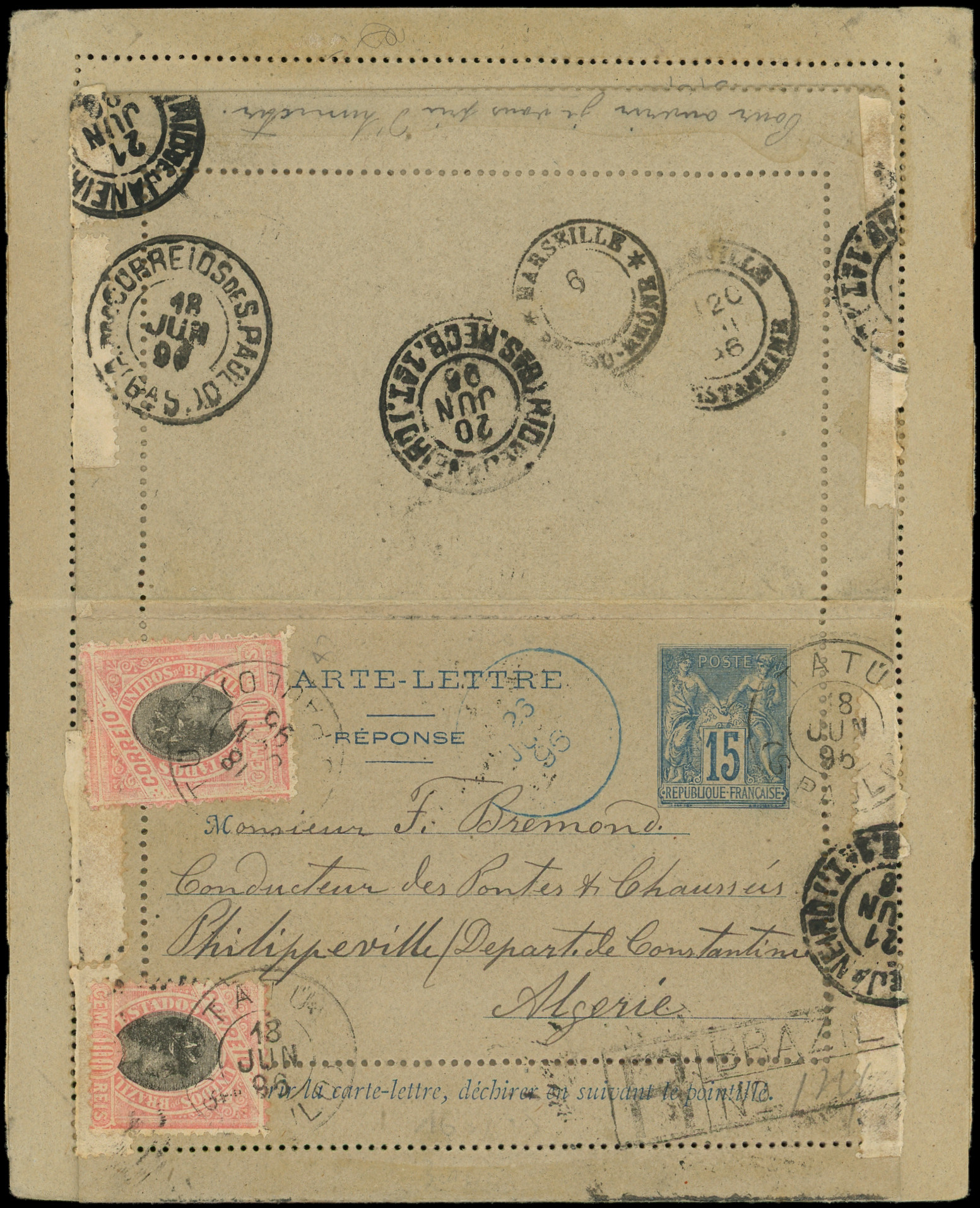 sur lilas s. CLRP 15c. bleu, obl. PHILIPPEVILLE 22/5/96 pour le BRESIL, réponse Rec. affr. avec 100c (2) obl. TATU 18/6, TB (Image) (Image2)