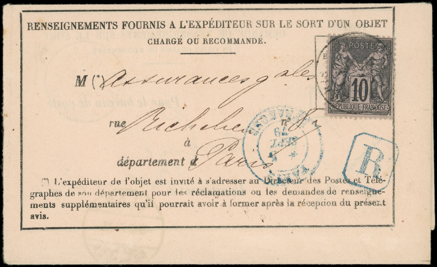 sur lilas, obl. càd PL. DE LA BOURSE 2/9/79 s. sort de chargement, càd bleu PARIS ETRANGER 5/9 et cachet R en bleu, TB (Image)