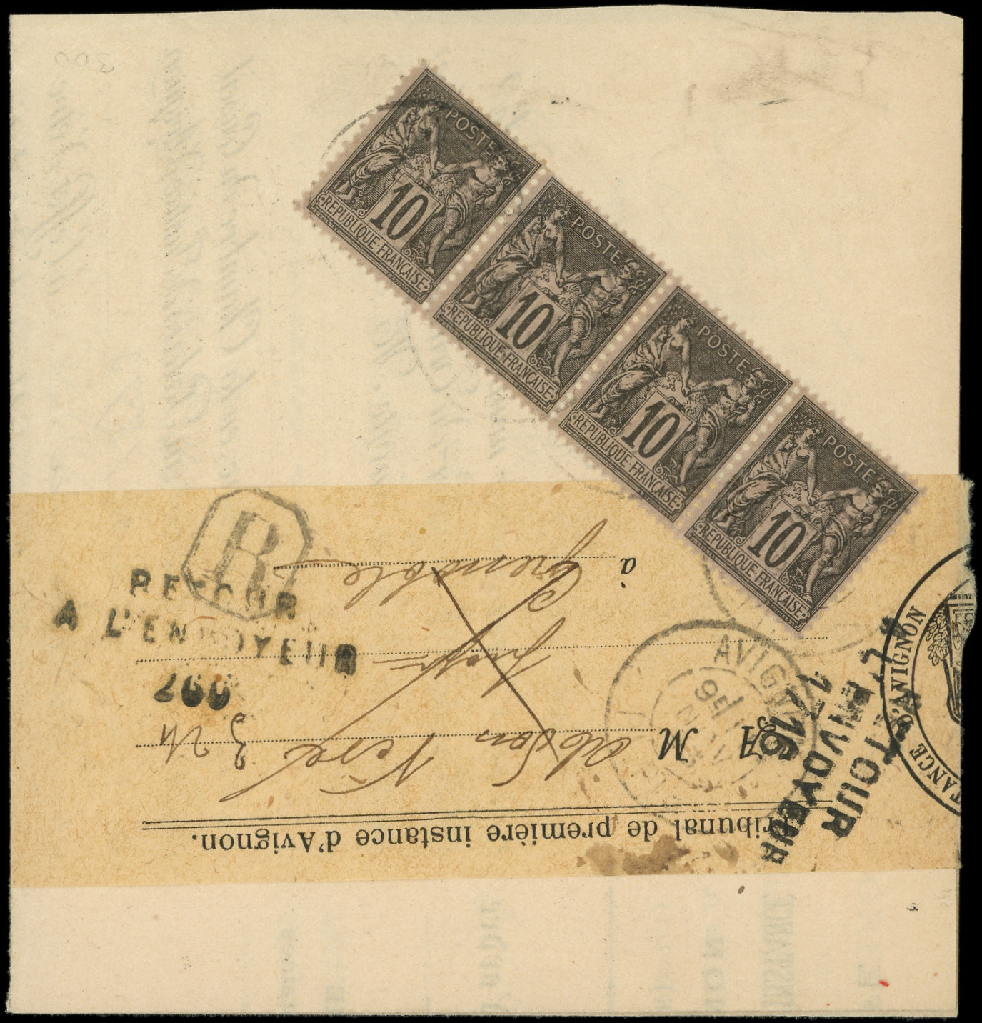 sur lilas, BANDE de 4 obl. càd AVIGNON 10/4/93 s. bande Rec. avec Imprimé, TB (Image)