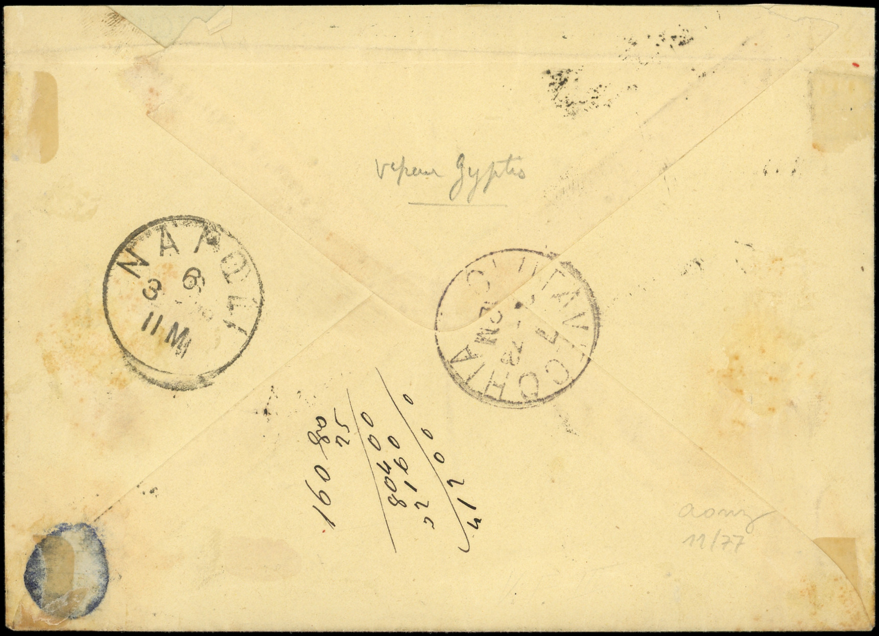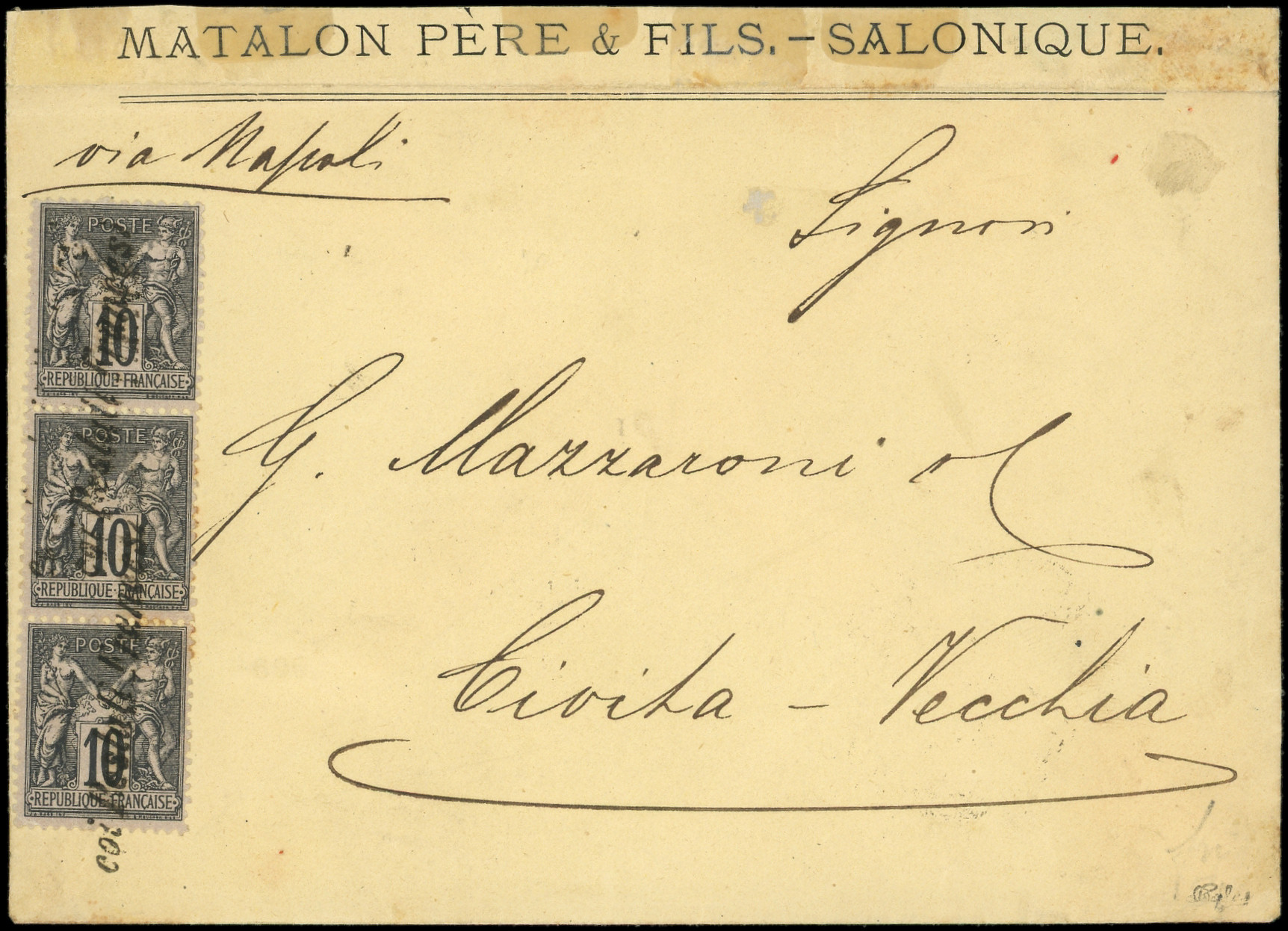 sur lilas, BANDE de 3 obl. griffe "Coi Postali Francesi" sur Env. de Salonique, arr. CIVITA VECCHIA 7/3/78, RR, TTB (Image) (Image2)