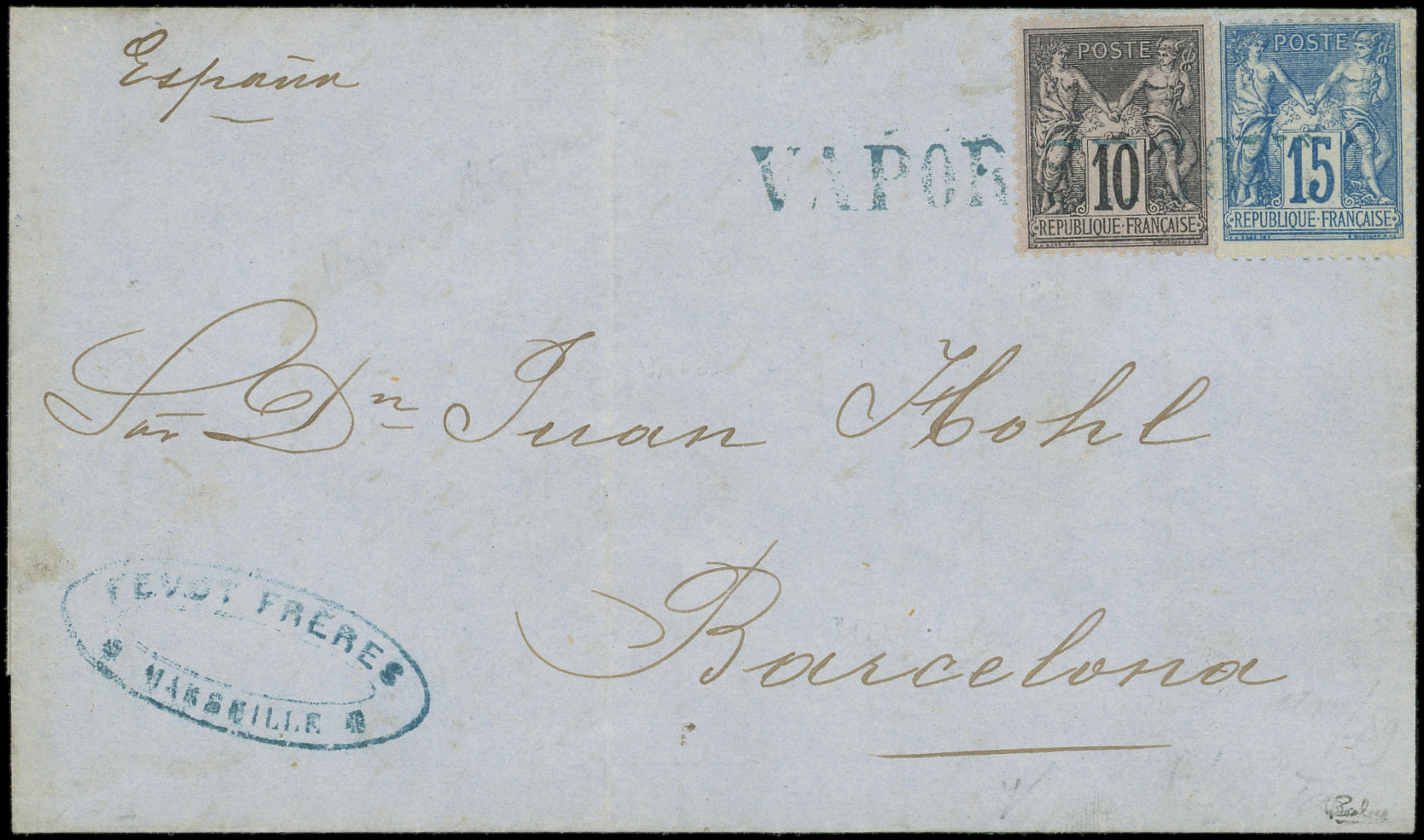 noir sur lilas et 15c. bleu obl. griffe bleue VAPOR SEGOV(IA) sur LAC de Marseille du 25/1/82 pour BARCELONE, RRR, TB. C (Image)