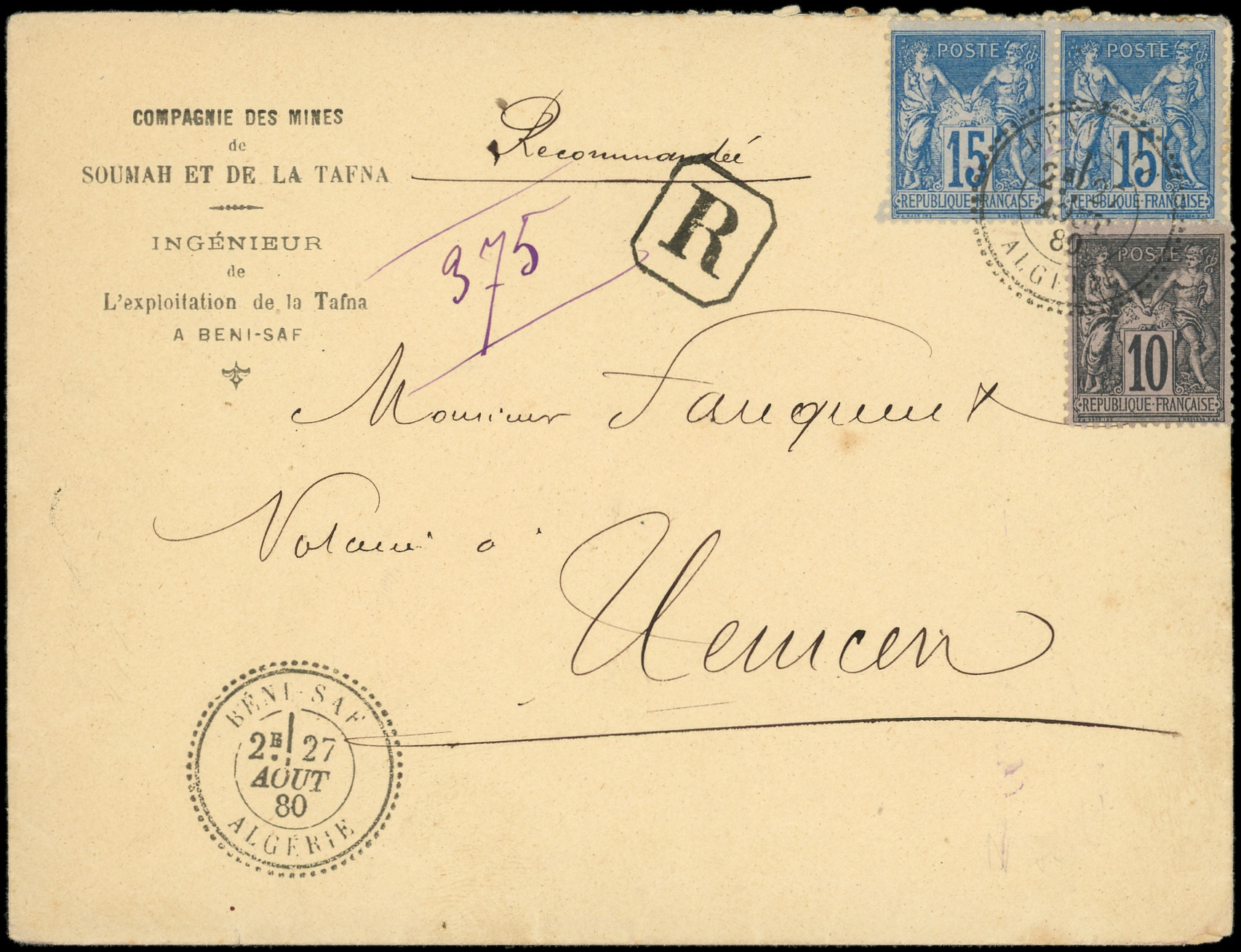 noir sur lilas et 15c. bleu PAIRE, obl. càd BENI-SAF 27/8/80 s. Env. Rec., Superbe (Image)