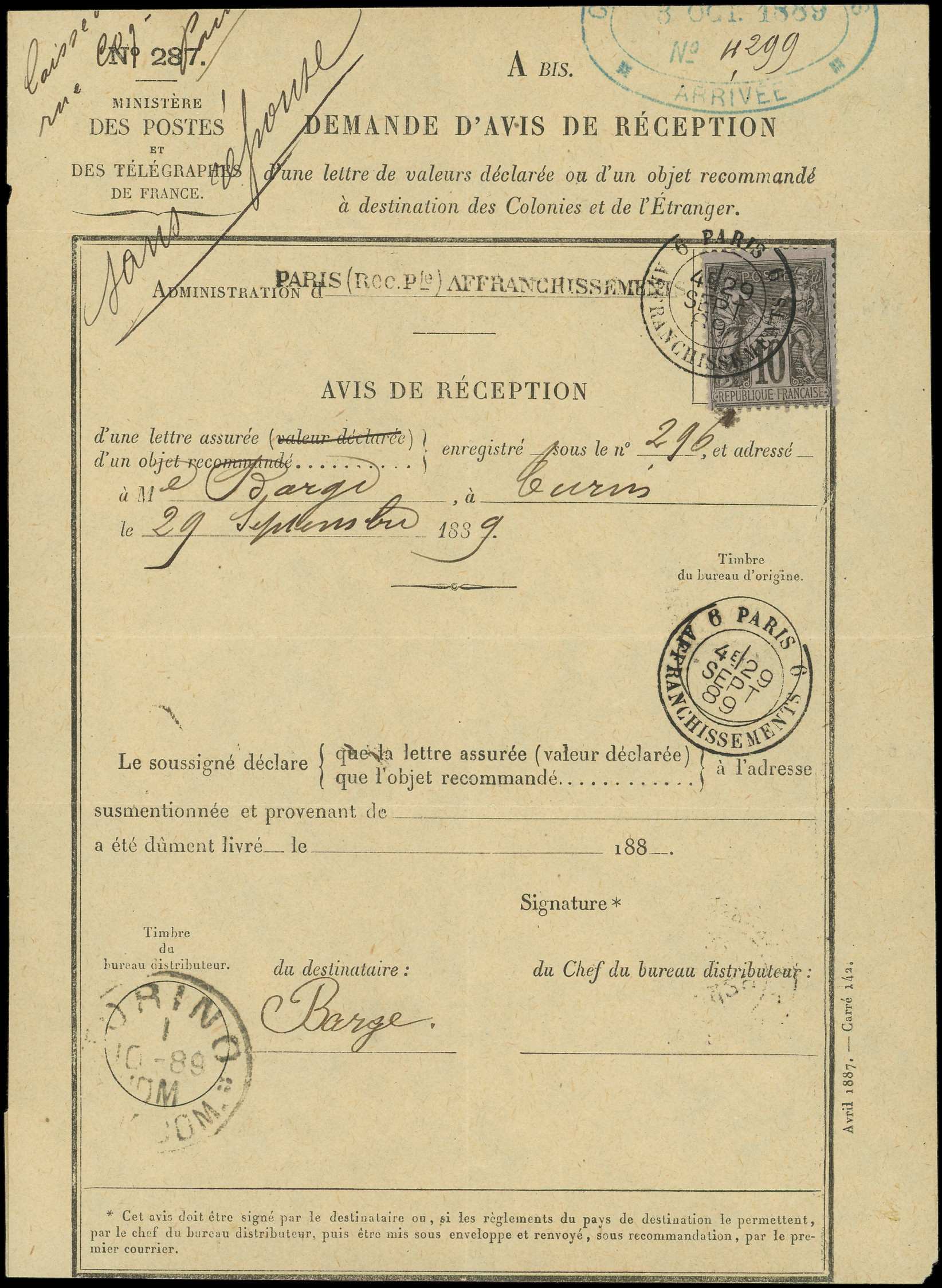sur lilas, obl. càd 6 PARIS 6/AFFRANCHISSEMENT 29/9/89 s. Avis de Réception, TB (Image)
