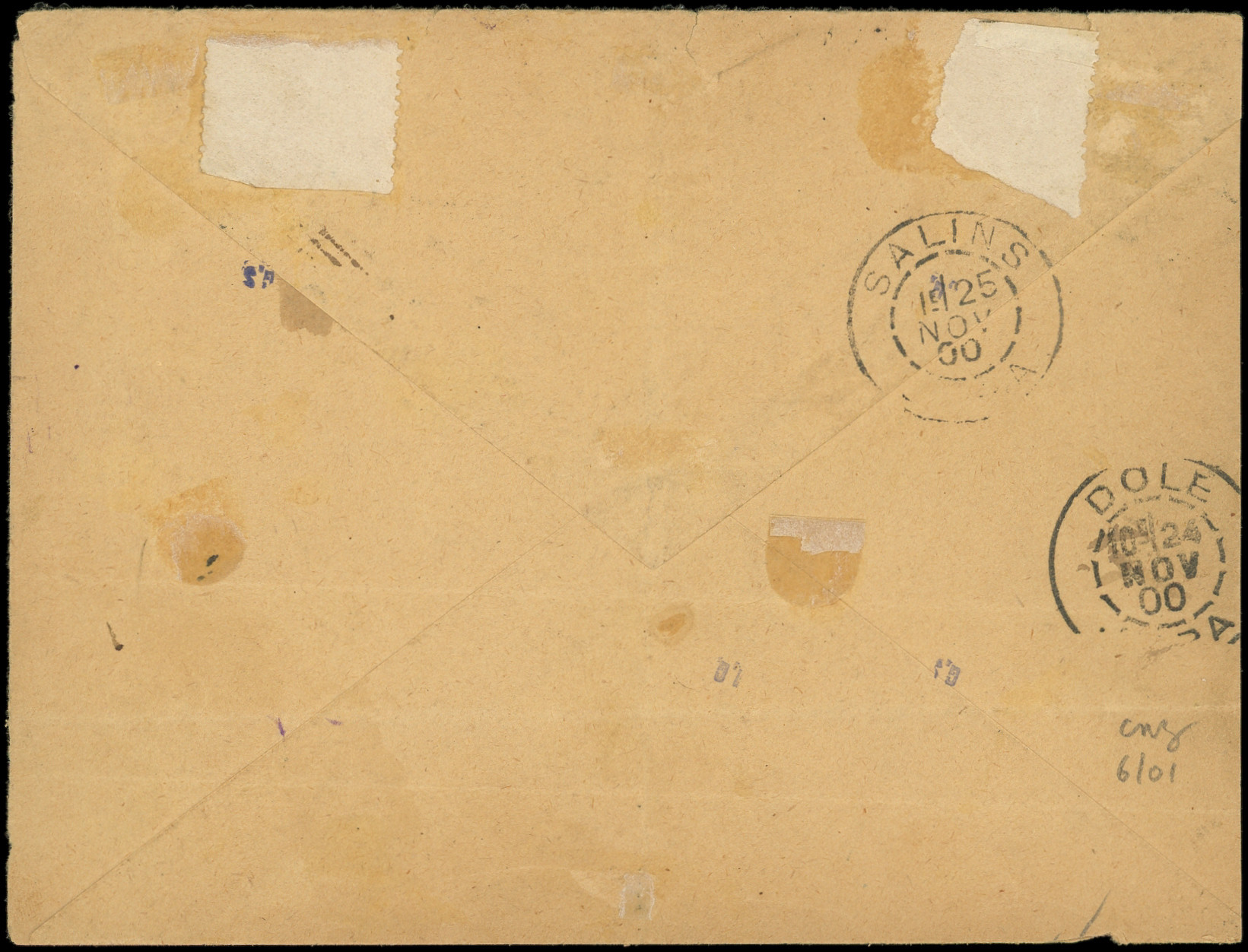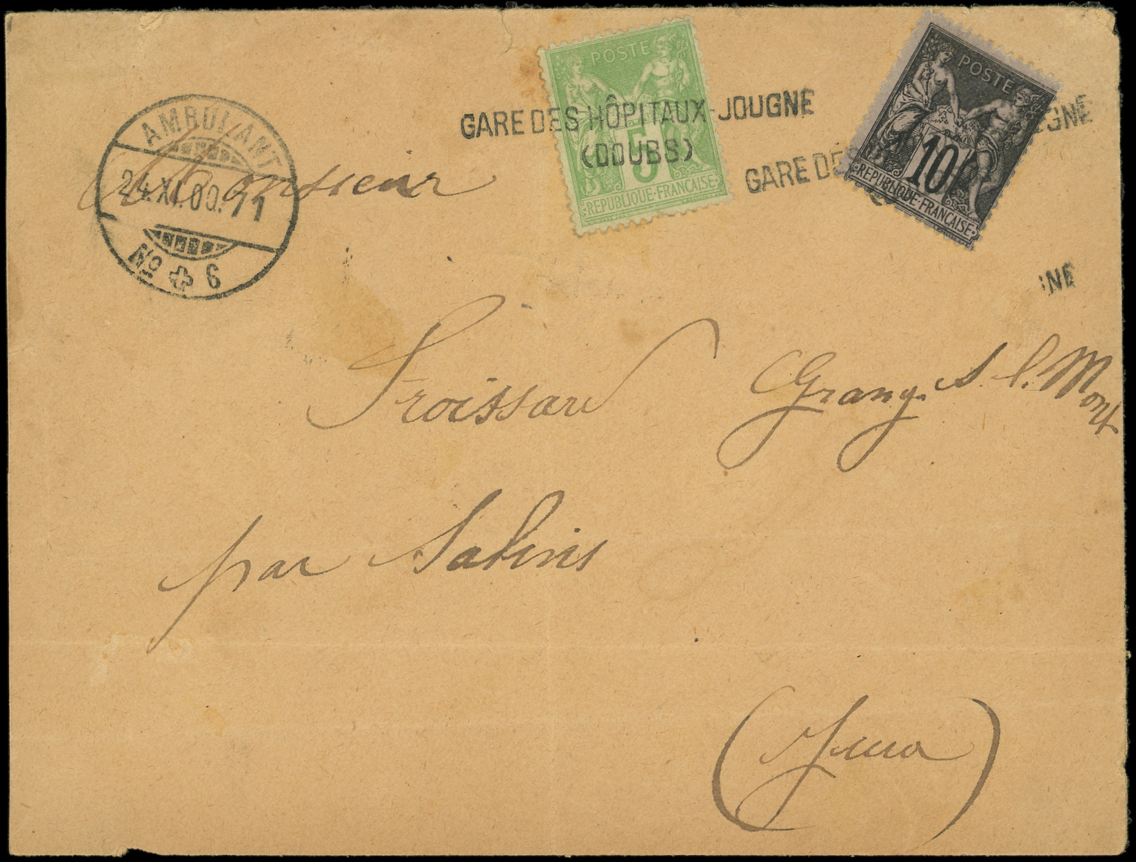 noir sur lilas et 5c. vert-jaune obl. griffe GARE DES HOPITAUX-JOUGNE/(DOUBS) s. Env., càd Suisse AMBULANT 24/11/00, arr. SALINS 25/11, TB (Image) (Image2)