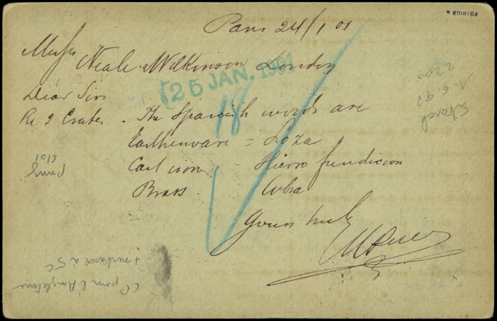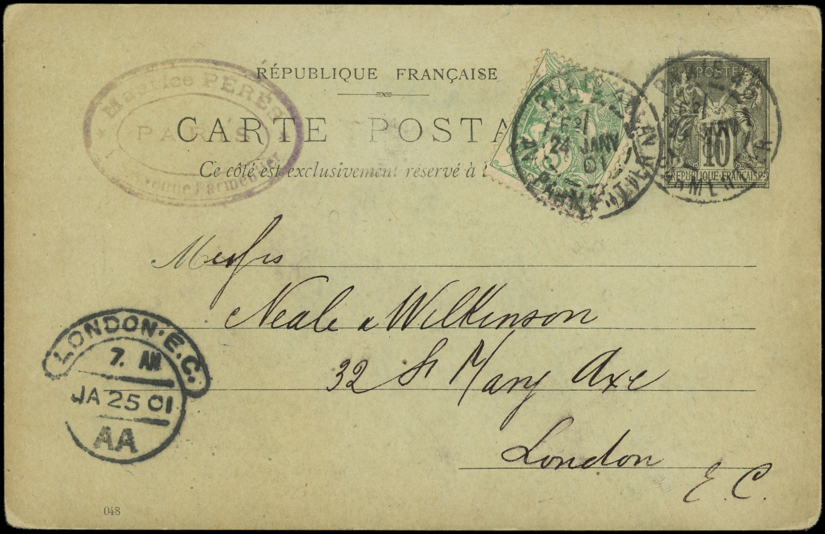 noir, carton vert, affr. N°111 obl. càd de LEX PARIS 46/AV. PARMENTIER E2 24/1/01, arr. LONDRES le 25/1, TB (Image) (Image2)