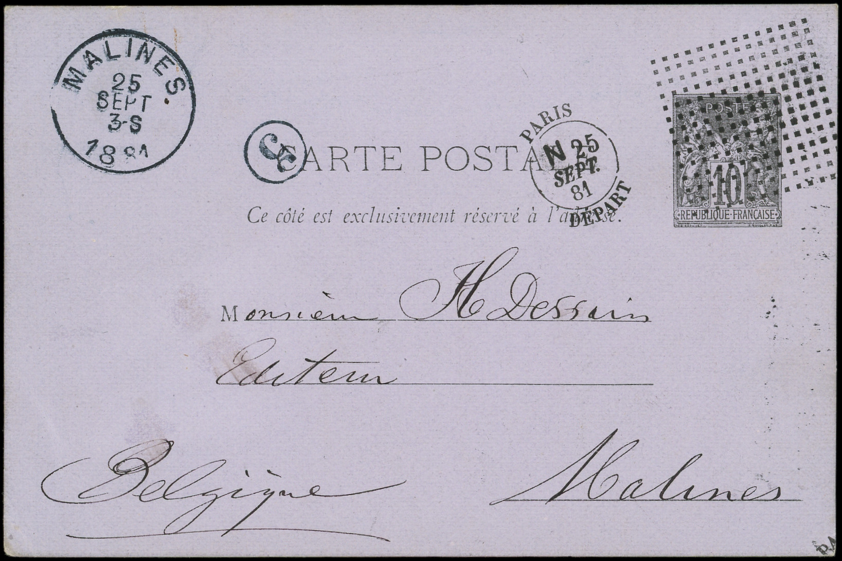 noir, carton violet, obl. carré de 168 points et càd PARIS/DEPART N 25/9/81 (Cérès N°1), arr. MALINES 25/9, Superbe (Image) (Image2)
