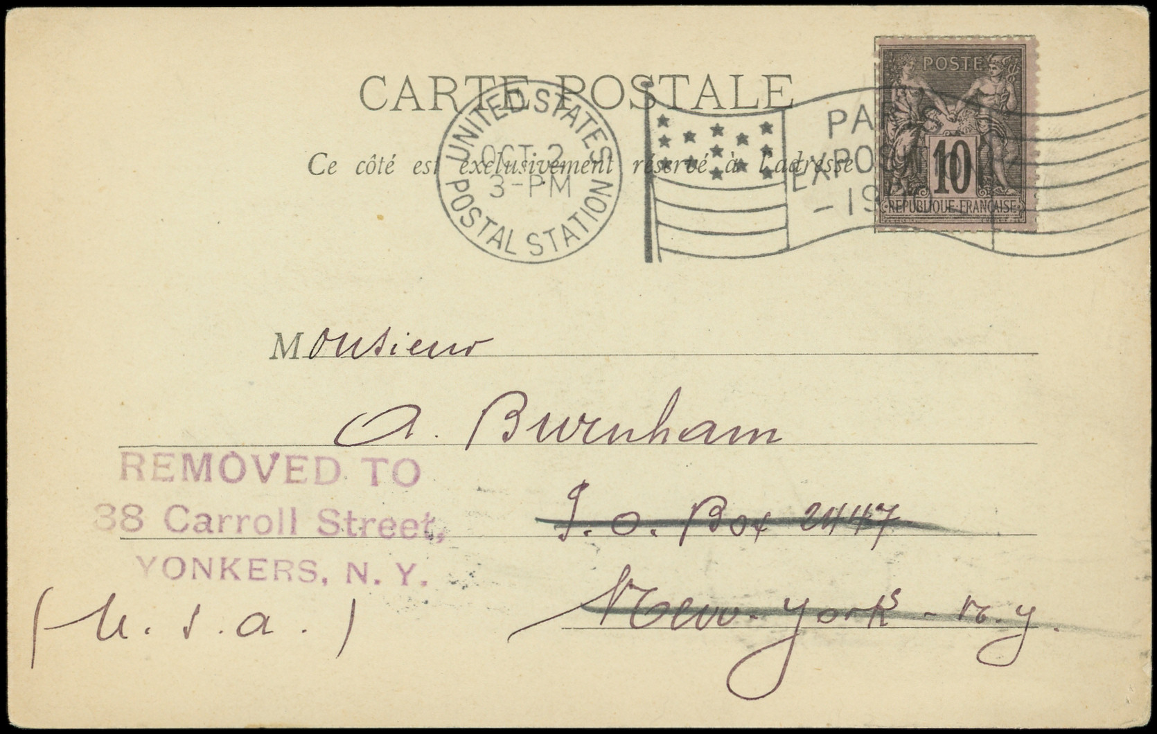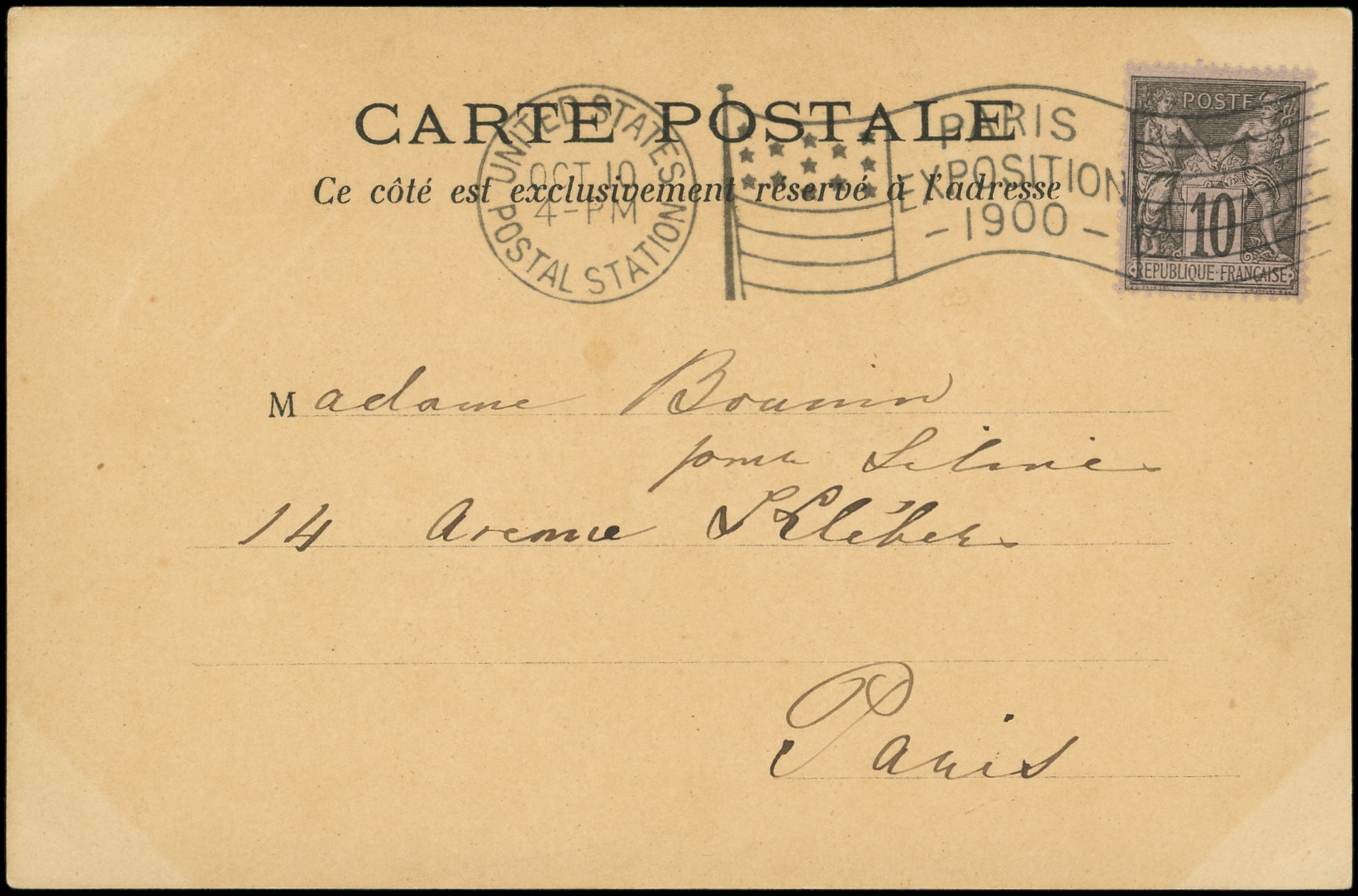 sur lilas, obl. méc. UNITED STATES/POSTAL STATION 2/10 PARIS EXPOSITION 1900 s. CP, arr. aux ETATS UNIS le 12/10, TB (Image) (Image2)