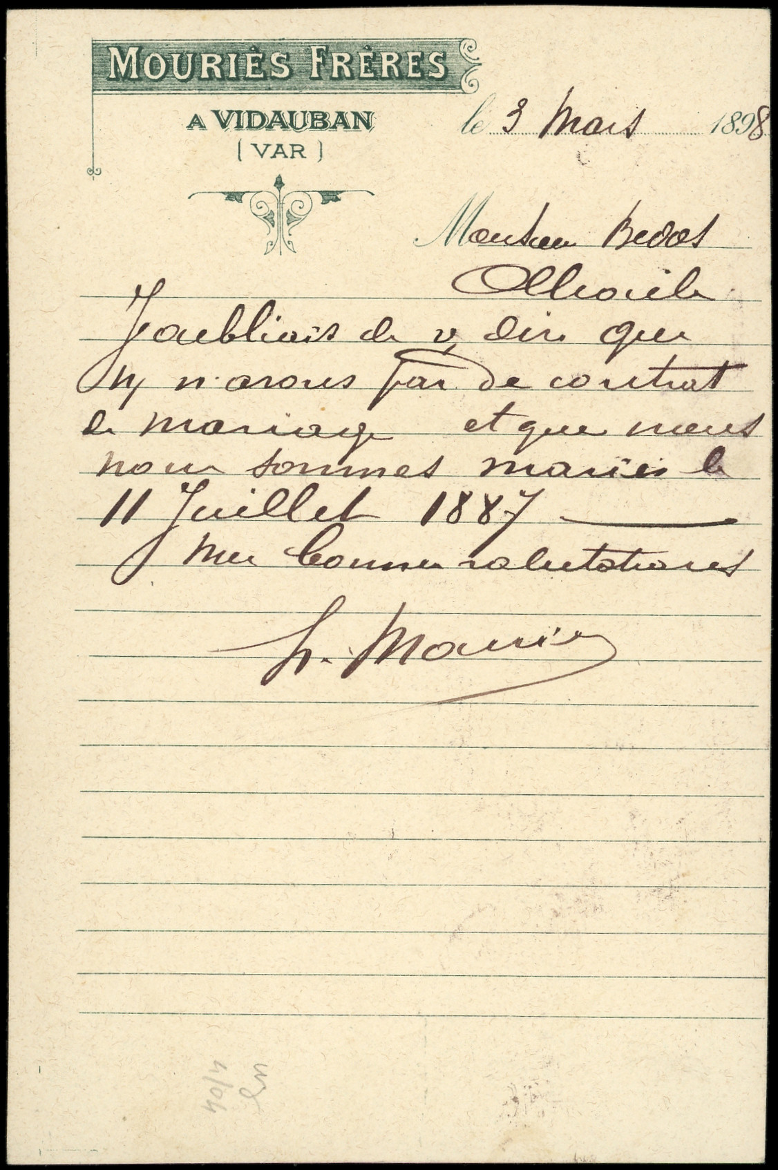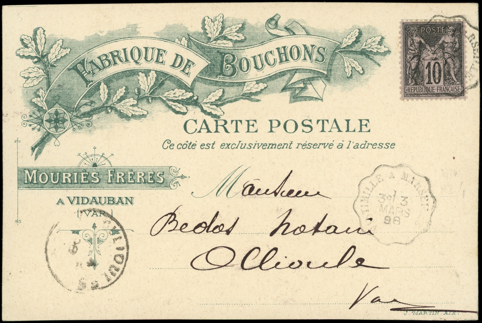 sur lilas, obl. càd Conv. VINTIMILLE A MARSEILLE 3/3/98 s. CP Fabrique de Bouchons, TB (Image) (Image2)