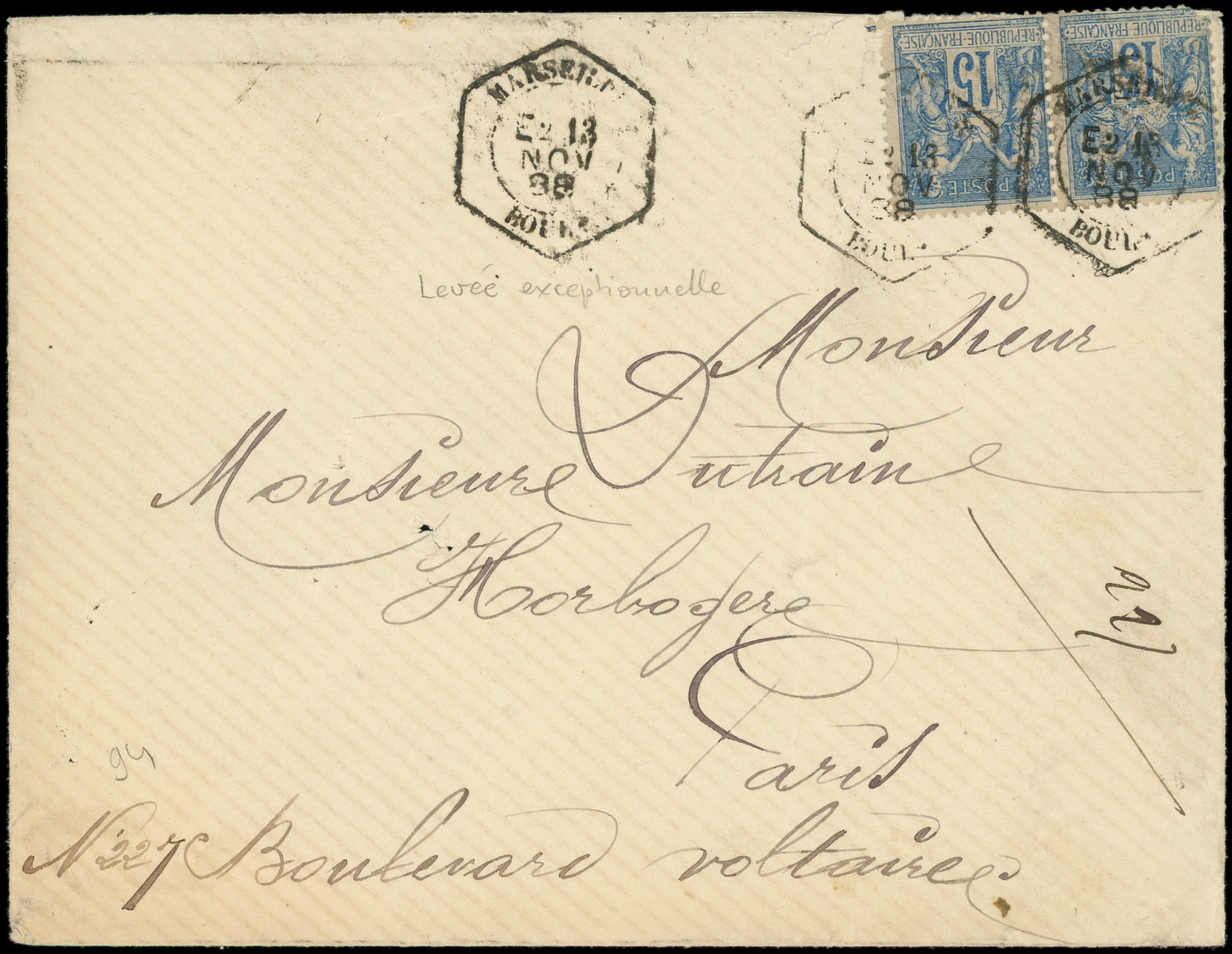 PAIRE (1 ex. défx), obl. càd Hexag. de LEX MARSEILLE/BOURSE E2 13/11/88 s. Env., TB (Image)