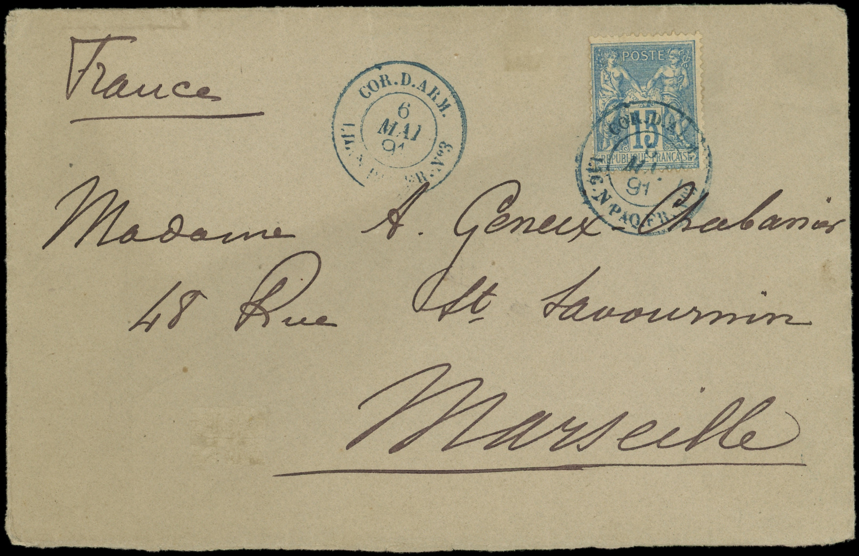 obl. càd bleu CORR. D.ARM./LIG. N PAQ FR. N°3 6/5/91 s. Env. arr. MARSEILLE 6/6, TB (Image)