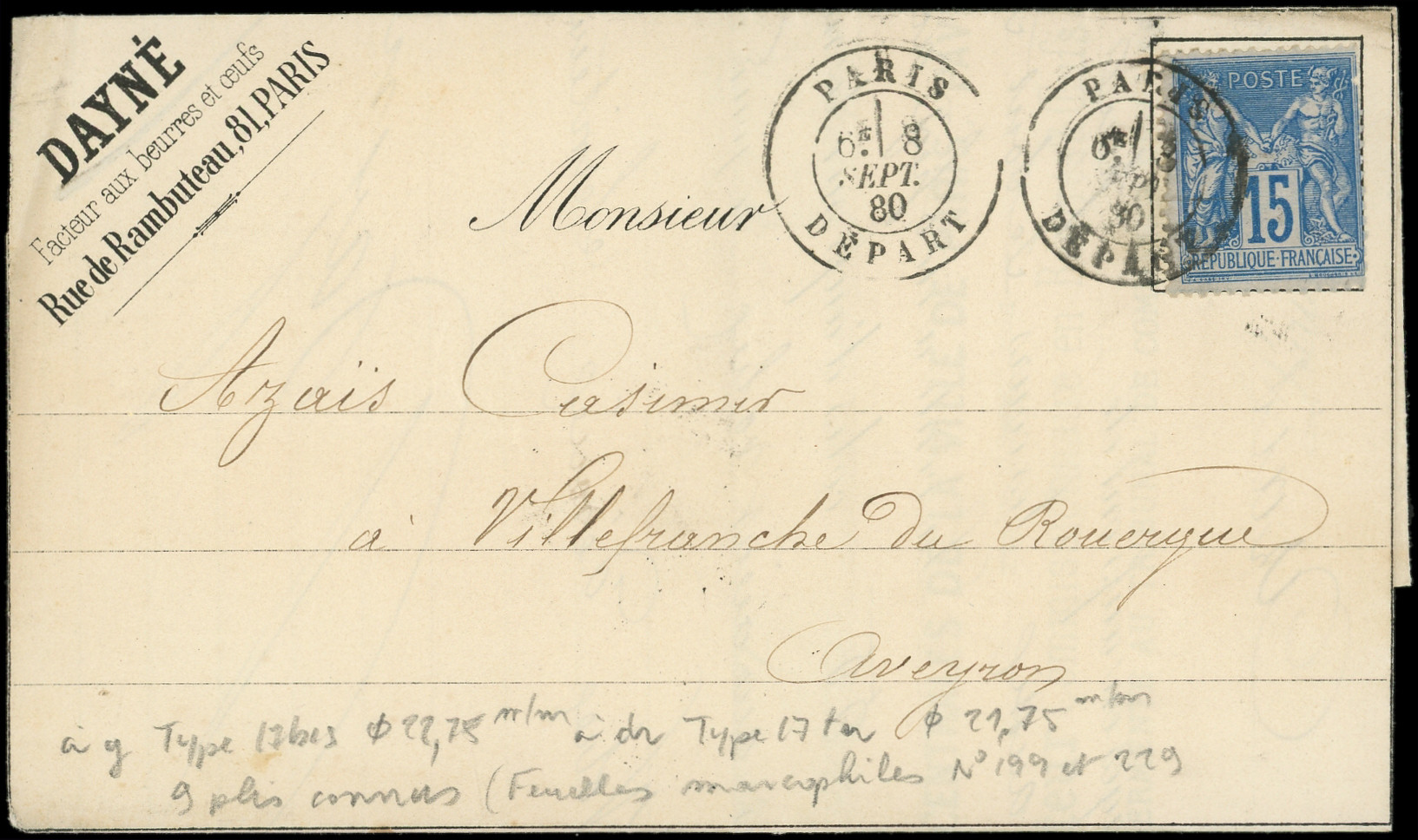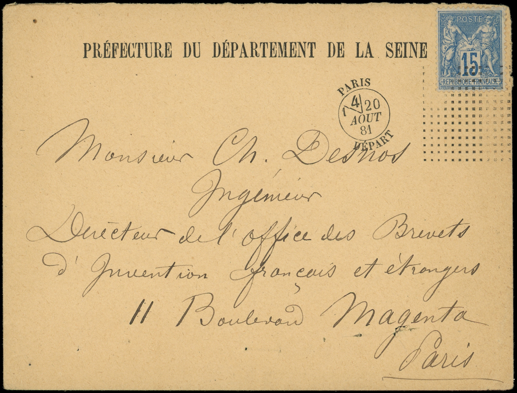 obl. cachet d'Essai CARRE de points PARIS/DEPART 20/8/81 avec section de Levée sur Env., TB (Image)