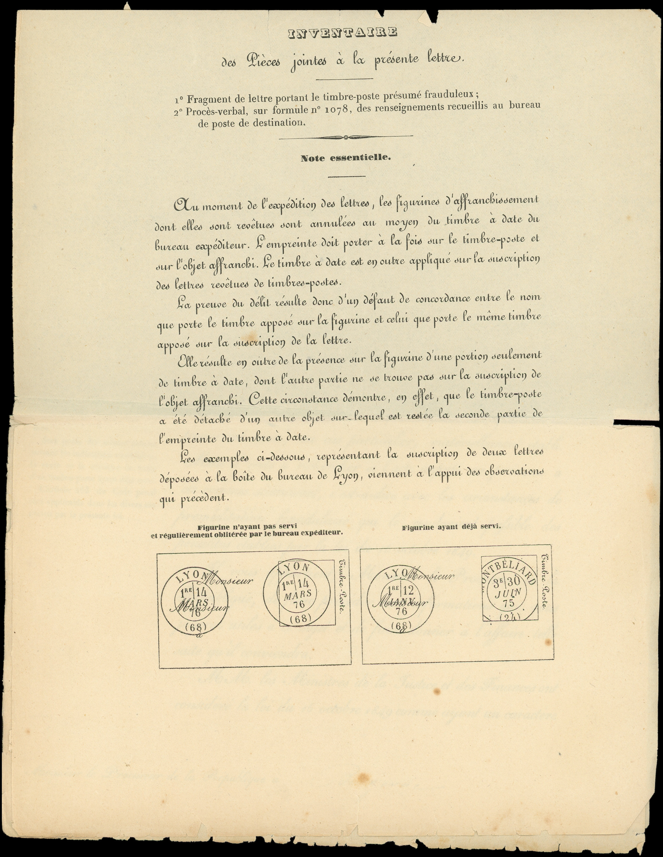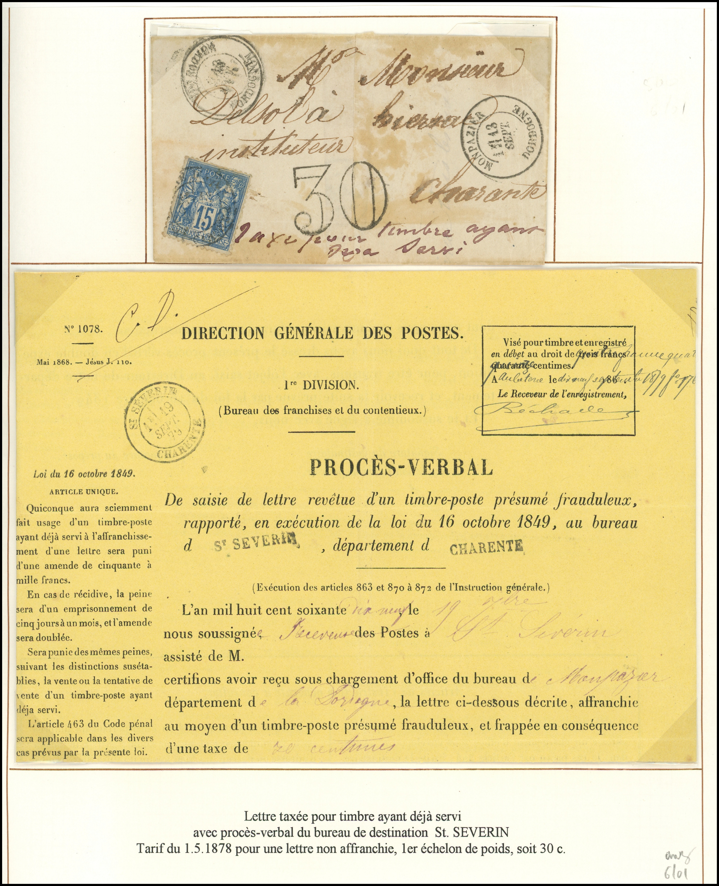 obl. s. Env., Taxe 30 mention "Taxe pour timbre ayant déjà servi" + dossier de St Severin 19/9/79, TB (Image) (Image2)