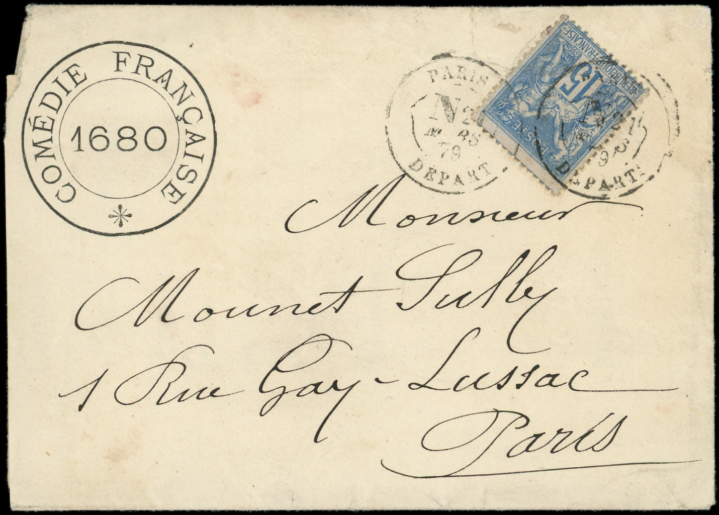 obl. càd PARIS/DEPART grand N 24/3/79 s. Env. avec courrier de la Comédie Française, RR, TB (Image)