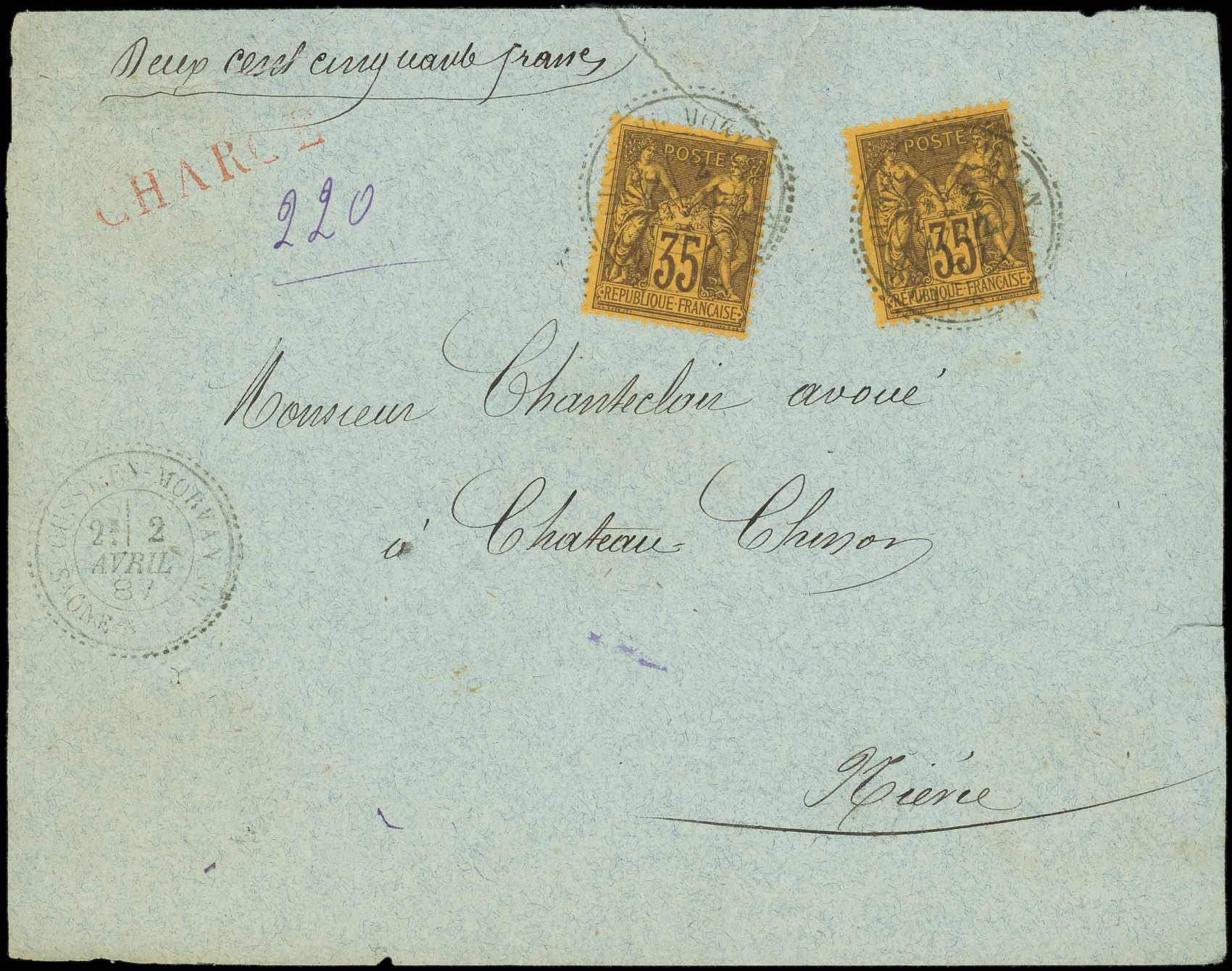 noir sur jaune, 2 ex. obl. càd T25 CUSSY-EN-MORVAN 2/4/87 s. Env. CHARGE, TB (Image)
