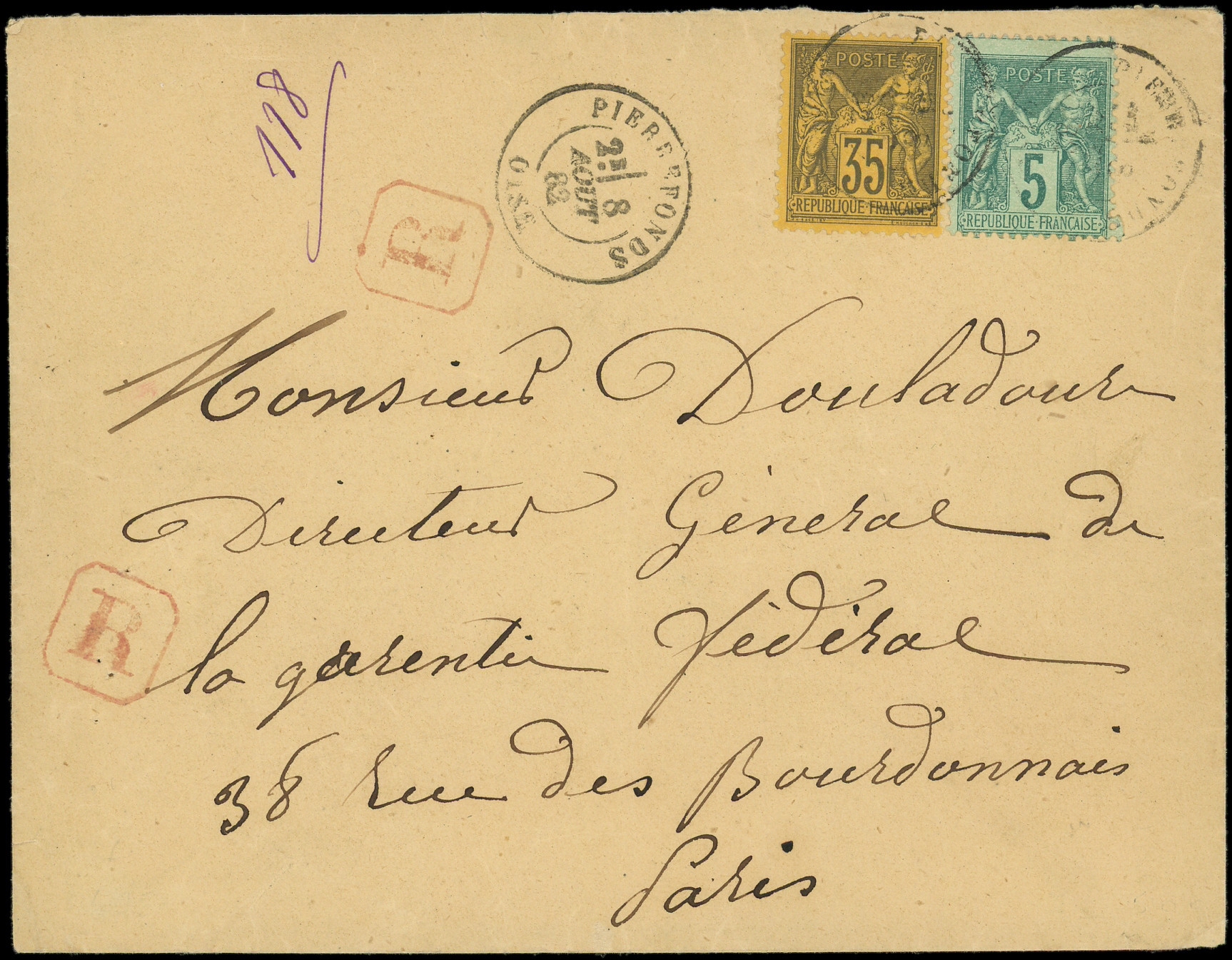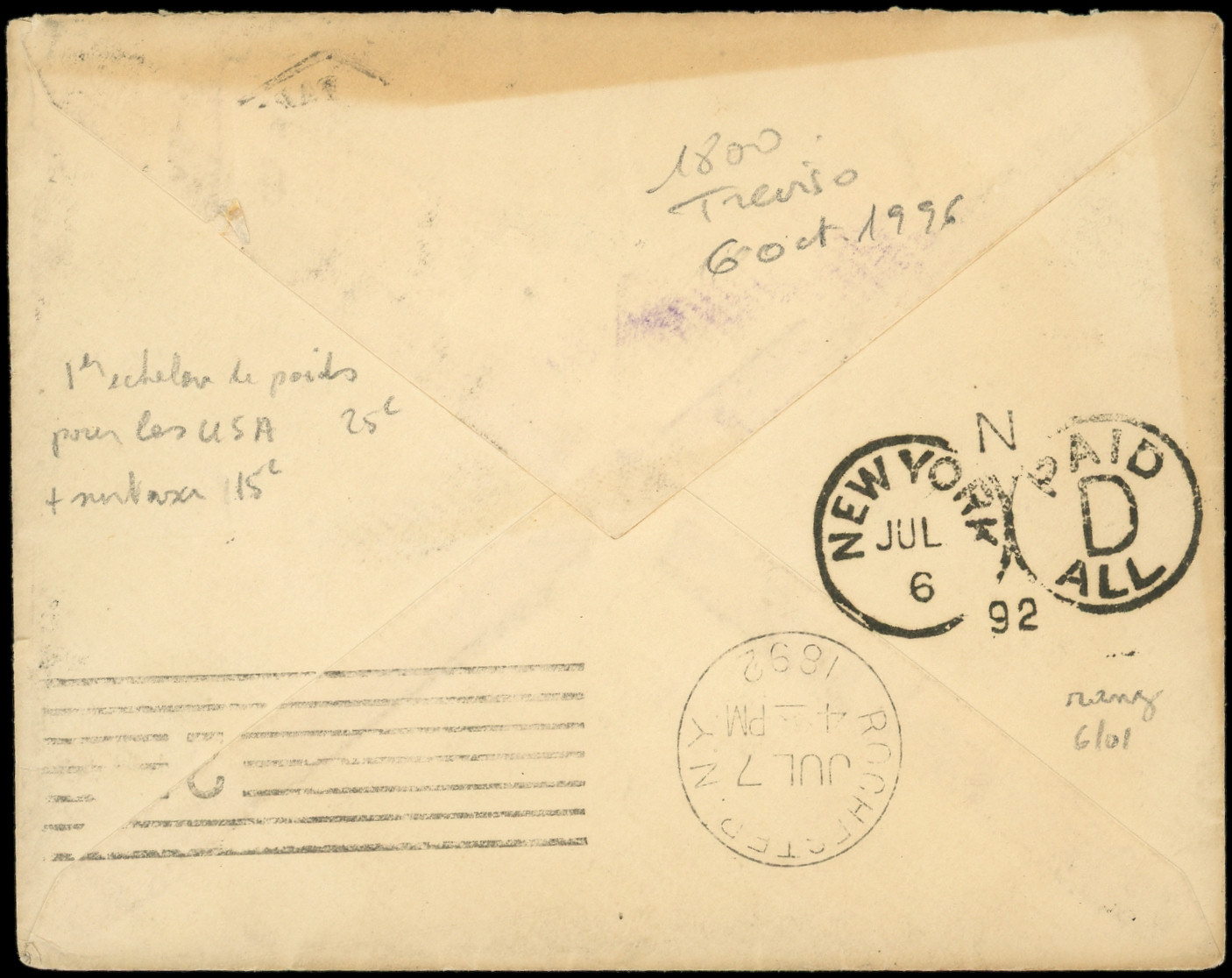 rouge-orange, obl. càd Hexag. R. DES CAPUCINES N 28/6/92 s. Env., arr. aux ETATS-UNIS le 6/7, TB (Image) (Image2)