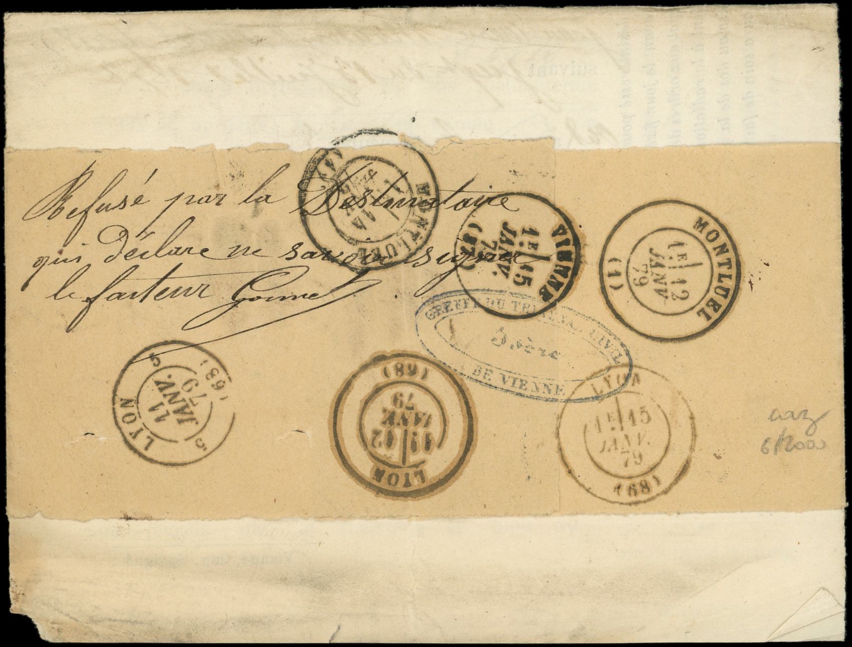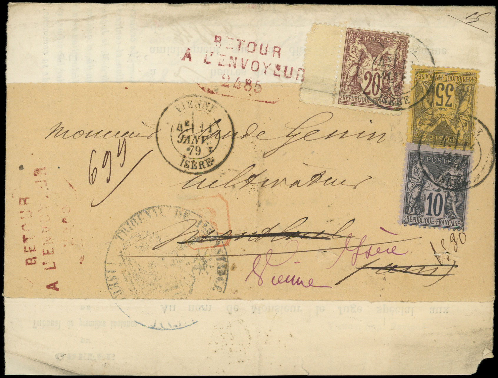 noir sur jaune, N°67 20c. brun-rouge et N°89 10c. noir sur lilas, tous obl. càd T18 VIENNE 11/1/79 s. bande avec Imprimé, cachet de Retour 2485, TB (Image) (Image2)