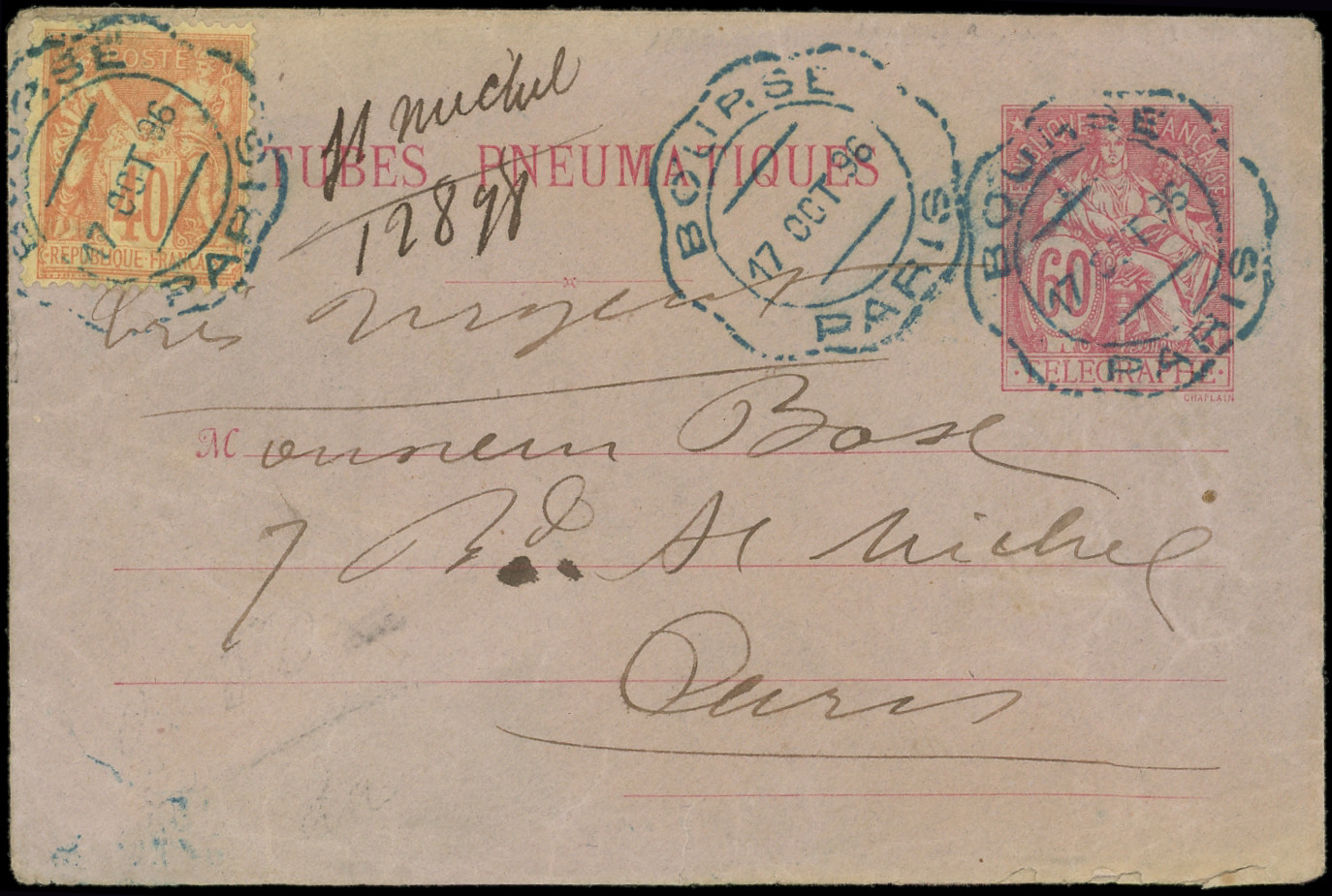 rouge-orange sur Env. Entier Pneu 60c. rose obl. càd ondulé bleu BOURSE/PARIS 17/10/96, TB (Image)