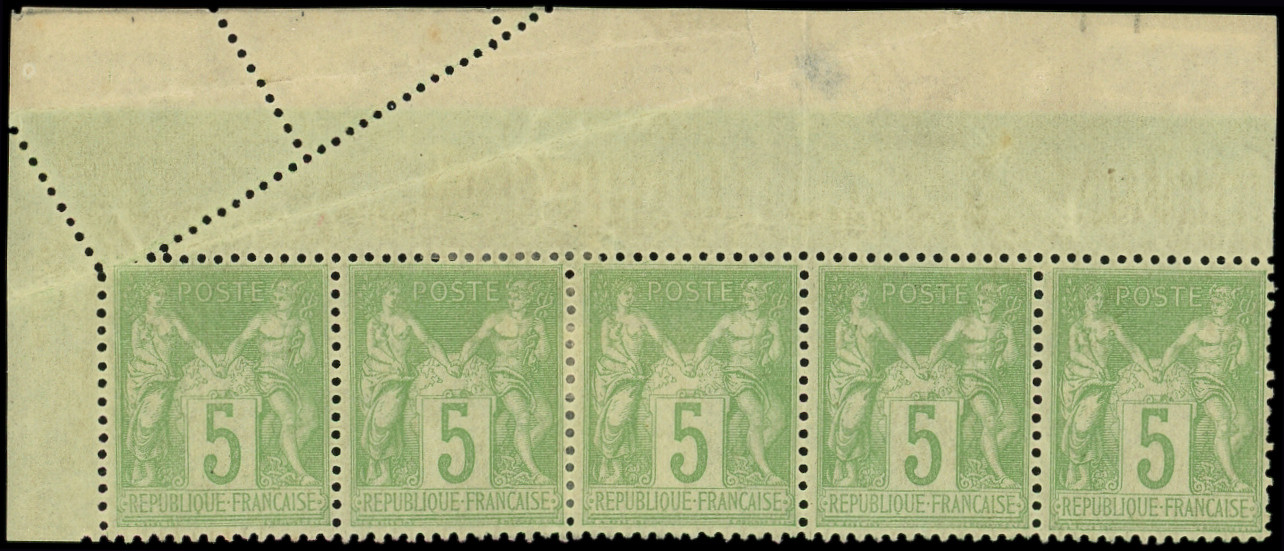 vert-jaune, BANDE de 5 cdf avec Variété de PIQUAGE, 2 ex. normaux *, TB (Image)