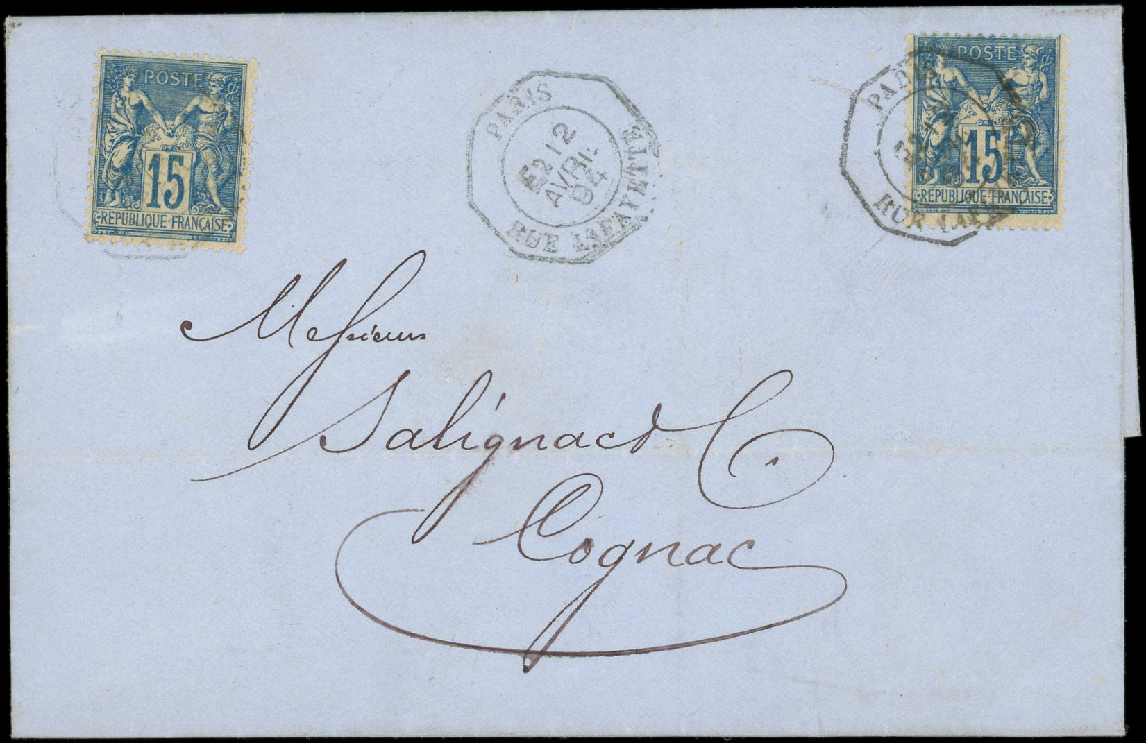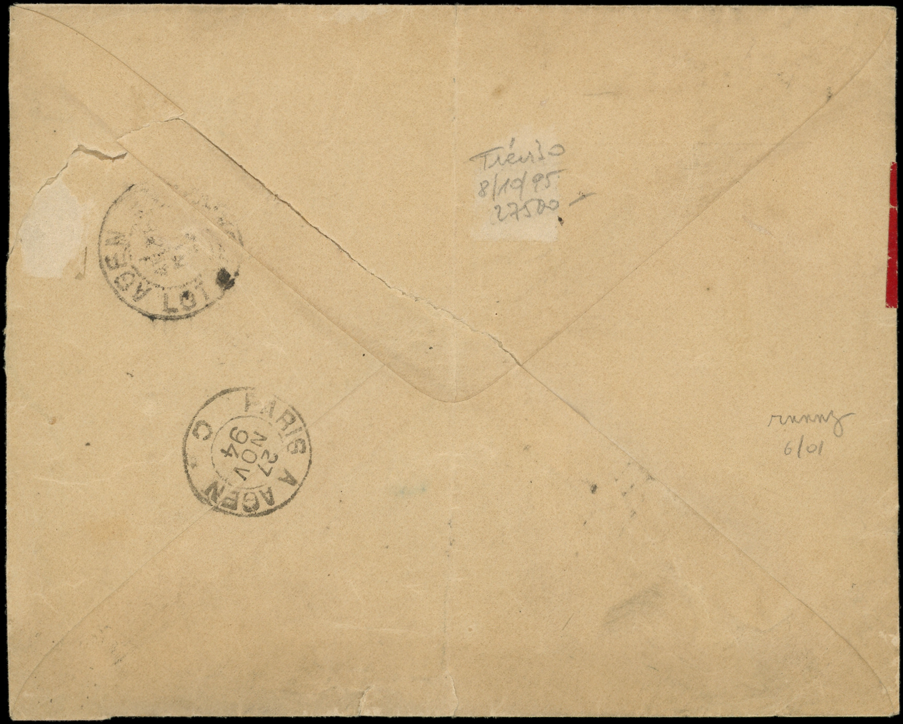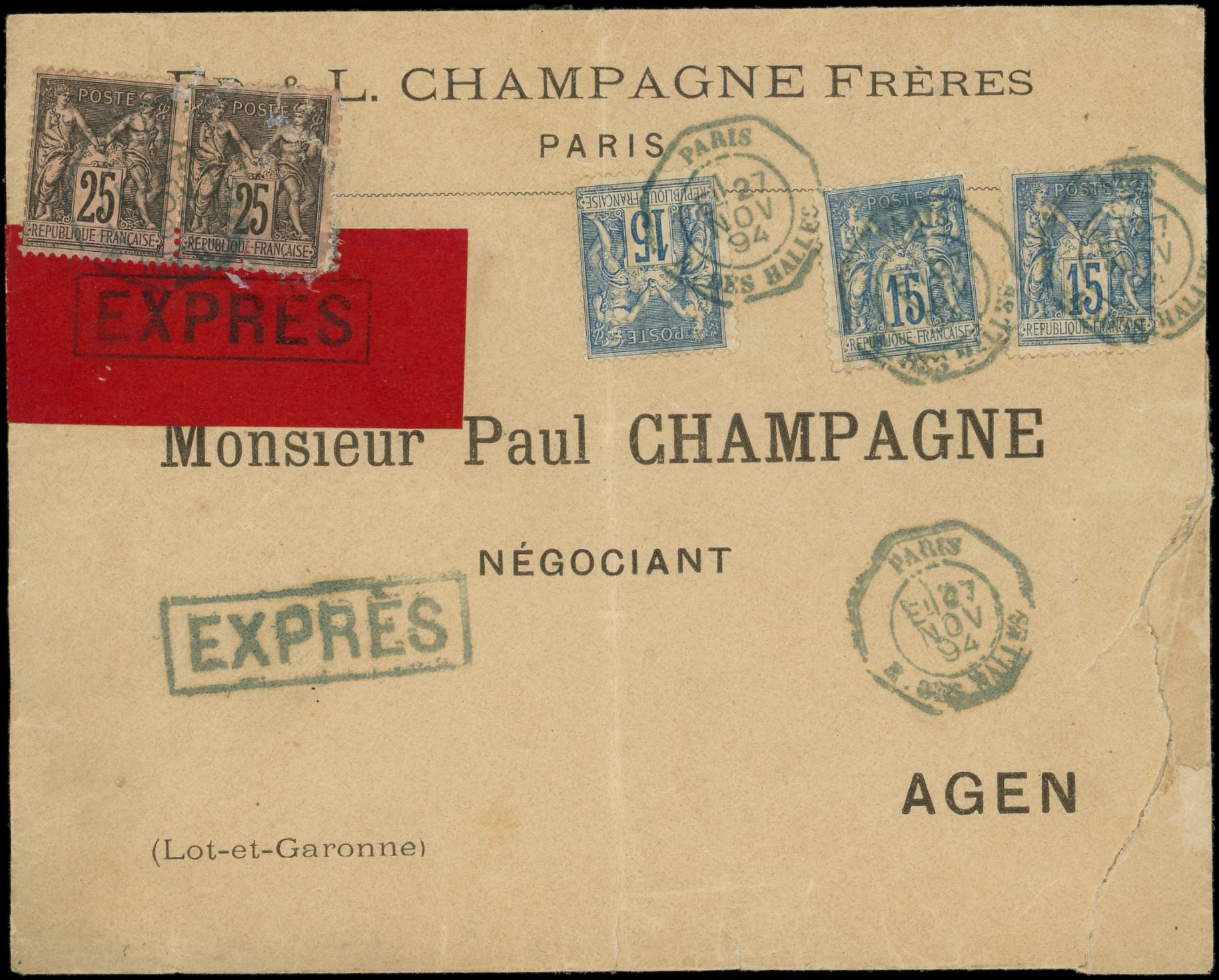(3) et N°97 25c. noir sur rose PAIRE obl. càd Octog. bleu de LEX R. DES HALLES E1 27/11/94 sur Env. en EXPRES, arr. AGEN, RRR, TB (Image) (Image2)