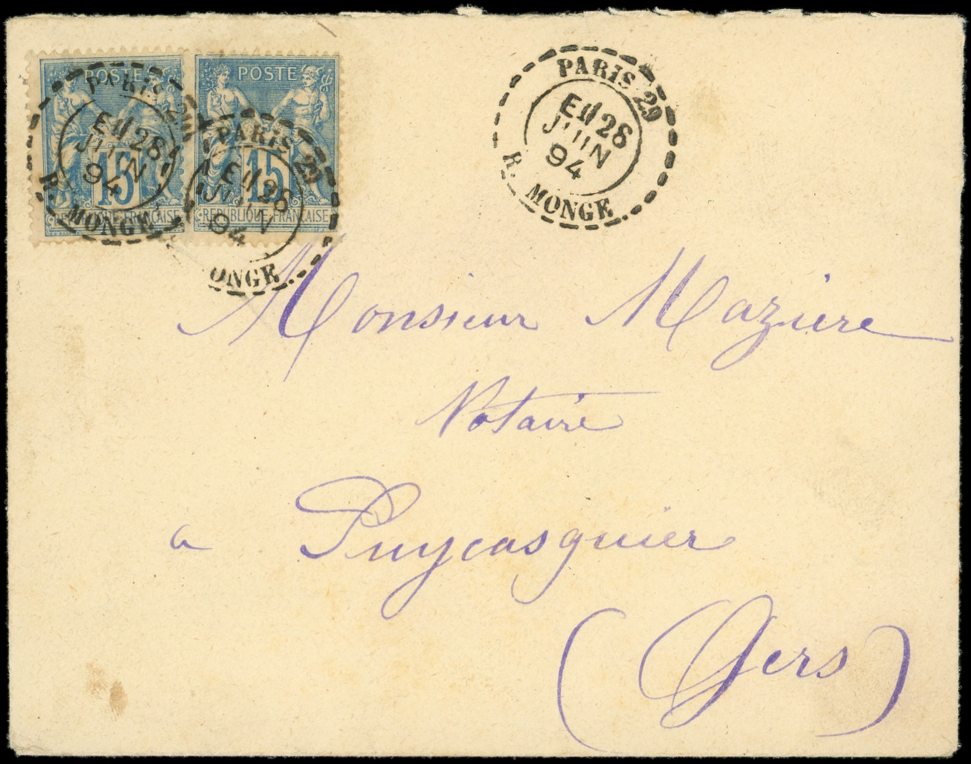 (2) obl. càd de LEX (cercle extérieur pointillés) PARIS 29/R. MONGE E1 28/6/94 s. Env., RR et TTB (Image)