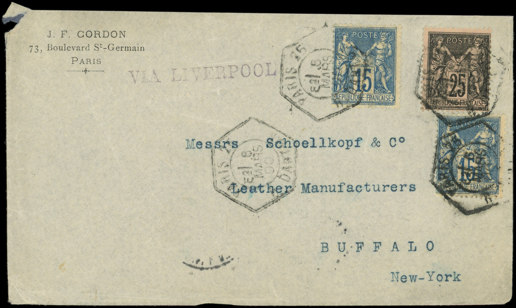 (2) et N°97 25c. noir s. rose obl. càd Hexag. de LEX PARIS 75/R. DANTON E2 6/3/00 s. Env., arr. BUFFALO 16/3, TB (Image) (Image2)