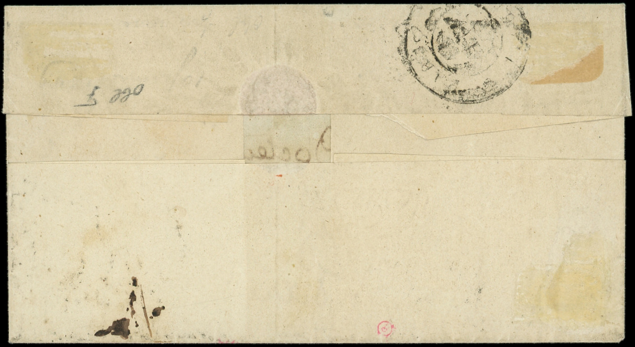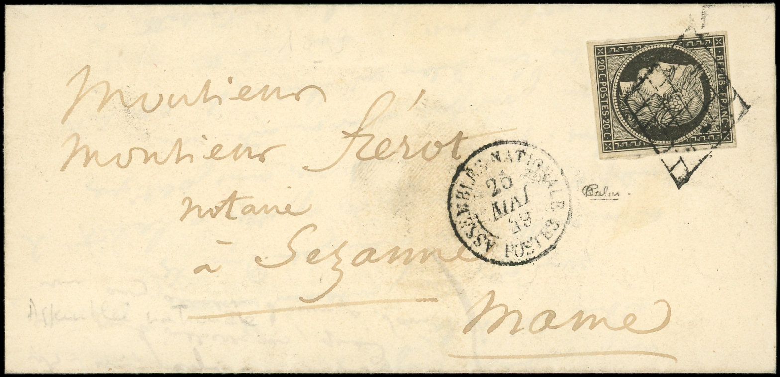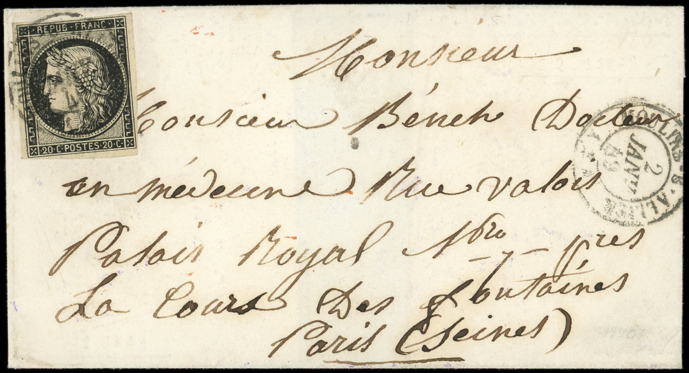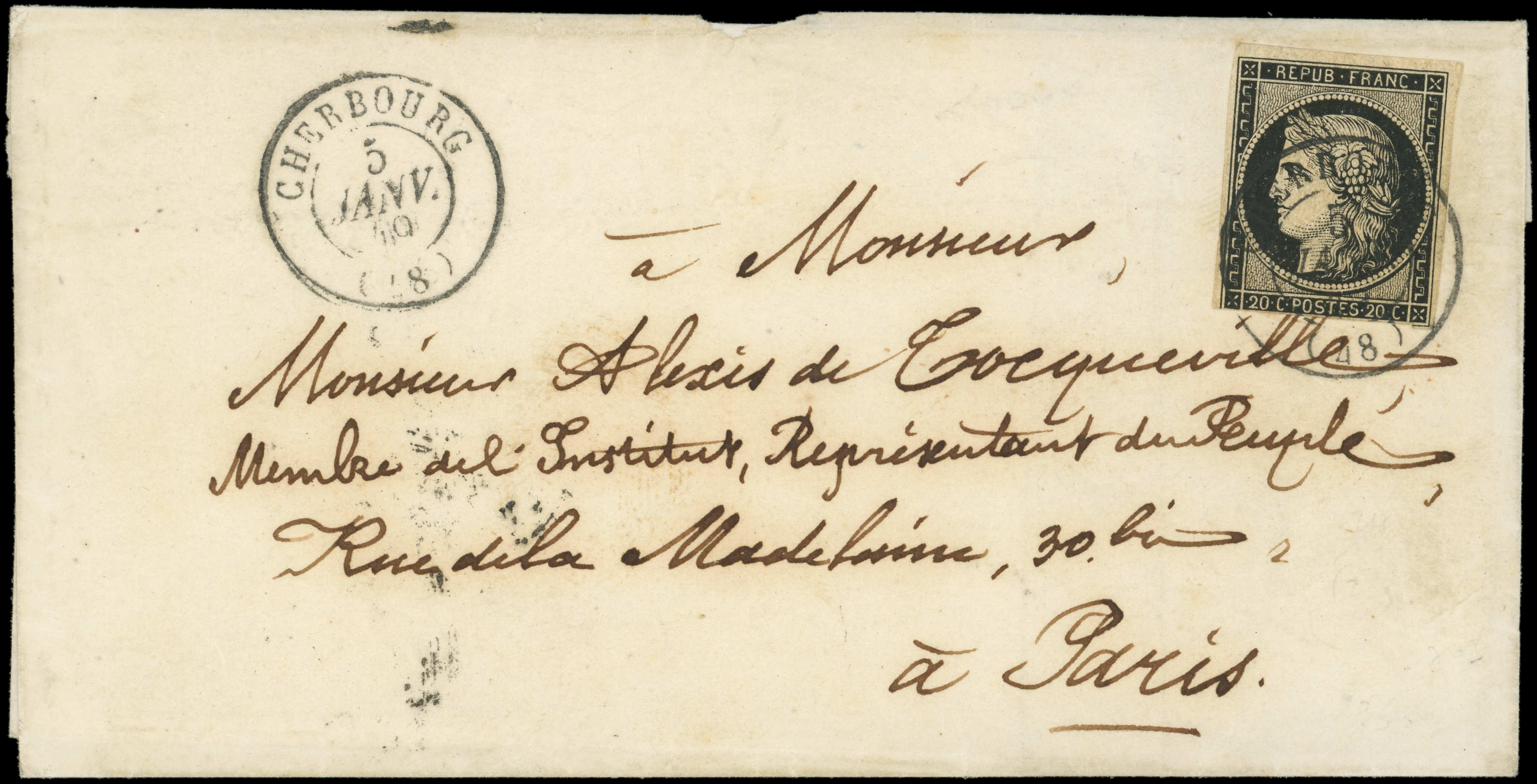 jaune, touché en bas, obl. càd T15 CHERBOURG 5 JANV 49 répété à côté s. LSC adressée à Alexis de TOCQUEVILLE, écrivain, ministre des Affaires Etrangères de Napoléon III, arr. Paris, pièce d'amateur, frappes TTB (Image)