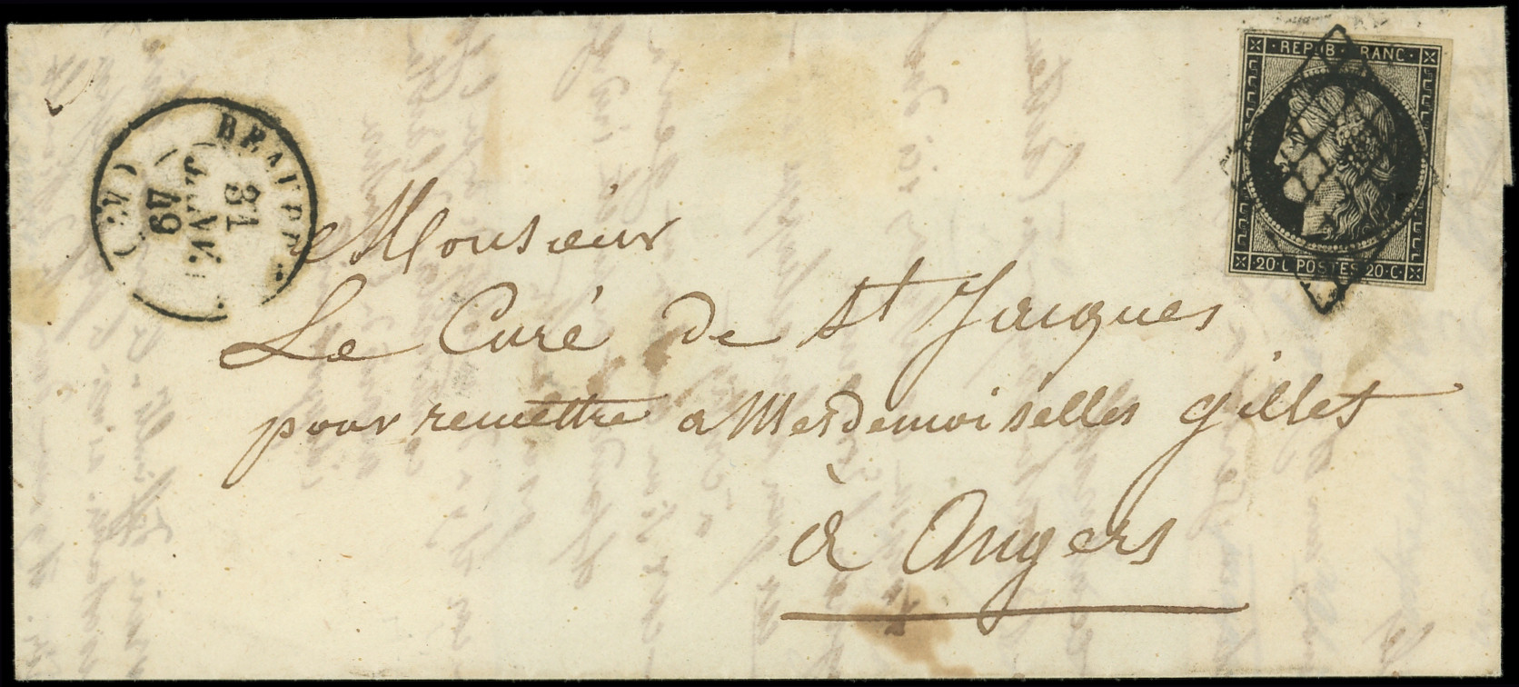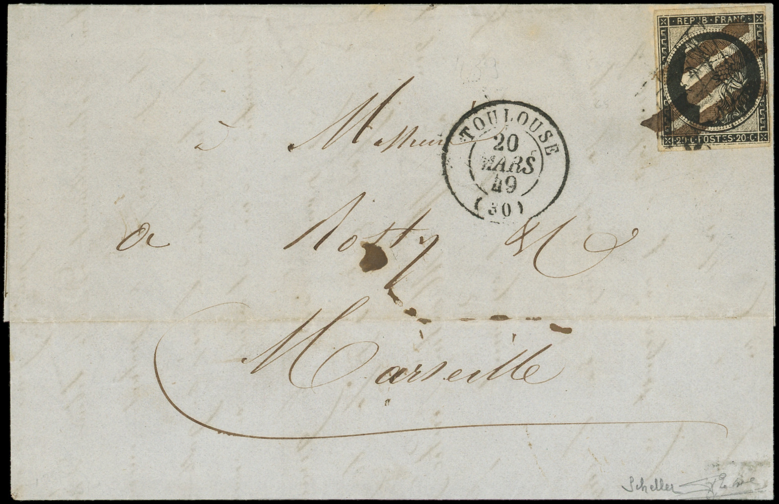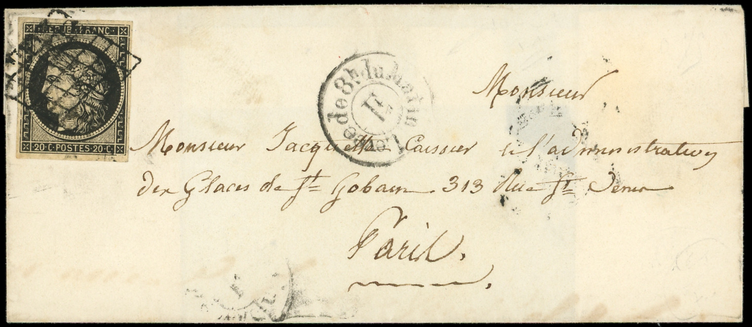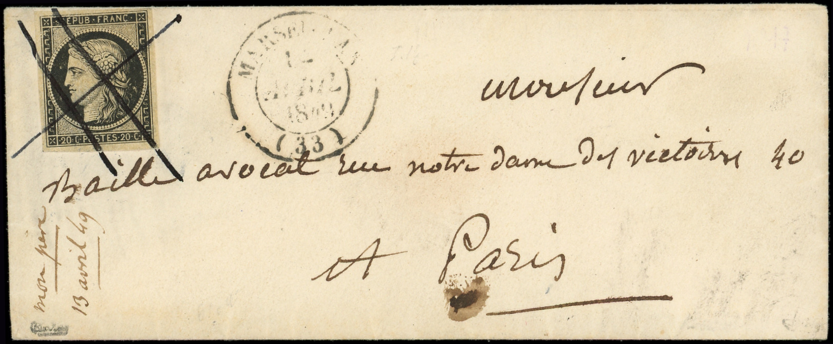 jaune, touché en bas, obl. càd T15 CHERBOURG 5 JANV 49 répété à côté s. LSC adressée à Alexis de TOCQUEVILLE, écrivain, ministre des Affaires Etrangères de Napoléon III, arr. Paris, pièce d'amateur, frappes TTB (Image)