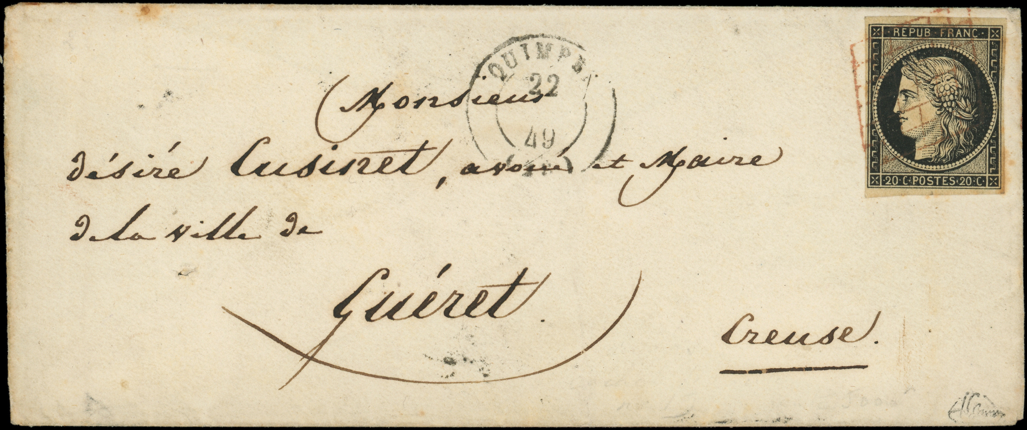 jaune, obl. GRILLE ROUGE s. Env., càd T15 QUIMPER 22 (JANV) 49, arr. GUERET 25/1, TTB, certif. JF Brun (Image) (Image2)