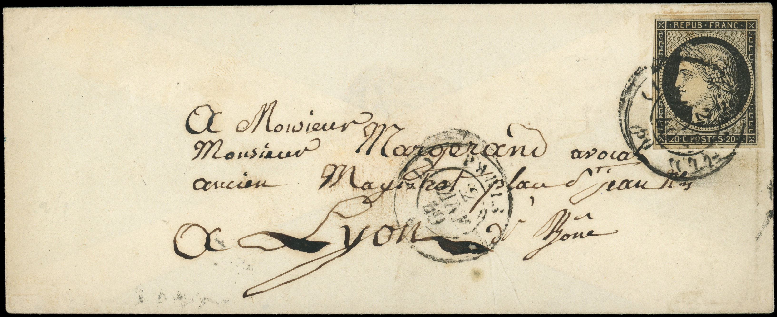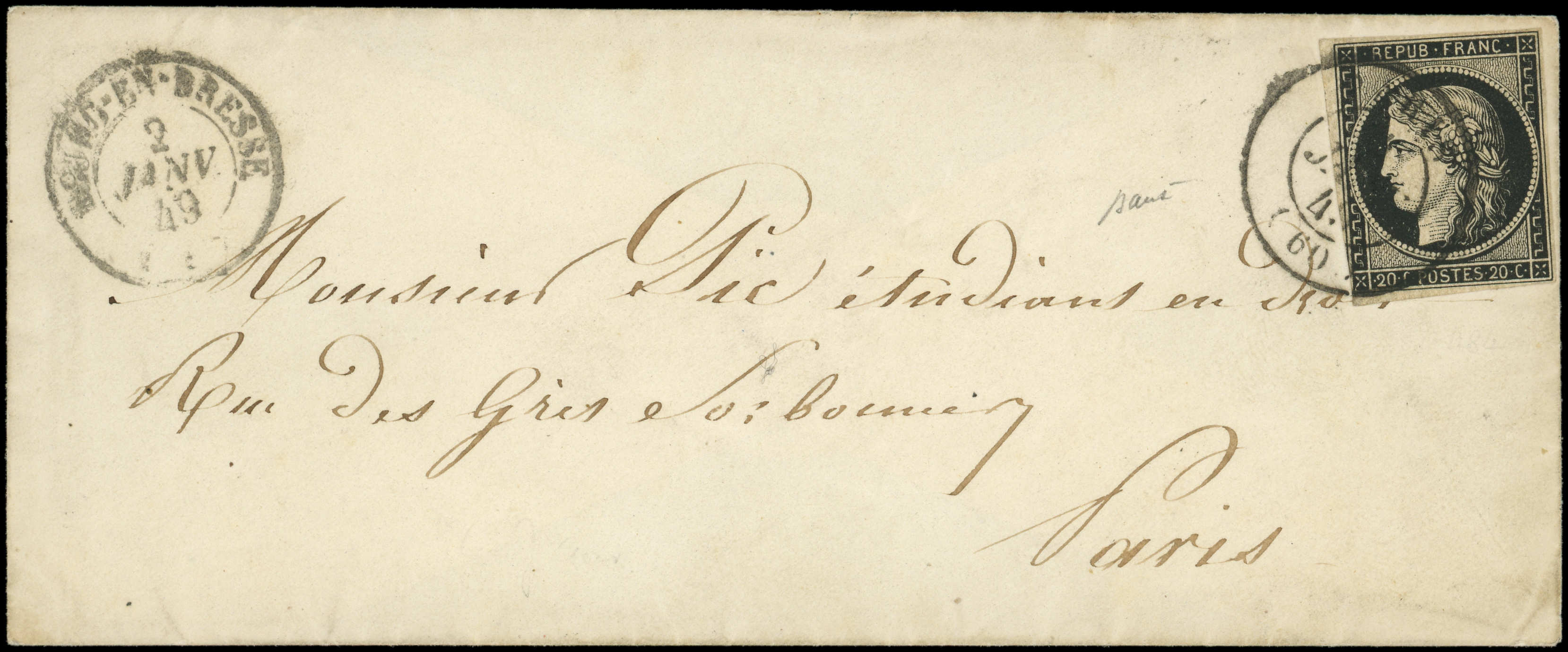 jaune, obl. càd (L) PARIS (L) 2 JANV 49 répété à côté s. Env., arr. LYON 4 JANV, pièce non répertoriée dans l'ouvrage de l'AMVD, TB (Image)