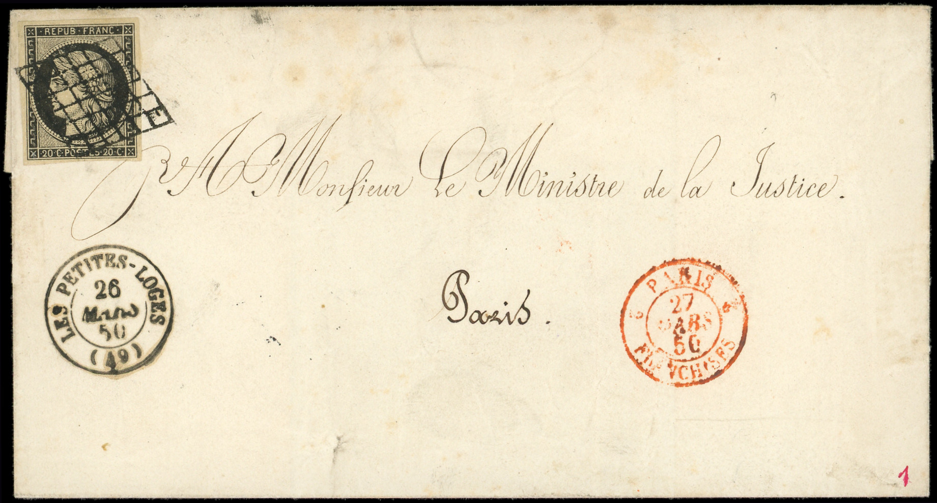 jaune, obl. GRILLE s. LSC, càd T15 LES PETITES LOGES 26/3/50, adressée au Ministre de la Justice, càd rouge PARIS FRANCHISES 27/3, Superbe (Image)