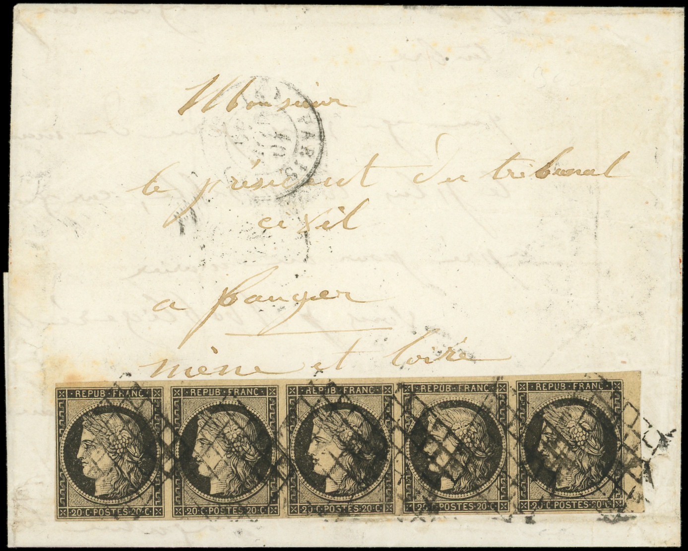 jaune, BANDE de 5 obl. GRILLE s. LAC, càd PARIS 10/11/49 pour BAUGER Maine et Loire, mal orthographié au lieu de BAUGE et donc erreur d'acheminement, arr. FOUGERES 11/11, intéressant et TTB (Image)