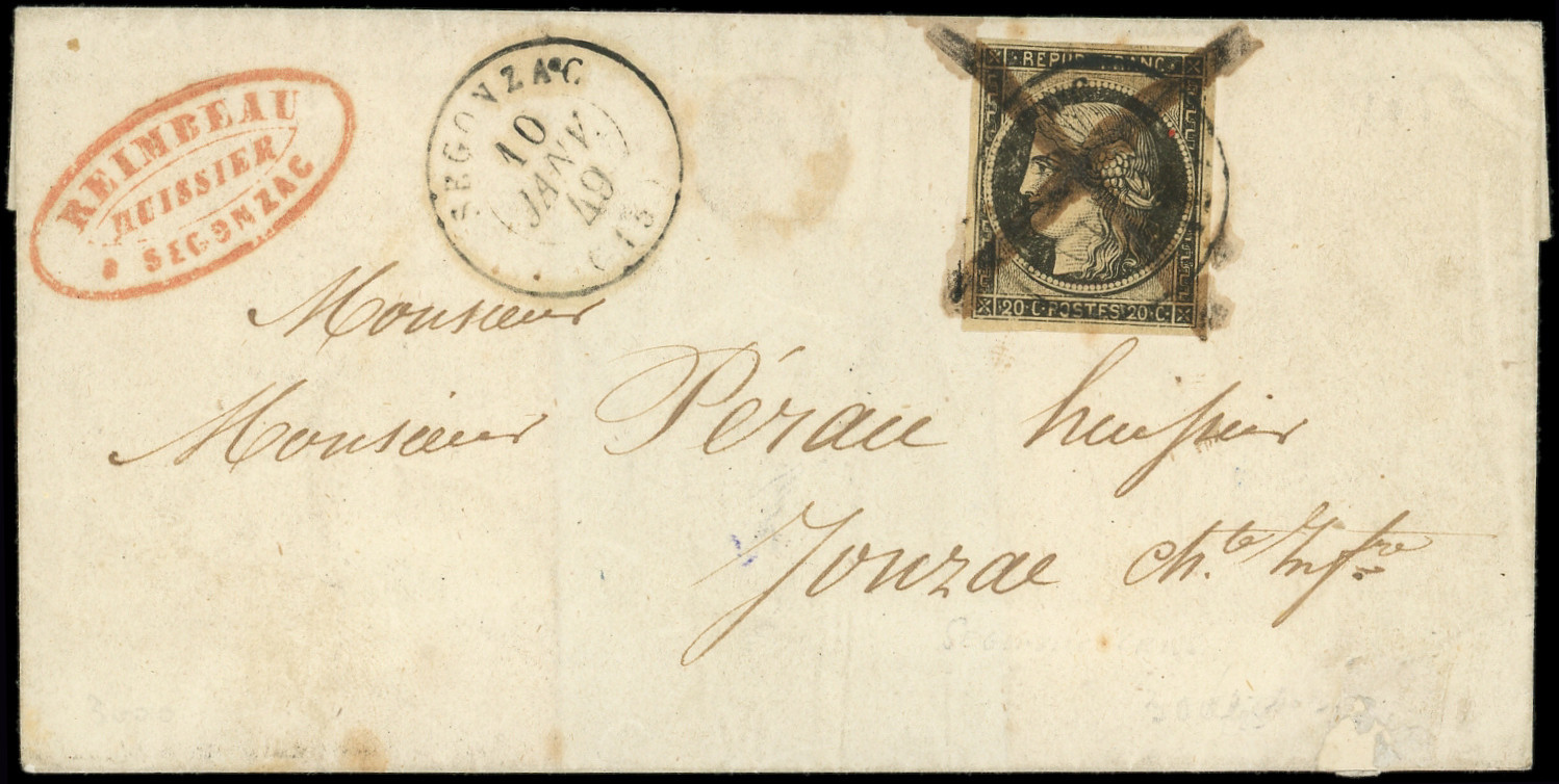 jaune, obl. càd T15 SEGONZAC 10 JANV 49 et PLUME s. LSC, arr. càd T14 JONZAC 11 JANV, TTB (Image) (Image2)